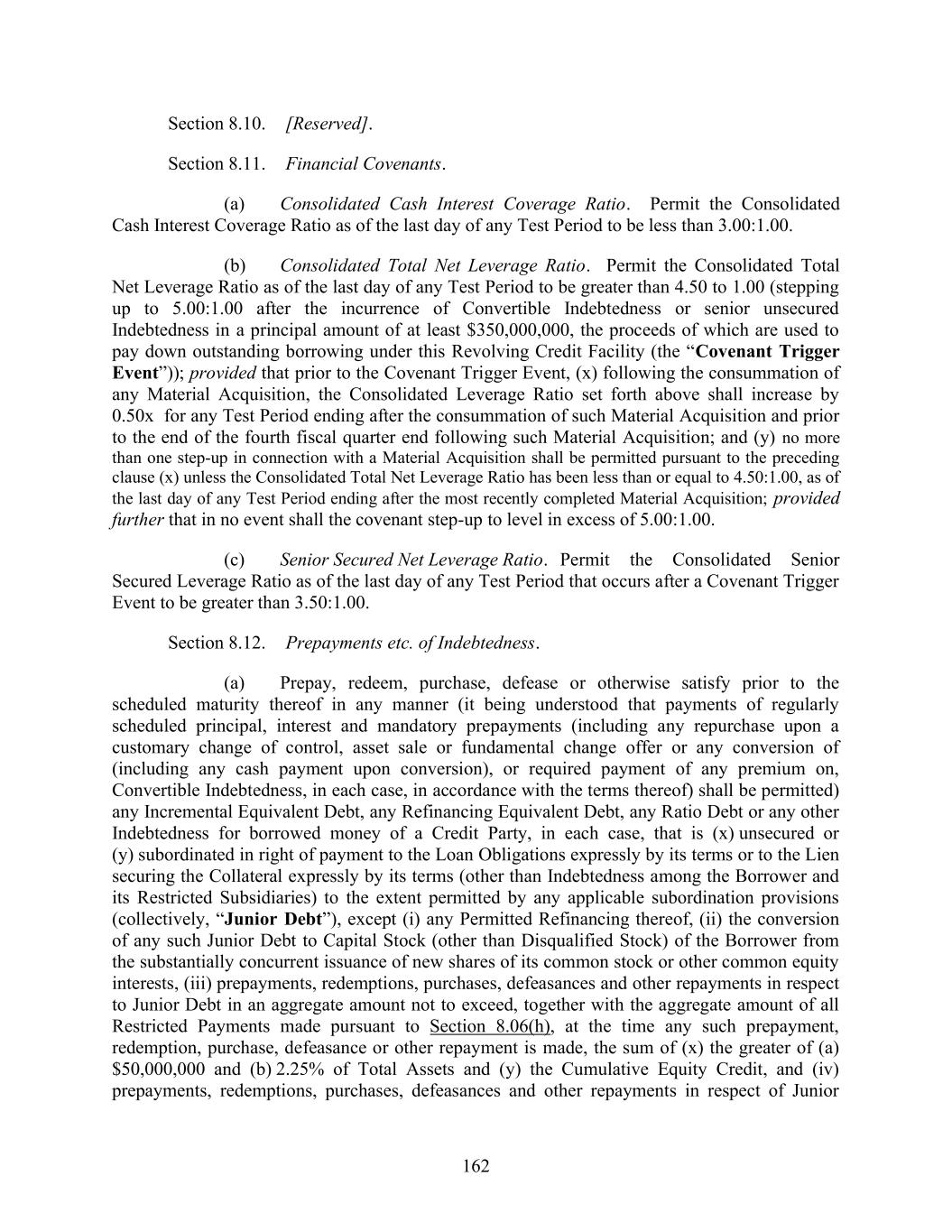 162 Section 8.10. [Reserved]. Section 8.11. Financial Covenants. (a) Consolidated Cash Interest Coverage Ratio. Permit the Consolidated Cash Interest Coverage Ratio as of the last day of any Test Period to be less than 3.00:1.00. (b) Consolidated Total Net Leverage Ratio. Permit the Consolidated Total Net Leverage Ratio as of the last day of any Test Period to be greater than 4.50 to 1.00 (stepping up to 5.00:1.00 after the incurrence of Convertible Indebtedness or senior unsecured Indebtedness in a principal amount of at least $350,000,000, the proceeds of which are used to pay down outstanding borrowing under this Revolving Credit Facility (the “Covenant Trigger Event”)); provided that prior to the Covenant Trigger Event, (x) following the consummation of any Material Acquisition, the Consolidated Leverage Ratio set forth above shall increase by 0.50x for any Test Period ending after the consummation of such Material Acquisition and prior to the end of the fourth fiscal quarter end following such Material Acquisition; and (y) no more than one step-up in connection with a Material Acquisition shall be permitted pursuant to the preceding clause (x) unless the Consolidated Total Net Leverage Ratio has been less than or equal to 4.50:1.00, as of the last day of any Test Period ending after the most recently completed Material Acquisition; provided further that in no event shall the covenant step-up to level in excess of 5.00:1.00. (c) Senior Secured Net Leverage Ratio. Permit the Consolidated Senior Secured Leverage Ratio as of the last day of any Test Period that occurs after a Covenant Trigger Event to be greater than 3.50:1.00. Section 8.12. Prepayments etc. of Indebtedness. (a) Prepay, redeem, purchase, defease or otherwise satisfy prior to the scheduled maturity thereof in any manner (it being understood that payments of regularly scheduled principal, interest and mandatory prepayments (including any repurchase upon a customary change of control, asset sale or fundamental change offer or any conversion of (including any cash payment upon conversion), or required payment of any premium on, Convertible Indebtedness, in each case, in accordance with the terms thereof) shall be permitted) any Incremental Equivalent Debt, any Refinancing Equivalent Debt, any Ratio Debt or any other Indebtedness for borrowed money of a Credit Party, in each case, that is (x) unsecured or (y) subordinated in right of payment to the Loan Obligations expressly by its terms or to the Lien securing the Collateral expressly by its terms (other than Indebtedness among the Borrower and its Restricted Subsidiaries) to the extent permitted by any applicable subordination provisions (collectively, “Junior Debt”), except (i) any Permitted Refinancing thereof, (ii) the conversion of any such Junior Debt to Capital Stock (other than Disqualified Stock) of the Borrower from the substantially concurrent issuance of new shares of its common stock or other common equity interests, (iii) prepayments, redemptions, purchases, defeasances and other repayments in respect to Junior Debt in an aggregate amount not to exceed, together with the aggregate amount of all Restricted Payments made pursuant to Section 8.06(h), at the time any such prepayment, redemption, purchase, defeasance or other repayment is made, the sum of (x) the greater of (a) $50,000,000 and (b) 2.25% of Total Assets and (y) the Cumulative Equity Credit, and (iv) prepayments, redemptions, purchases, defeasances and other repayments in respect of Junior
