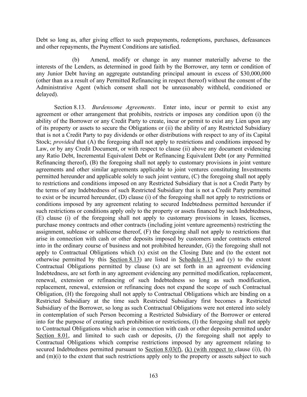 163 Debt so long as, after giving effect to such prepayments, redemptions, purchases, defeasances and other repayments, the Payment Conditions are satisfied. (b) Amend, modify or change in any manner materially adverse to the interests of the Lenders, as determined in good faith by the Borrower, any term or condition of any Junior Debt having an aggregate outstanding principal amount in excess of $30,000,000 (other than as a result of any Permitted Refinancing in respect thereof) without the consent of the Administrative Agent (which consent shall not be unreasonably withheld, conditioned or delayed). Section 8.13. Burdensome Agreements. Enter into, incur or permit to exist any agreement or other arrangement that prohibits, restricts or imposes any condition upon (i) the ability of the Borrower or any Credit Party to create, incur or permit to exist any Lien upon any of its property or assets to secure the Obligations or (ii) the ability of any Restricted Subsidiary that is not a Credit Party to pay dividends or other distributions with respect to any of its Capital Stock; provided that (A) the foregoing shall not apply to restrictions and conditions imposed by Law, or by any Credit Document, or with respect to clause (ii) above any document evidencing any Ratio Debt, Incremental Equivalent Debt or Refinancing Equivalent Debt (or any Permitted Refinancing thereof), (B) the foregoing shall not apply to customary provisions in joint venture agreements and other similar agreements applicable to joint ventures constituting Investments permitted hereunder and applicable solely to such joint venture, (C) the foregoing shall not apply to restrictions and conditions imposed on any Restricted Subsidiary that is not a Credit Party by the terms of any Indebtedness of such Restricted Subsidiary that is not a Credit Party permitted to exist or be incurred hereunder, (D) clause (i) of the foregoing shall not apply to restrictions or conditions imposed by any agreement relating to secured Indebtedness permitted hereunder if such restrictions or conditions apply only to the property or assets financed by such Indebtedness, (E) clause (i) of the foregoing shall not apply to customary provisions in leases, licenses, purchase money contracts and other contracts (including joint venture agreements) restricting the assignment, sublease or sublicense thereof, (F) the foregoing shall not apply to restrictions that arise in connection with cash or other deposits imposed by customers under contracts entered into in the ordinary course of business and not prohibited hereunder, (G) the foregoing shall not apply to Contractual Obligations which (x) exist on the Closing Date and (to the extent not otherwise permitted by this Section 8.13) are listed in Schedule 8.13 and (y) to the extent Contractual Obligations permitted by clause (x) are set forth in an agreement evidencing Indebtedness, are set forth in any agreement evidencing any permitted modification, replacement, renewal, extension or refinancing of such Indebtedness so long as such modification, replacement, renewal, extension or refinancing does not expand the scope of such Contractual Obligation, (H) the foregoing shall not apply to Contractual Obligations which are binding on a Restricted Subsidiary at the time such Restricted Subsidiary first becomes a Restricted Subsidiary of the Borrower, so long as such Contractual Obligations were not entered into solely in contemplation of such Person becoming a Restricted Subsidiary of the Borrower or entered into for the purpose of creating such prohibition or restrictions, (I) the foregoing shall not apply to Contractual Obligations which arise in connection with cash or other deposits permitted under Section 8.01, and limited to such cash or deposits, (J) the foregoing shall not apply to Contractual Obligations which comprise restrictions imposed by any agreement relating to secured Indebtedness permitted pursuant to Section 8.03(f), (k) (with respect to clause (i)), (h) and (m)(i) to the extent that such restrictions apply only to the property or assets subject to such