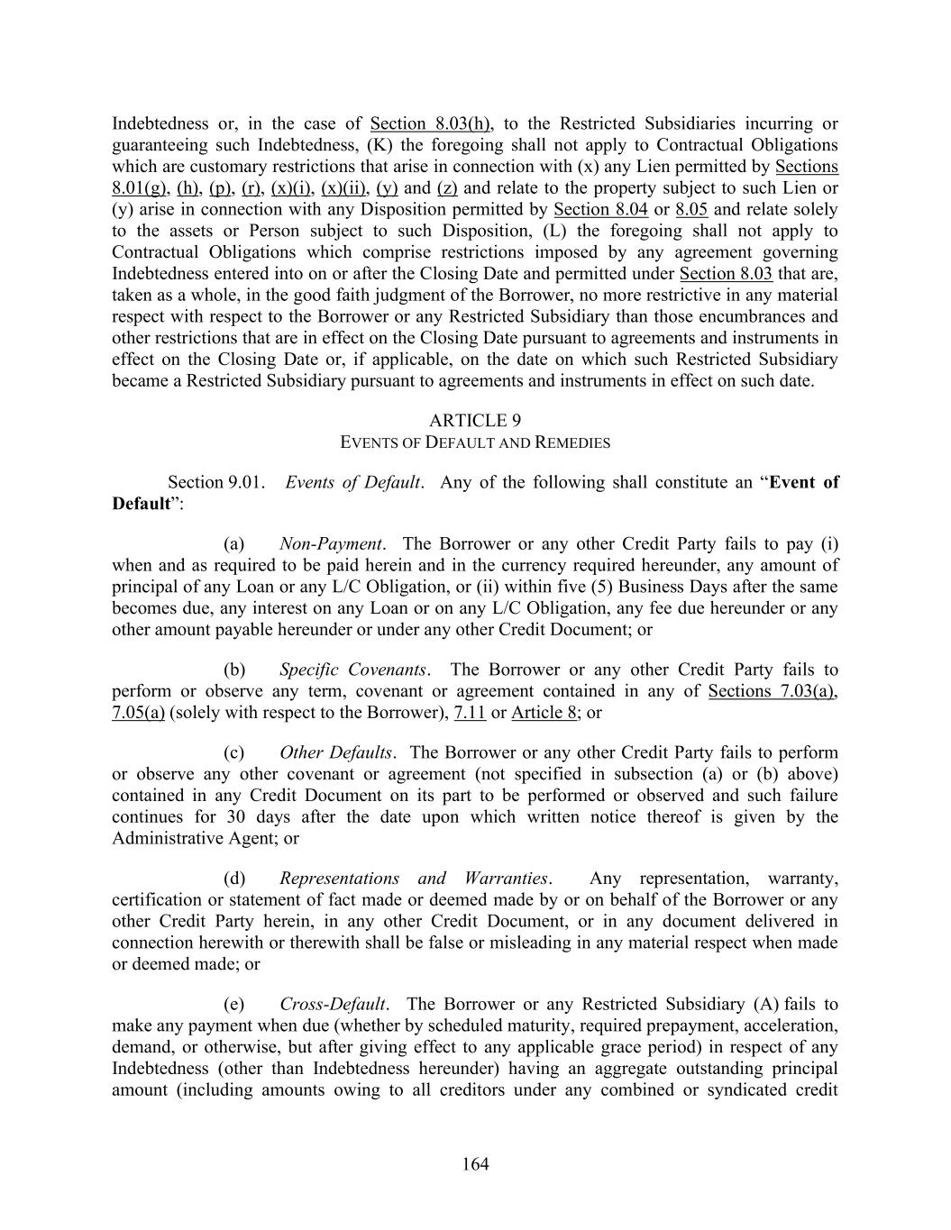 164 Indebtedness or, in the case of Section 8.03(h), to the Restricted Subsidiaries incurring or guaranteeing such Indebtedness, (K) the foregoing shall not apply to Contractual Obligations which are customary restrictions that arise in connection with (x) any Lien permitted by Sections 8.01(g), (h), (p), (r), (x)(i), (x)(ii), (y) and (z) and relate to the property subject to such Lien or (y) arise in connection with any Disposition permitted by Section 8.04 or 8.05 and relate solely to the assets or Person subject to such Disposition, (L) the foregoing shall not apply to Contractual Obligations which comprise restrictions imposed by any agreement governing Indebtedness entered into on or after the Closing Date and permitted under Section 8.03 that are, taken as a whole, in the good faith judgment of the Borrower, no more restrictive in any material respect with respect to the Borrower or any Restricted Subsidiary than those encumbrances and other restrictions that are in effect on the Closing Date pursuant to agreements and instruments in effect on the Closing Date or, if applicable, on the date on which such Restricted Subsidiary became a Restricted Subsidiary pursuant to agreements and instruments in effect on such date. ARTICLE 9 EVENTS OF DEFAULT AND REMEDIES Section 9.01. Events of Default. Any of the following shall constitute an “Event of Default”: (a) Non-Payment. The Borrower or any other Credit Party fails to pay (i) when and as required to be paid herein and in the currency required hereunder, any amount of principal of any Loan or any L/C Obligation, or (ii) within five (5) Business Days after the same becomes due, any interest on any Loan or on any L/C Obligation, any fee due hereunder or any other amount payable hereunder or under any other Credit Document; or (b) Specific Covenants. The Borrower or any other Credit Party fails to perform or observe any term, covenant or agreement contained in any of Sections 7.03(a), 7.05(a) (solely with respect to the Borrower), 7.11 or Article 8; or (c) Other Defaults. The Borrower or any other Credit Party fails to perform or observe any other covenant or agreement (not specified in subsection (a) or (b) above) contained in any Credit Document on its part to be performed or observed and such failure continues for 30 days after the date upon which written notice thereof is given by the Administrative Agent; or (d) Representations and Warranties. Any representation, warranty, certification or statement of fact made or deemed made by or on behalf of the Borrower or any other Credit Party herein, in any other Credit Document, or in any document delivered in connection herewith or therewith shall be false or misleading in any material respect when made or deemed made; or (e) Cross-Default. The Borrower or any Restricted Subsidiary (A) fails to make any payment when due (whether by scheduled maturity, required prepayment, acceleration, demand, or otherwise, but after giving effect to any applicable grace period) in respect of any Indebtedness (other than Indebtedness hereunder) having an aggregate outstanding principal amount (including amounts owing to all creditors under any combined or syndicated credit