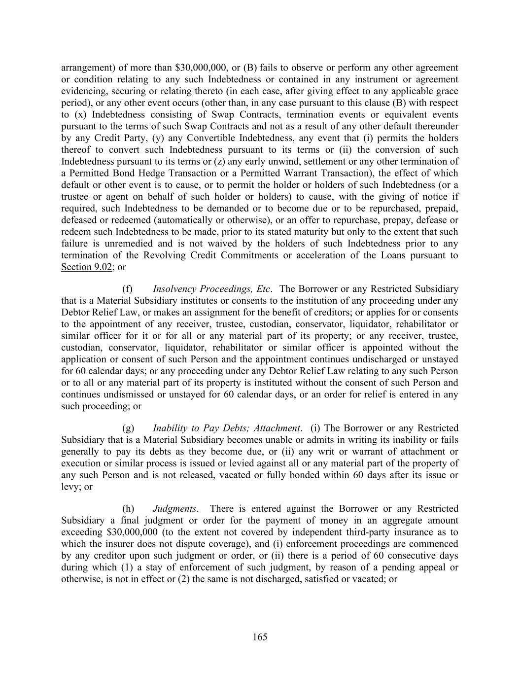 165 arrangement) of more than $30,000,000, or (B) fails to observe or perform any other agreement or condition relating to any such Indebtedness or contained in any instrument or agreement evidencing, securing or relating thereto (in each case, after giving effect to any applicable grace period), or any other event occurs (other than, in any case pursuant to this clause (B) with respect to (x) Indebtedness consisting of Swap Contracts, termination events or equivalent events pursuant to the terms of such Swap Contracts and not as a result of any other default thereunder by any Credit Party, (y) any Convertible Indebtedness, any event that (i) permits the holders thereof to convert such Indebtedness pursuant to its terms or (ii) the conversion of such Indebtedness pursuant to its terms or (z) any early unwind, settlement or any other termination of a Permitted Bond Hedge Transaction or a Permitted Warrant Transaction), the effect of which default or other event is to cause, or to permit the holder or holders of such Indebtedness (or a trustee or agent on behalf of such holder or holders) to cause, with the giving of notice if required, such Indebtedness to be demanded or to become due or to be repurchased, prepaid, defeased or redeemed (automatically or otherwise), or an offer to repurchase, prepay, defease or redeem such Indebtedness to be made, prior to its stated maturity but only to the extent that such failure is unremedied and is not waived by the holders of such Indebtedness prior to any termination of the Revolving Credit Commitments or acceleration of the Loans pursuant to Section 9.02; or (f) Insolvency Proceedings, Etc. The Borrower or any Restricted Subsidiary that is a Material Subsidiary institutes or consents to the institution of any proceeding under any Debtor Relief Law, or makes an assignment for the benefit of creditors; or applies for or consents to the appointment of any receiver, trustee, custodian, conservator, liquidator, rehabilitator or similar officer for it or for all or any material part of its property; or any receiver, trustee, custodian, conservator, liquidator, rehabilitator or similar officer is appointed without the application or consent of such Person and the appointment continues undischarged or unstayed for 60 calendar days; or any proceeding under any Debtor Relief Law relating to any such Person or to all or any material part of its property is instituted without the consent of such Person and continues undismissed or unstayed for 60 calendar days, or an order for relief is entered in any such proceeding; or (g) Inability to Pay Debts; Attachment. (i) The Borrower or any Restricted Subsidiary that is a Material Subsidiary becomes unable or admits in writing its inability or fails generally to pay its debts as they become due, or (ii) any writ or warrant of attachment or execution or similar process is issued or levied against all or any material part of the property of any such Person and is not released, vacated or fully bonded within 60 days after its issue or levy; or (h) Judgments. There is entered against the Borrower or any Restricted Subsidiary a final judgment or order for the payment of money in an aggregate amount exceeding $30,000,000 (to the extent not covered by independent third-party insurance as to which the insurer does not dispute coverage), and (i) enforcement proceedings are commenced by any creditor upon such judgment or order, or (ii) there is a period of 60 consecutive days during which (1) a stay of enforcement of such judgment, by reason of a pending appeal or otherwise, is not in effect or (2) the same is not discharged, satisfied or vacated; or