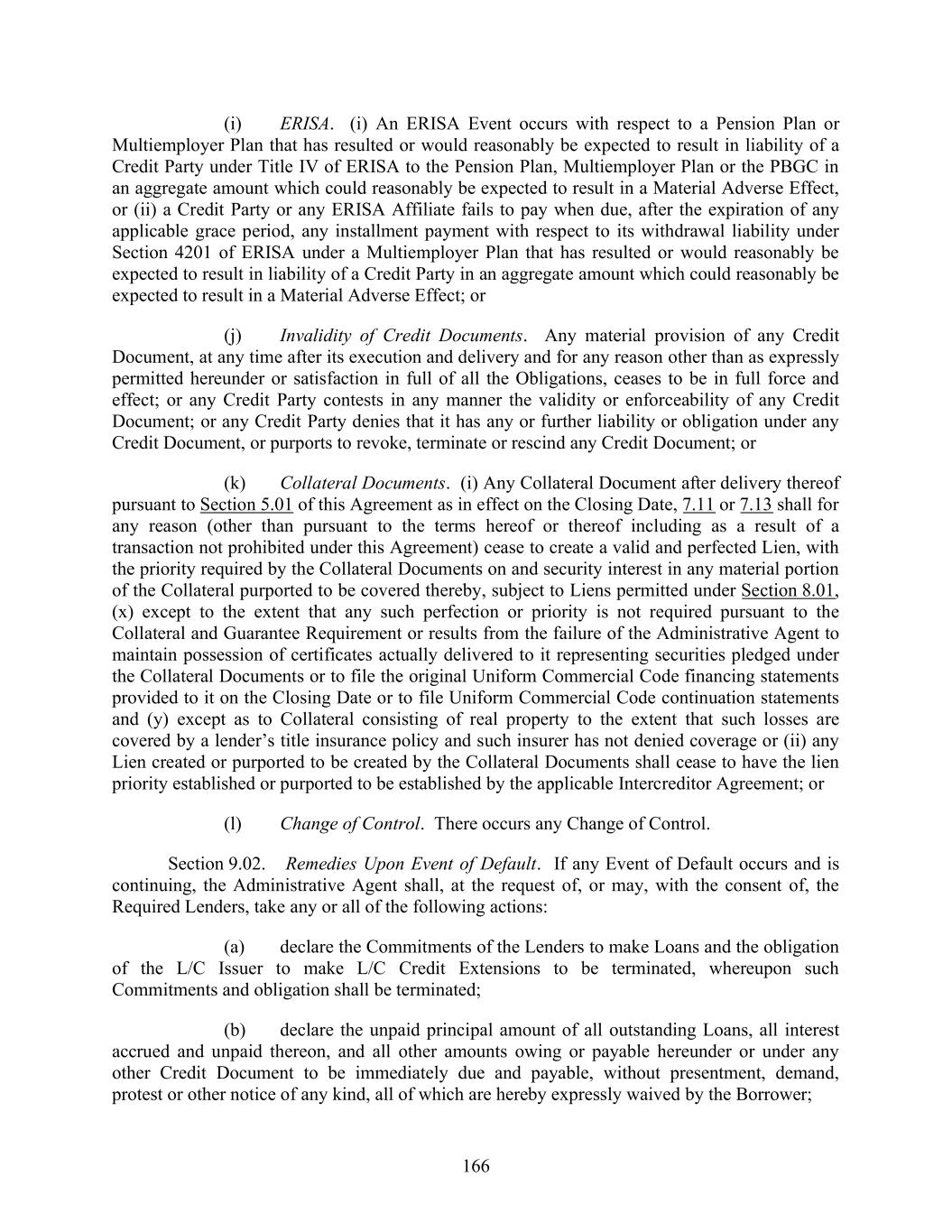 166 (i) ERISA. (i) An ERISA Event occurs with respect to a Pension Plan or Multiemployer Plan that has resulted or would reasonably be expected to result in liability of a Credit Party under Title IV of ERISA to the Pension Plan, Multiemployer Plan or the PBGC in an aggregate amount which could reasonably be expected to result in a Material Adverse Effect, or (ii) a Credit Party or any ERISA Affiliate fails to pay when due, after the expiration of any applicable grace period, any installment payment with respect to its withdrawal liability under Section 4201 of ERISA under a Multiemployer Plan that has resulted or would reasonably be expected to result in liability of a Credit Party in an aggregate amount which could reasonably be expected to result in a Material Adverse Effect; or (j) Invalidity of Credit Documents. Any material provision of any Credit Document, at any time after its execution and delivery and for any reason other than as expressly permitted hereunder or satisfaction in full of all the Obligations, ceases to be in full force and effect; or any Credit Party contests in any manner the validity or enforceability of any Credit Document; or any Credit Party denies that it has any or further liability or obligation under any Credit Document, or purports to revoke, terminate or rescind any Credit Document; or (k) Collateral Documents. (i) Any Collateral Document after delivery thereof pursuant to Section 5.01 of this Agreement as in effect on the Closing Date, 7.11 or 7.13 shall for any reason (other than pursuant to the terms hereof or thereof including as a result of a transaction not prohibited under this Agreement) cease to create a valid and perfected Lien, with the priority required by the Collateral Documents on and security interest in any material portion of the Collateral purported to be covered thereby, subject to Liens permitted under Section 8.01, (x) except to the extent that any such perfection or priority is not required pursuant to the Collateral and Guarantee Requirement or results from the failure of the Administrative Agent to maintain possession of certificates actually delivered to it representing securities pledged under the Collateral Documents or to file the original Uniform Commercial Code financing statements provided to it on the Closing Date or to file Uniform Commercial Code continuation statements and (y) except as to Collateral consisting of real property to the extent that such losses are covered by a lender’s title insurance policy and such insurer has not denied coverage or (ii) any Lien created or purported to be created by the Collateral Documents shall cease to have the lien priority established or purported to be established by the applicable Intercreditor Agreement; or (l) Change of Control. There occurs any Change of Control. Section 9.02. Remedies Upon Event of Default. If any Event of Default occurs and is continuing, the Administrative Agent shall, at the request of, or may, with the consent of, the Required Lenders, take any or all of the following actions: (a) declare the Commitments of the Lenders to make Loans and the obligation of the L/C Issuer to make L/C Credit Extensions to be terminated, whereupon such Commitments and obligation shall be terminated; (b) declare the unpaid principal amount of all outstanding Loans, all interest accrued and unpaid thereon, and all other amounts owing or payable hereunder or under any other Credit Document to be immediately due and payable, without presentment, demand, protest or other notice of any kind, all of which are hereby expressly waived by the Borrower;