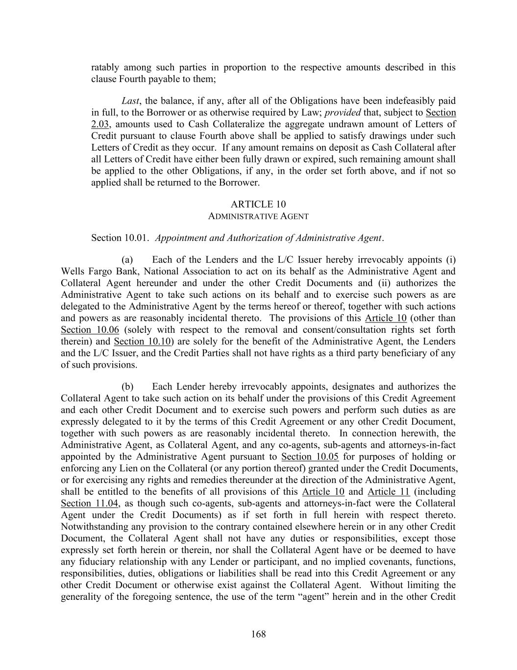 168 ratably among such parties in proportion to the respective amounts described in this clause Fourth payable to them; Last, the balance, if any, after all of the Obligations have been indefeasibly paid in full, to the Borrower or as otherwise required by Law; provided that, subject to Section 2.03, amounts used to Cash Collateralize the aggregate undrawn amount of Letters of Credit pursuant to clause Fourth above shall be applied to satisfy drawings under such Letters of Credit as they occur. If any amount remains on deposit as Cash Collateral after all Letters of Credit have either been fully drawn or expired, such remaining amount shall be applied to the other Obligations, if any, in the order set forth above, and if not so applied shall be returned to the Borrower. ARTICLE 10 ADMINISTRATIVE AGENT Section 10.01. Appointment and Authorization of Administrative Agent. (a) Each of the Lenders and the L/C Issuer hereby irrevocably appoints (i) Wells Fargo Bank, National Association to act on its behalf as the Administrative Agent and Collateral Agent hereunder and under the other Credit Documents and (ii) authorizes the Administrative Agent to take such actions on its behalf and to exercise such powers as are delegated to the Administrative Agent by the terms hereof or thereof, together with such actions and powers as are reasonably incidental thereto. The provisions of this Article 10 (other than Section 10.06 (solely with respect to the removal and consent/consultation rights set forth therein) and Section 10.10) are solely for the benefit of the Administrative Agent, the Lenders and the L/C Issuer, and the Credit Parties shall not have rights as a third party beneficiary of any of such provisions. (b) Each Lender hereby irrevocably appoints, designates and authorizes the Collateral Agent to take such action on its behalf under the provisions of this Credit Agreement and each other Credit Document and to exercise such powers and perform such duties as are expressly delegated to it by the terms of this Credit Agreement or any other Credit Document, together with such powers as are reasonably incidental thereto. In connection herewith, the Administrative Agent, as Collateral Agent, and any co-agents, sub-agents and attorneys-in-fact appointed by the Administrative Agent pursuant to Section 10.05 for purposes of holding or enforcing any Lien on the Collateral (or any portion thereof) granted under the Credit Documents, or for exercising any rights and remedies thereunder at the direction of the Administrative Agent, shall be entitled to the benefits of all provisions of this Article 10 and Article 11 (including Section 11.04, as though such co-agents, sub-agents and attorneys-in-fact were the Collateral Agent under the Credit Documents) as if set forth in full herein with respect thereto. Notwithstanding any provision to the contrary contained elsewhere herein or in any other Credit Document, the Collateral Agent shall not have any duties or responsibilities, except those expressly set forth herein or therein, nor shall the Collateral Agent have or be deemed to have any fiduciary relationship with any Lender or participant, and no implied covenants, functions, responsibilities, duties, obligations or liabilities shall be read into this Credit Agreement or any other Credit Document or otherwise exist against the Collateral Agent. Without limiting the generality of the foregoing sentence, the use of the term “agent” herein and in the other Credit