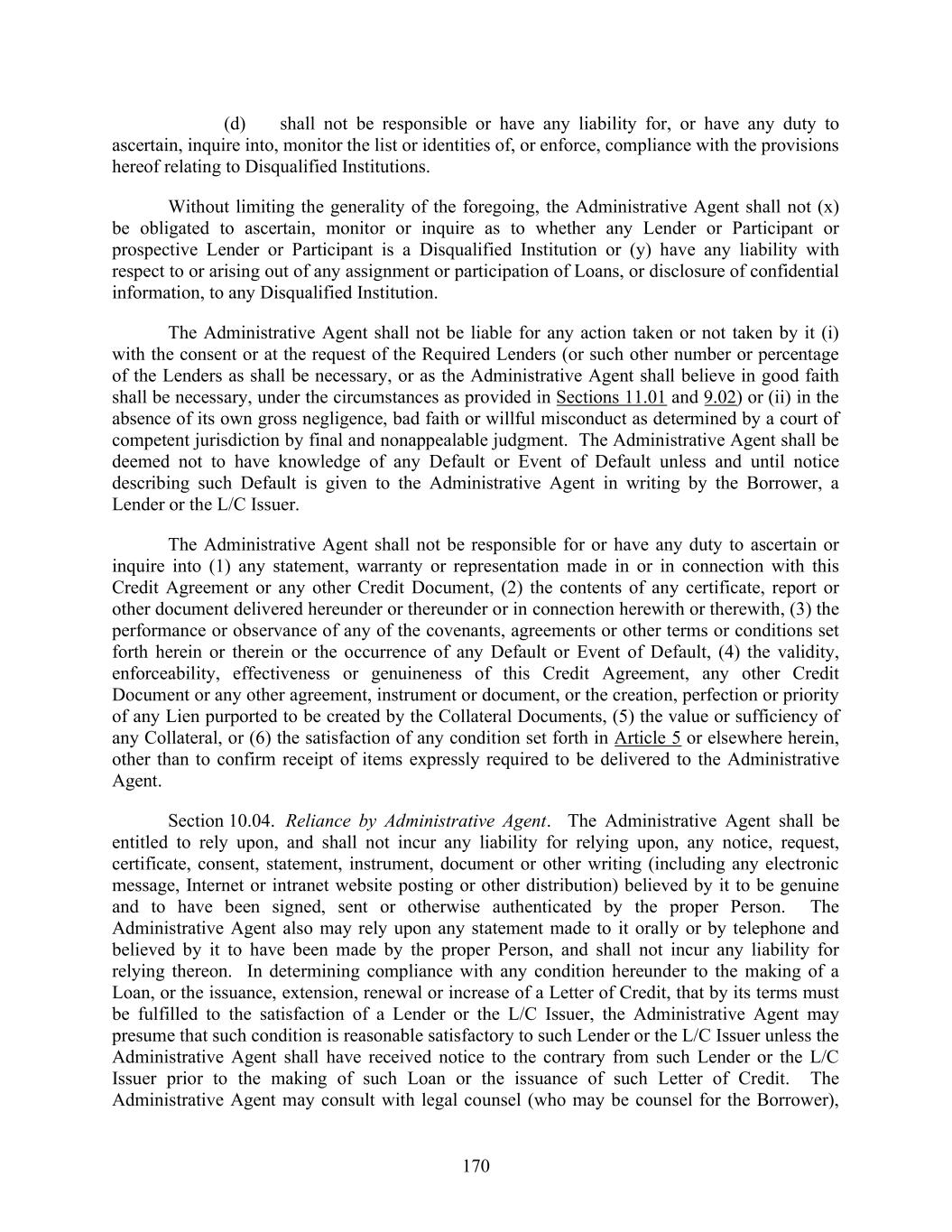 170 (d) shall not be responsible or have any liability for, or have any duty to ascertain, inquire into, monitor the list or identities of, or enforce, compliance with the provisions hereof relating to Disqualified Institutions. Without limiting the generality of the foregoing, the Administrative Agent shall not (x) be obligated to ascertain, monitor or inquire as to whether any Lender or Participant or prospective Lender or Participant is a Disqualified Institution or (y) have any liability with respect to or arising out of any assignment or participation of Loans, or disclosure of confidential information, to any Disqualified Institution. The Administrative Agent shall not be liable for any action taken or not taken by it (i) with the consent or at the request of the Required Lenders (or such other number or percentage of the Lenders as shall be necessary, or as the Administrative Agent shall believe in good faith shall be necessary, under the circumstances as provided in Sections 11.01 and 9.02) or (ii) in the absence of its own gross negligence, bad faith or willful misconduct as determined by a court of competent jurisdiction by final and nonappealable judgment. The Administrative Agent shall be deemed not to have knowledge of any Default or Event of Default unless and until notice describing such Default is given to the Administrative Agent in writing by the Borrower, a Lender or the L/C Issuer. The Administrative Agent shall not be responsible for or have any duty to ascertain or inquire into (1) any statement, warranty or representation made in or in connection with this Credit Agreement or any other Credit Document, (2) the contents of any certificate, report or other document delivered hereunder or thereunder or in connection herewith or therewith, (3) the performance or observance of any of the covenants, agreements or other terms or conditions set forth herein or therein or the occurrence of any Default or Event of Default, (4) the validity, enforceability, effectiveness or genuineness of this Credit Agreement, any other Credit Document or any other agreement, instrument or document, or the creation, perfection or priority of any Lien purported to be created by the Collateral Documents, (5) the value or sufficiency of any Collateral, or (6) the satisfaction of any condition set forth in Article 5 or elsewhere herein, other than to confirm receipt of items expressly required to be delivered to the Administrative Agent. Section 10.04. Reliance by Administrative Agent. The Administrative Agent shall be entitled to rely upon, and shall not incur any liability for relying upon, any notice, request, certificate, consent, statement, instrument, document or other writing (including any electronic message, Internet or intranet website posting or other distribution) believed by it to be genuine and to have been signed, sent or otherwise authenticated by the proper Person. The Administrative Agent also may rely upon any statement made to it orally or by telephone and believed by it to have been made by the proper Person, and shall not incur any liability for relying thereon. In determining compliance with any condition hereunder to the making of a Loan, or the issuance, extension, renewal or increase of a Letter of Credit, that by its terms must be fulfilled to the satisfaction of a Lender or the L/C Issuer, the Administrative Agent may presume that such condition is reasonable satisfactory to such Lender or the L/C Issuer unless the Administrative Agent shall have received notice to the contrary from such Lender or the L/C Issuer prior to the making of such Loan or the issuance of such Letter of Credit. The Administrative Agent may consult with legal counsel (who may be counsel for the Borrower),