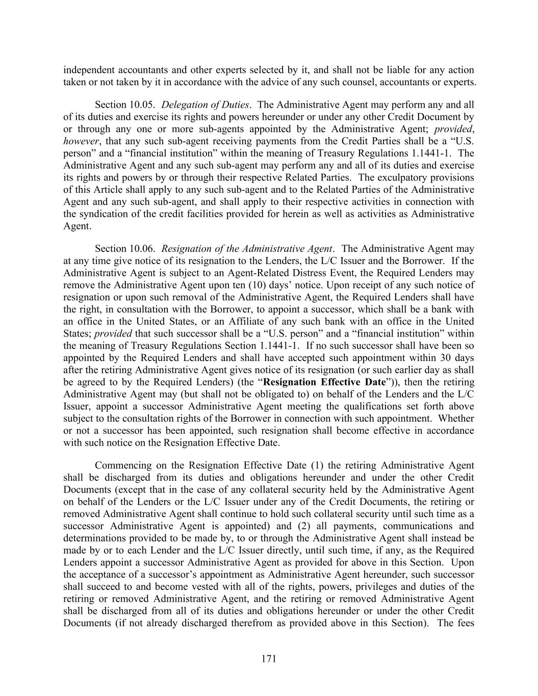 171 independent accountants and other experts selected by it, and shall not be liable for any action taken or not taken by it in accordance with the advice of any such counsel, accountants or experts. Section 10.05. Delegation of Duties. The Administrative Agent may perform any and all of its duties and exercise its rights and powers hereunder or under any other Credit Document by or through any one or more sub-agents appointed by the Administrative Agent; provided, however, that any such sub-agent receiving payments from the Credit Parties shall be a “U.S. person” and a “financial institution” within the meaning of Treasury Regulations 1.1441-1. The Administrative Agent and any such sub-agent may perform any and all of its duties and exercise its rights and powers by or through their respective Related Parties. The exculpatory provisions of this Article shall apply to any such sub-agent and to the Related Parties of the Administrative Agent and any such sub-agent, and shall apply to their respective activities in connection with the syndication of the credit facilities provided for herein as well as activities as Administrative Agent. Section 10.06. Resignation of the Administrative Agent. The Administrative Agent may at any time give notice of its resignation to the Lenders, the L/C Issuer and the Borrower. If the Administrative Agent is subject to an Agent-Related Distress Event, the Required Lenders may remove the Administrative Agent upon ten (10) days’ notice. Upon receipt of any such notice of resignation or upon such removal of the Administrative Agent, the Required Lenders shall have the right, in consultation with the Borrower, to appoint a successor, which shall be a bank with an office in the United States, or an Affiliate of any such bank with an office in the United States; provided that such successor shall be a “U.S. person” and a “financial institution” within the meaning of Treasury Regulations Section 1.1441-1. If no such successor shall have been so appointed by the Required Lenders and shall have accepted such appointment within 30 days after the retiring Administrative Agent gives notice of its resignation (or such earlier day as shall be agreed to by the Required Lenders) (the “Resignation Effective Date”)), then the retiring Administrative Agent may (but shall not be obligated to) on behalf of the Lenders and the L/C Issuer, appoint a successor Administrative Agent meeting the qualifications set forth above subject to the consultation rights of the Borrower in connection with such appointment. Whether or not a successor has been appointed, such resignation shall become effective in accordance with such notice on the Resignation Effective Date. Commencing on the Resignation Effective Date (1) the retiring Administrative Agent shall be discharged from its duties and obligations hereunder and under the other Credit Documents (except that in the case of any collateral security held by the Administrative Agent on behalf of the Lenders or the L/C Issuer under any of the Credit Documents, the retiring or removed Administrative Agent shall continue to hold such collateral security until such time as a successor Administrative Agent is appointed) and (2) all payments, communications and determinations provided to be made by, to or through the Administrative Agent shall instead be made by or to each Lender and the L/C Issuer directly, until such time, if any, as the Required Lenders appoint a successor Administrative Agent as provided for above in this Section. Upon the acceptance of a successor’s appointment as Administrative Agent hereunder, such successor shall succeed to and become vested with all of the rights, powers, privileges and duties of the retiring or removed Administrative Agent, and the retiring or removed Administrative Agent shall be discharged from all of its duties and obligations hereunder or under the other Credit Documents (if not already discharged therefrom as provided above in this Section). The fees
