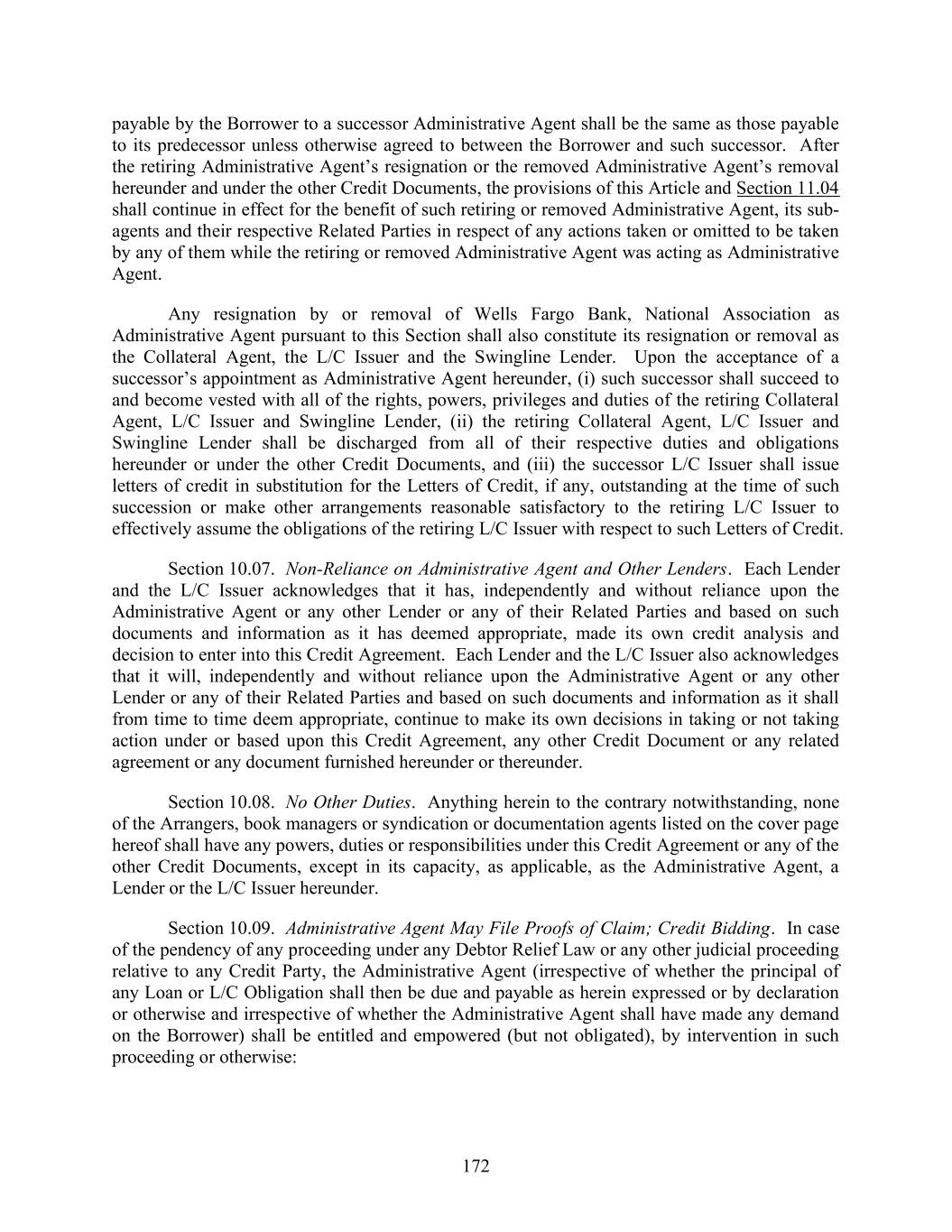 172 payable by the Borrower to a successor Administrative Agent shall be the same as those payable to its predecessor unless otherwise agreed to between the Borrower and such successor. After the retiring Administrative Agent’s resignation or the removed Administrative Agent’s removal hereunder and under the other Credit Documents, the provisions of this Article and Section 11.04 shall continue in effect for the benefit of such retiring or removed Administrative Agent, its sub- agents and their respective Related Parties in respect of any actions taken or omitted to be taken by any of them while the retiring or removed Administrative Agent was acting as Administrative Agent. Any resignation by or removal of Wells Fargo Bank, National Association as Administrative Agent pursuant to this Section shall also constitute its resignation or removal as the Collateral Agent, the L/C Issuer and the Swingline Lender. Upon the acceptance of a successor’s appointment as Administrative Agent hereunder, (i) such successor shall succeed to and become vested with all of the rights, powers, privileges and duties of the retiring Collateral Agent, L/C Issuer and Swingline Lender, (ii) the retiring Collateral Agent, L/C Issuer and Swingline Lender shall be discharged from all of their respective duties and obligations hereunder or under the other Credit Documents, and (iii) the successor L/C Issuer shall issue letters of credit in substitution for the Letters of Credit, if any, outstanding at the time of such succession or make other arrangements reasonable satisfactory to the retiring L/C Issuer to effectively assume the obligations of the retiring L/C Issuer with respect to such Letters of Credit. Section 10.07. Non-Reliance on Administrative Agent and Other Lenders. Each Lender and the L/C Issuer acknowledges that it has, independently and without reliance upon the Administrative Agent or any other Lender or any of their Related Parties and based on such documents and information as it has deemed appropriate, made its own credit analysis and decision to enter into this Credit Agreement. Each Lender and the L/C Issuer also acknowledges that it will, independently and without reliance upon the Administrative Agent or any other Lender or any of their Related Parties and based on such documents and information as it shall from time to time deem appropriate, continue to make its own decisions in taking or not taking action under or based upon this Credit Agreement, any other Credit Document or any related agreement or any document furnished hereunder or thereunder. Section 10.08. No Other Duties. Anything herein to the contrary notwithstanding, none of the Arrangers, book managers or syndication or documentation agents listed on the cover page hereof shall have any powers, duties or responsibilities under this Credit Agreement or any of the other Credit Documents, except in its capacity, as applicable, as the Administrative Agent, a Lender or the L/C Issuer hereunder. Section 10.09. Administrative Agent May File Proofs of Claim; Credit Bidding. In case of the pendency of any proceeding under any Debtor Relief Law or any other judicial proceeding relative to any Credit Party, the Administrative Agent (irrespective of whether the principal of any Loan or L/C Obligation shall then be due and payable as herein expressed or by declaration or otherwise and irrespective of whether the Administrative Agent shall have made any demand on the Borrower) shall be entitled and empowered (but not obligated), by intervention in such proceeding or otherwise: