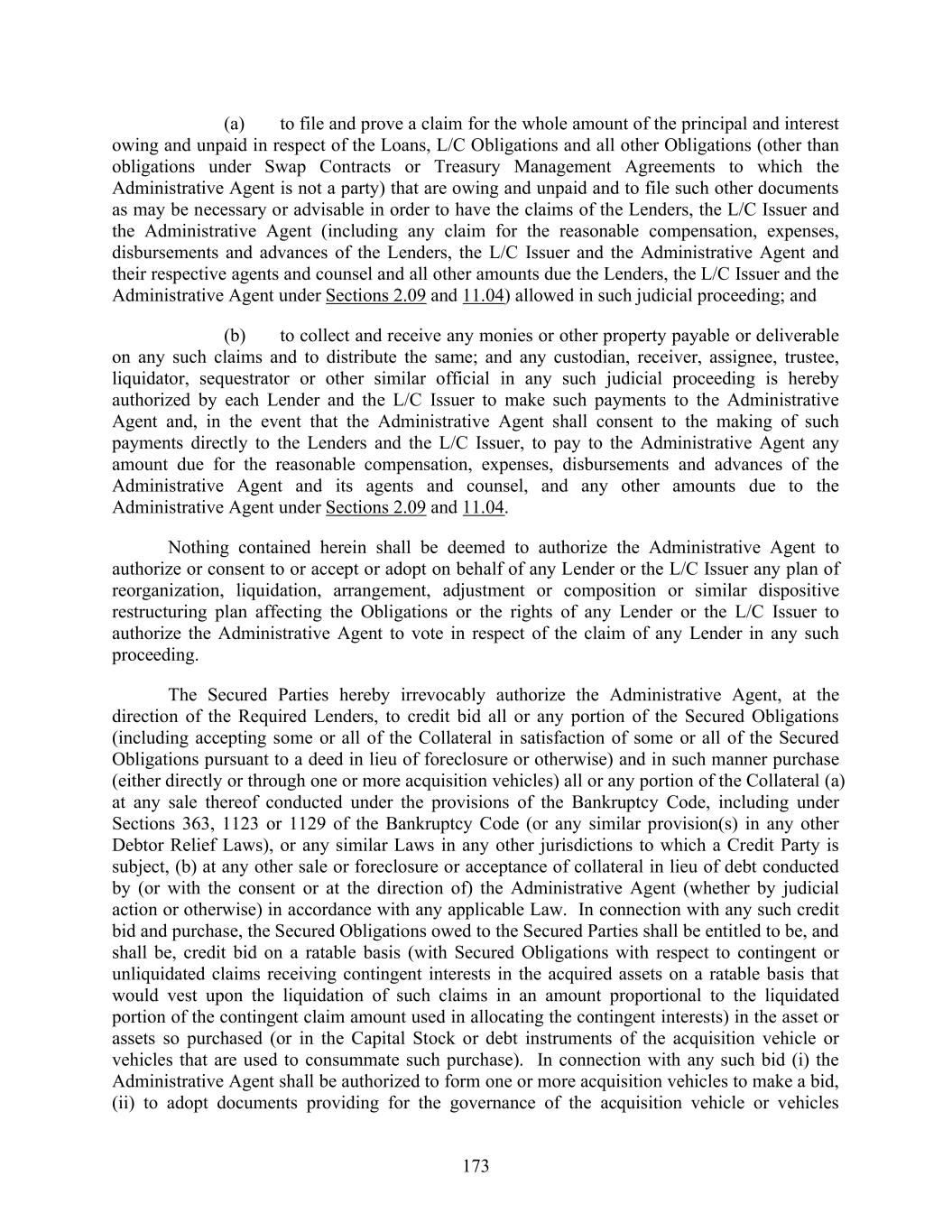 173 (a) to file and prove a claim for the whole amount of the principal and interest owing and unpaid in respect of the Loans, L/C Obligations and all other Obligations (other than obligations under Swap Contracts or Treasury Management Agreements to which the Administrative Agent is not a party) that are owing and unpaid and to file such other documents as may be necessary or advisable in order to have the claims of the Lenders, the L/C Issuer and the Administrative Agent (including any claim for the reasonable compensation, expenses, disbursements and advances of the Lenders, the L/C Issuer and the Administrative Agent and their respective agents and counsel and all other amounts due the Lenders, the L/C Issuer and the Administrative Agent under Sections 2.09 and 11.04) allowed in such judicial proceeding; and (b) to collect and receive any monies or other property payable or deliverable on any such claims and to distribute the same; and any custodian, receiver, assignee, trustee, liquidator, sequestrator or other similar official in any such judicial proceeding is hereby authorized by each Lender and the L/C Issuer to make such payments to the Administrative Agent and, in the event that the Administrative Agent shall consent to the making of such payments directly to the Lenders and the L/C Issuer, to pay to the Administrative Agent any amount due for the reasonable compensation, expenses, disbursements and advances of the Administrative Agent and its agents and counsel, and any other amounts due to the Administrative Agent under Sections 2.09 and 11.04. Nothing contained herein shall be deemed to authorize the Administrative Agent to authorize or consent to or accept or adopt on behalf of any Lender or the L/C Issuer any plan of reorganization, liquidation, arrangement, adjustment or composition or similar dispositive restructuring plan affecting the Obligations or the rights of any Lender or the L/C Issuer to authorize the Administrative Agent to vote in respect of the claim of any Lender in any such proceeding. The Secured Parties hereby irrevocably authorize the Administrative Agent, at the direction of the Required Lenders, to credit bid all or any portion of the Secured Obligations (including accepting some or all of the Collateral in satisfaction of some or all of the Secured Obligations pursuant to a deed in lieu of foreclosure or otherwise) and in such manner purchase (either directly or through one or more acquisition vehicles) all or any portion of the Collateral (a) at any sale thereof conducted under the provisions of the Bankruptcy Code, including under Sections 363, 1123 or 1129 of the Bankruptcy Code (or any similar provision(s) in any other Debtor Relief Laws), or any similar Laws in any other jurisdictions to which a Credit Party is subject, (b) at any other sale or foreclosure or acceptance of collateral in lieu of debt conducted by (or with the consent or at the direction of) the Administrative Agent (whether by judicial action or otherwise) in accordance with any applicable Law. In connection with any such credit bid and purchase, the Secured Obligations owed to the Secured Parties shall be entitled to be, and shall be, credit bid on a ratable basis (with Secured Obligations with respect to contingent or unliquidated claims receiving contingent interests in the acquired assets on a ratable basis that would vest upon the liquidation of such claims in an amount proportional to the liquidated portion of the contingent claim amount used in allocating the contingent interests) in the asset or assets so purchased (or in the Capital Stock or debt instruments of the acquisition vehicle or vehicles that are used to consummate such purchase). In connection with any such bid (i) the Administrative Agent shall be authorized to form one or more acquisition vehicles to make a bid, (ii) to adopt documents providing for the governance of the acquisition vehicle or vehicles