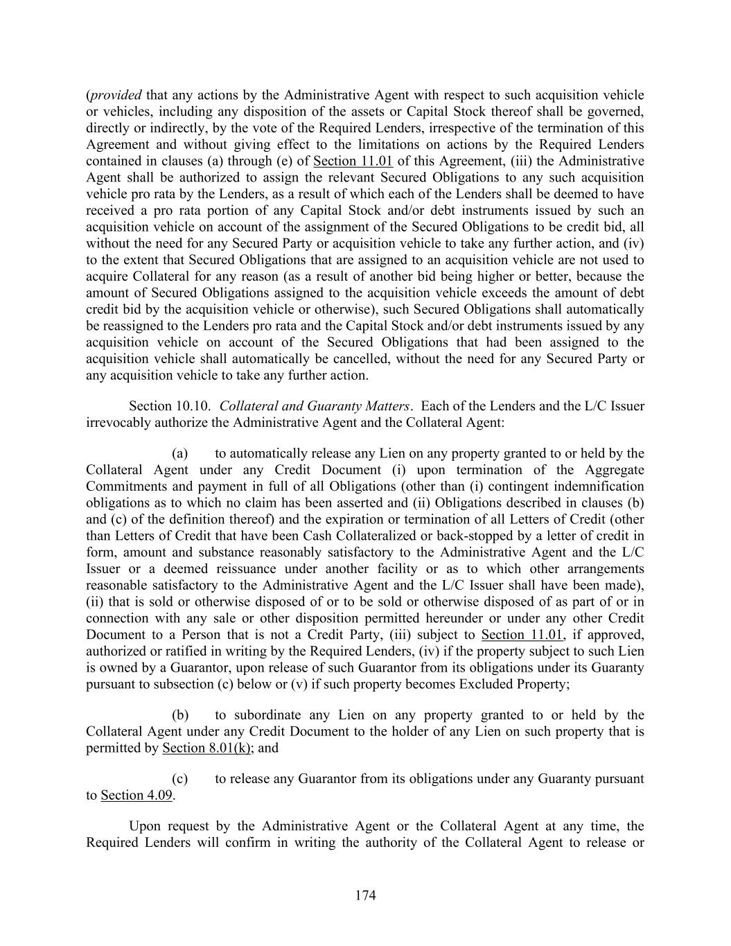 174 (provided that any actions by the Administrative Agent with respect to such acquisition vehicle or vehicles, including any disposition of the assets or Capital Stock thereof shall be governed, directly or indirectly, by the vote of the Required Lenders, irrespective of the termination of this Agreement and without giving effect to the limitations on actions by the Required Lenders contained in clauses (a) through (e) of Section 11.01 of this Agreement, (iii) the Administrative Agent shall be authorized to assign the relevant Secured Obligations to any such acquisition vehicle pro rata by the Lenders, as a result of which each of the Lenders shall be deemed to have received a pro rata portion of any Capital Stock and/or debt instruments issued by such an acquisition vehicle on account of the assignment of the Secured Obligations to be credit bid, all without the need for any Secured Party or acquisition vehicle to take any further action, and (iv) to the extent that Secured Obligations that are assigned to an acquisition vehicle are not used to acquire Collateral for any reason (as a result of another bid being higher or better, because the amount of Secured Obligations assigned to the acquisition vehicle exceeds the amount of debt credit bid by the acquisition vehicle or otherwise), such Secured Obligations shall automatically be reassigned to the Lenders pro rata and the Capital Stock and/or debt instruments issued by any acquisition vehicle on account of the Secured Obligations that had been assigned to the acquisition vehicle shall automatically be cancelled, without the need for any Secured Party or any acquisition vehicle to take any further action. Section 10.10. Collateral and Guaranty Matters. Each of the Lenders and the L/C Issuer irrevocably authorize the Administrative Agent and the Collateral Agent: (a) to automatically release any Lien on any property granted to or held by the Collateral Agent under any Credit Document (i) upon termination of the Aggregate Commitments and payment in full of all Obligations (other than (i) contingent indemnification obligations as to which no claim has been asserted and (ii) Obligations described in clauses (b) and (c) of the definition thereof) and the expiration or termination of all Letters of Credit (other than Letters of Credit that have been Cash Collateralized or back-stopped by a letter of credit in form, amount and substance reasonably satisfactory to the Administrative Agent and the L/C Issuer or a deemed reissuance under another facility or as to which other arrangements reasonable satisfactory to the Administrative Agent and the L/C Issuer shall have been made), (ii) that is sold or otherwise disposed of or to be sold or otherwise disposed of as part of or in connection with any sale or other disposition permitted hereunder or under any other Credit Document to a Person that is not a Credit Party, (iii) subject to Section 11.01, if approved, authorized or ratified in writing by the Required Lenders, (iv) if the property subject to such Lien is owned by a Guarantor, upon release of such Guarantor from its obligations under its Guaranty pursuant to subsection (c) below or (v) if such property becomes Excluded Property; (b) to subordinate any Lien on any property granted to or held by the Collateral Agent under any Credit Document to the holder of any Lien on such property that is permitted by Section 8.01(k); and (c) to release any Guarantor from its obligations under any Guaranty pursuant to Section 4.09. Upon request by the Administrative Agent or the Collateral Agent at any time, the Required Lenders will confirm in writing the authority of the Collateral Agent to release or