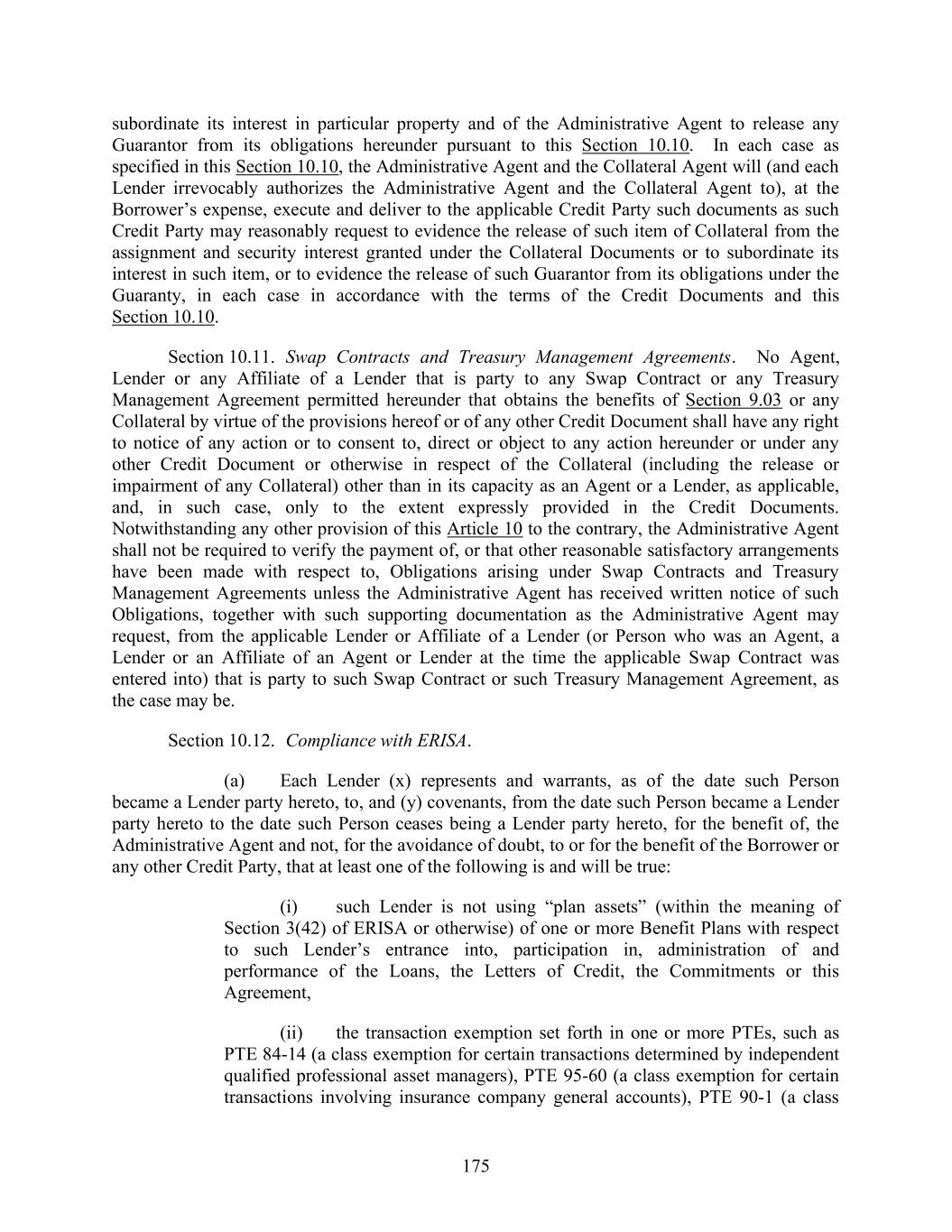 175 subordinate its interest in particular property and of the Administrative Agent to release any Guarantor from its obligations hereunder pursuant to this Section 10.10. In each case as specified in this Section 10.10, the Administrative Agent and the Collateral Agent will (and each Lender irrevocably authorizes the Administrative Agent and the Collateral Agent to), at the Borrower’s expense, execute and deliver to the applicable Credit Party such documents as such Credit Party may reasonably request to evidence the release of such item of Collateral from the assignment and security interest granted under the Collateral Documents or to subordinate its interest in such item, or to evidence the release of such Guarantor from its obligations under the Guaranty, in each case in accordance with the terms of the Credit Documents and this Section 10.10. Section 10.11. Swap Contracts and Treasury Management Agreements. No Agent, Lender or any Affiliate of a Lender that is party to any Swap Contract or any Treasury Management Agreement permitted hereunder that obtains the benefits of Section 9.03 or any Collateral by virtue of the provisions hereof or of any other Credit Document shall have any right to notice of any action or to consent to, direct or object to any action hereunder or under any other Credit Document or otherwise in respect of the Collateral (including the release or impairment of any Collateral) other than in its capacity as an Agent or a Lender, as applicable, and, in such case, only to the extent expressly provided in the Credit Documents. Notwithstanding any other provision of this Article 10 to the contrary, the Administrative Agent shall not be required to verify the payment of, or that other reasonable satisfactory arrangements have been made with respect to, Obligations arising under Swap Contracts and Treasury Management Agreements unless the Administrative Agent has received written notice of such Obligations, together with such supporting documentation as the Administrative Agent may request, from the applicable Lender or Affiliate of a Lender (or Person who was an Agent, a Lender or an Affiliate of an Agent or Lender at the time the applicable Swap Contract was entered into) that is party to such Swap Contract or such Treasury Management Agreement, as the case may be. Section 10.12. Compliance with ERISA. (a) Each Lender (x) represents and warrants, as of the date such Person became a Lender party hereto, to, and (y) covenants, from the date such Person became a Lender party hereto to the date such Person ceases being a Lender party hereto, for the benefit of, the Administrative Agent and not, for the avoidance of doubt, to or for the benefit of the Borrower or any other Credit Party, that at least one of the following is and will be true: (i) such Lender is not using “plan assets” (within the meaning of Section 3(42) of ERISA or otherwise) of one or more Benefit Plans with respect to such Lender’s entrance into, participation in, administration of and performance of the Loans, the Letters of Credit, the Commitments or this Agreement, (ii) the transaction exemption set forth in one or more PTEs, such as PTE 84-14 (a class exemption for certain transactions determined by independent qualified professional asset managers), PTE 95-60 (a class exemption for certain transactions involving insurance company general accounts), PTE 90-1 (a class