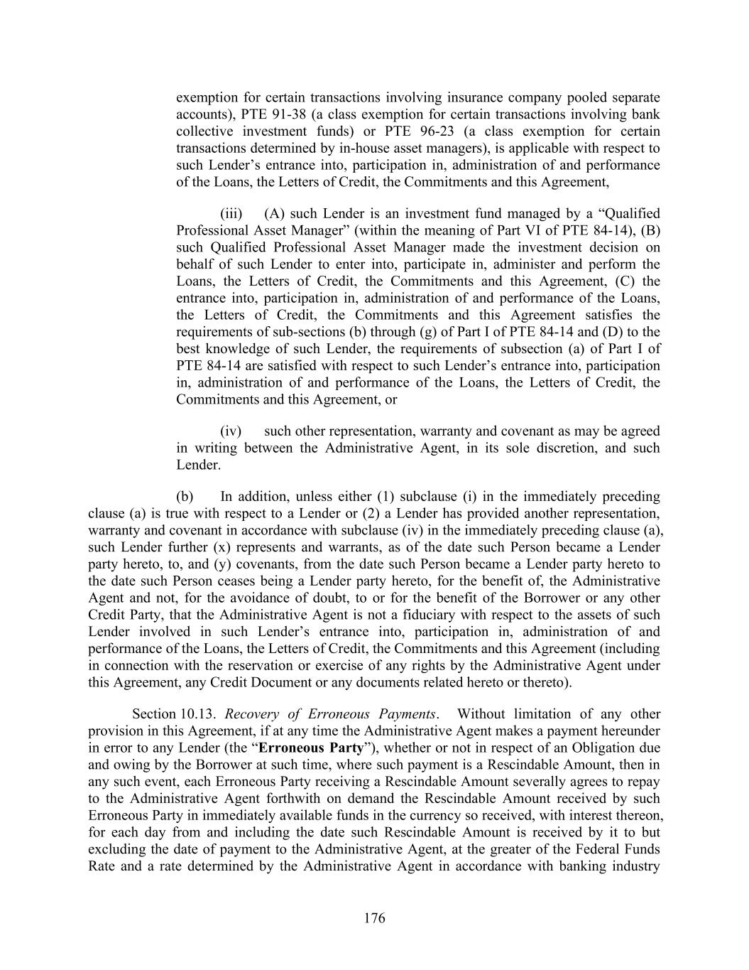 176 exemption for certain transactions involving insurance company pooled separate accounts), PTE 91-38 (a class exemption for certain transactions involving bank collective investment funds) or PTE 96-23 (a class exemption for certain transactions determined by in-house asset managers), is applicable with respect to such Lender’s entrance into, participation in, administration of and performance of the Loans, the Letters of Credit, the Commitments and this Agreement, (iii) (A) such Lender is an investment fund managed by a “Qualified Professional Asset Manager” (within the meaning of Part VI of PTE 84-14), (B) such Qualified Professional Asset Manager made the investment decision on behalf of such Lender to enter into, participate in, administer and perform the Loans, the Letters of Credit, the Commitments and this Agreement, (C) the entrance into, participation in, administration of and performance of the Loans, the Letters of Credit, the Commitments and this Agreement satisfies the requirements of sub-sections (b) through (g) of Part I of PTE 84-14 and (D) to the best knowledge of such Lender, the requirements of subsection (a) of Part I of PTE 84-14 are satisfied with respect to such Lender’s entrance into, participation in, administration of and performance of the Loans, the Letters of Credit, the Commitments and this Agreement, or (iv) such other representation, warranty and covenant as may be agreed in writing between the Administrative Agent, in its sole discretion, and such Lender. (b) In addition, unless either (1) subclause (i) in the immediately preceding clause (a) is true with respect to a Lender or (2) a Lender has provided another representation, warranty and covenant in accordance with subclause (iv) in the immediately preceding clause (a), such Lender further (x) represents and warrants, as of the date such Person became a Lender party hereto, to, and (y) covenants, from the date such Person became a Lender party hereto to the date such Person ceases being a Lender party hereto, for the benefit of, the Administrative Agent and not, for the avoidance of doubt, to or for the benefit of the Borrower or any other Credit Party, that the Administrative Agent is not a fiduciary with respect to the assets of such Lender involved in such Lender’s entrance into, participation in, administration of and performance of the Loans, the Letters of Credit, the Commitments and this Agreement (including in connection with the reservation or exercise of any rights by the Administrative Agent under this Agreement, any Credit Document or any documents related hereto or thereto). Section 10.13. Recovery of Erroneous Payments. Without limitation of any other provision in this Agreement, if at any time the Administrative Agent makes a payment hereunder in error to any Lender (the “Erroneous Party”), whether or not in respect of an Obligation due and owing by the Borrower at such time, where such payment is a Rescindable Amount, then in any such event, each Erroneous Party receiving a Rescindable Amount severally agrees to repay to the Administrative Agent forthwith on demand the Rescindable Amount received by such Erroneous Party in immediately available funds in the currency so received, with interest thereon, for each day from and including the date such Rescindable Amount is received by it to but excluding the date of payment to the Administrative Agent, at the greater of the Federal Funds Rate and a rate determined by the Administrative Agent in accordance with banking industry