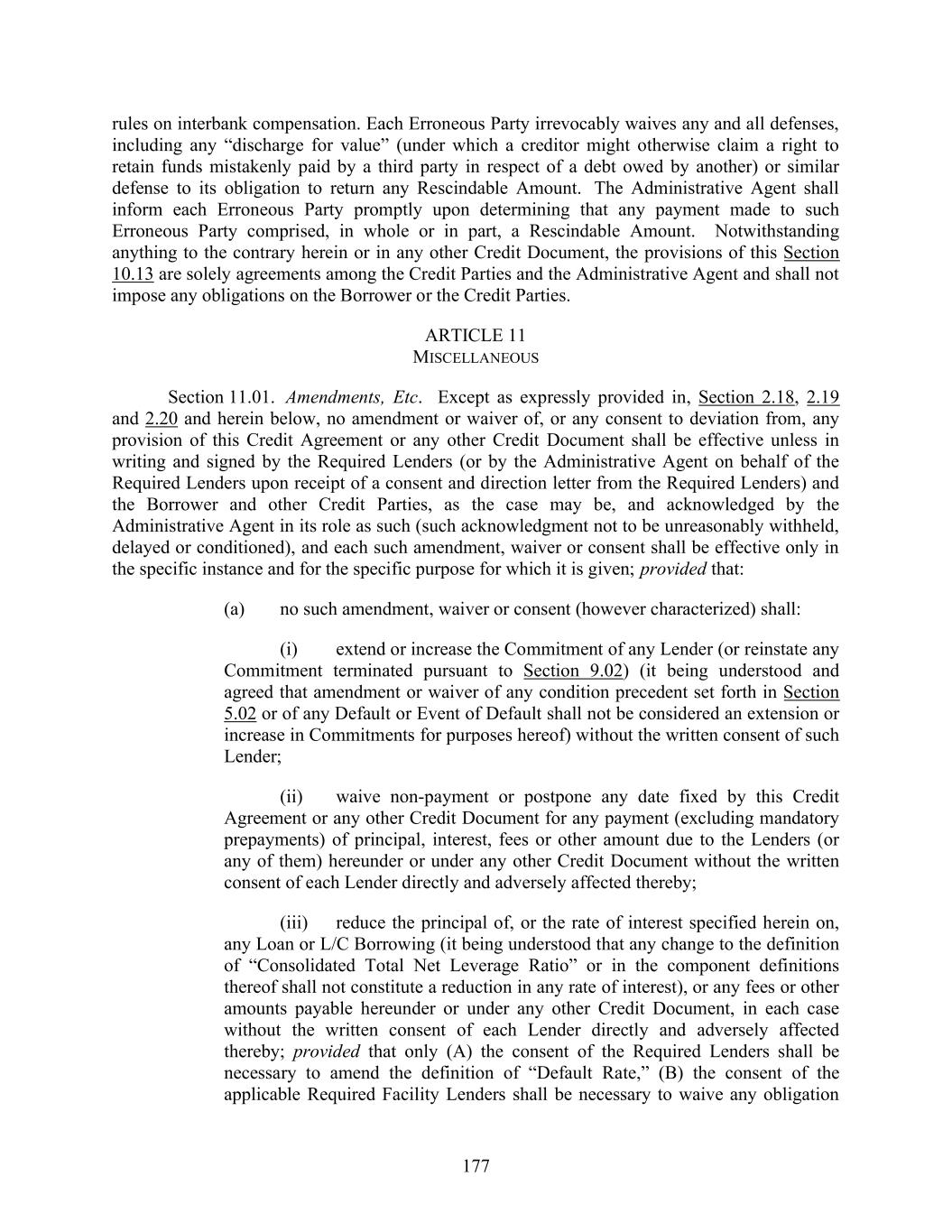 177 rules on interbank compensation. Each Erroneous Party irrevocably waives any and all defenses, including any “discharge for value” (under which a creditor might otherwise claim a right to retain funds mistakenly paid by a third party in respect of a debt owed by another) or similar defense to its obligation to return any Rescindable Amount. The Administrative Agent shall inform each Erroneous Party promptly upon determining that any payment made to such Erroneous Party comprised, in whole or in part, a Rescindable Amount. Notwithstanding anything to the contrary herein or in any other Credit Document, the provisions of this Section 10.13 are solely agreements among the Credit Parties and the Administrative Agent and shall not impose any obligations on the Borrower or the Credit Parties. ARTICLE 11 MISCELLANEOUS Section 11.01. Amendments, Etc. Except as expressly provided in, Section 2.18, 2.19 and 2.20 and herein below, no amendment or waiver of, or any consent to deviation from, any provision of this Credit Agreement or any other Credit Document shall be effective unless in writing and signed by the Required Lenders (or by the Administrative Agent on behalf of the Required Lenders upon receipt of a consent and direction letter from the Required Lenders) and the Borrower and other Credit Parties, as the case may be, and acknowledged by the Administrative Agent in its role as such (such acknowledgment not to be unreasonably withheld, delayed or conditioned), and each such amendment, waiver or consent shall be effective only in the specific instance and for the specific purpose for which it is given; provided that: (a) no such amendment, waiver or consent (however characterized) shall: (i) extend or increase the Commitment of any Lender (or reinstate any Commitment terminated pursuant to Section 9.02) (it being understood and agreed that amendment or waiver of any condition precedent set forth in Section 5.02 or of any Default or Event of Default shall not be considered an extension or increase in Commitments for purposes hereof) without the written consent of such Lender; (ii) waive non-payment or postpone any date fixed by this Credit Agreement or any other Credit Document for any payment (excluding mandatory prepayments) of principal, interest, fees or other amount due to the Lenders (or any of them) hereunder or under any other Credit Document without the written consent of each Lender directly and adversely affected thereby; (iii) reduce the principal of, or the rate of interest specified herein on, any Loan or L/C Borrowing (it being understood that any change to the definition of “Consolidated Total Net Leverage Ratio” or in the component definitions thereof shall not constitute a reduction in any rate of interest), or any fees or other amounts payable hereunder or under any other Credit Document, in each case without the written consent of each Lender directly and adversely affected thereby; provided that only (A) the consent of the Required Lenders shall be necessary to amend the definition of “Default Rate,” (B) the consent of the applicable Required Facility Lenders shall be necessary to waive any obligation