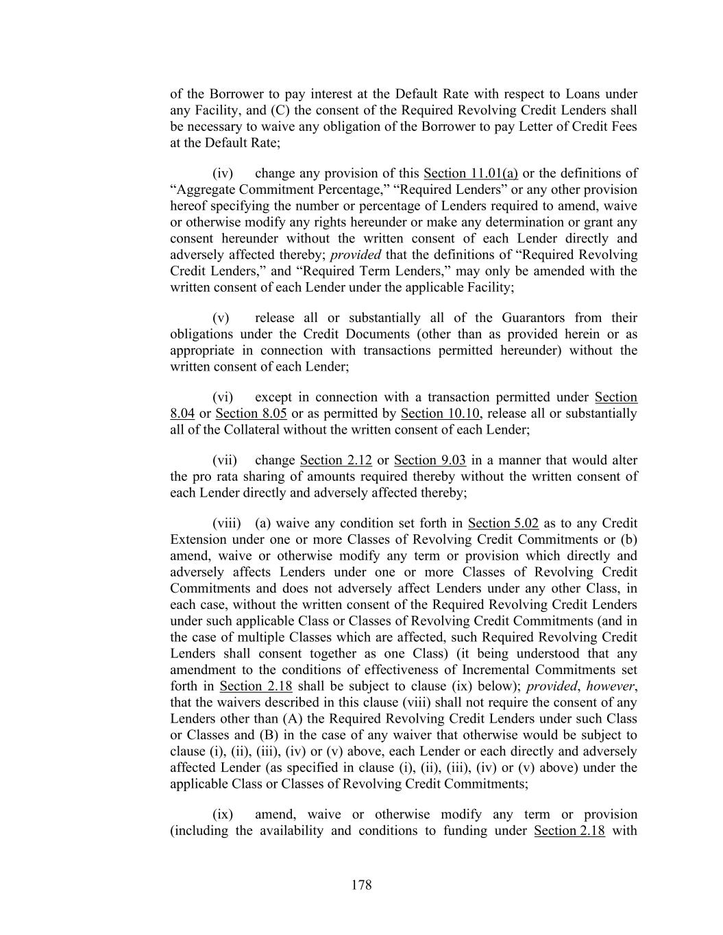178 of the Borrower to pay interest at the Default Rate with respect to Loans under any Facility, and (C) the consent of the Required Revolving Credit Lenders shall be necessary to waive any obligation of the Borrower to pay Letter of Credit Fees at the Default Rate; (iv) change any provision of this Section 11.01(a) or the definitions of “Aggregate Commitment Percentage,” “Required Lenders” or any other provision hereof specifying the number or percentage of Lenders required to amend, waive or otherwise modify any rights hereunder or make any determination or grant any consent hereunder without the written consent of each Lender directly and adversely affected thereby; provided that the definitions of “Required Revolving Credit Lenders,” and “Required Term Lenders,” may only be amended with the written consent of each Lender under the applicable Facility; (v) release all or substantially all of the Guarantors from their obligations under the Credit Documents (other than as provided herein or as appropriate in connection with transactions permitted hereunder) without the written consent of each Lender; (vi) except in connection with a transaction permitted under Section 8.04 or Section 8.05 or as permitted by Section 10.10, release all or substantially all of the Collateral without the written consent of each Lender; (vii) change Section 2.12 or Section 9.03 in a manner that would alter the pro rata sharing of amounts required thereby without the written consent of each Lender directly and adversely affected thereby; (viii) (a) waive any condition set forth in Section 5.02 as to any Credit Extension under one or more Classes of Revolving Credit Commitments or (b) amend, waive or otherwise modify any term or provision which directly and adversely affects Lenders under one or more Classes of Revolving Credit Commitments and does not adversely affect Lenders under any other Class, in each case, without the written consent of the Required Revolving Credit Lenders under such applicable Class or Classes of Revolving Credit Commitments (and in the case of multiple Classes which are affected, such Required Revolving Credit Lenders shall consent together as one Class) (it being understood that any amendment to the conditions of effectiveness of Incremental Commitments set forth in Section 2.18 shall be subject to clause (ix) below); provided, however, that the waivers described in this clause (viii) shall not require the consent of any Lenders other than (A) the Required Revolving Credit Lenders under such Class or Classes and (B) in the case of any waiver that otherwise would be subject to clause (i), (ii), (iii), (iv) or (v) above, each Lender or each directly and adversely affected Lender (as specified in clause (i), (ii), (iii), (iv) or (v) above) under the applicable Class or Classes of Revolving Credit Commitments; (ix) amend, waive or otherwise modify any term or provision (including the availability and conditions to funding under Section 2.18 with