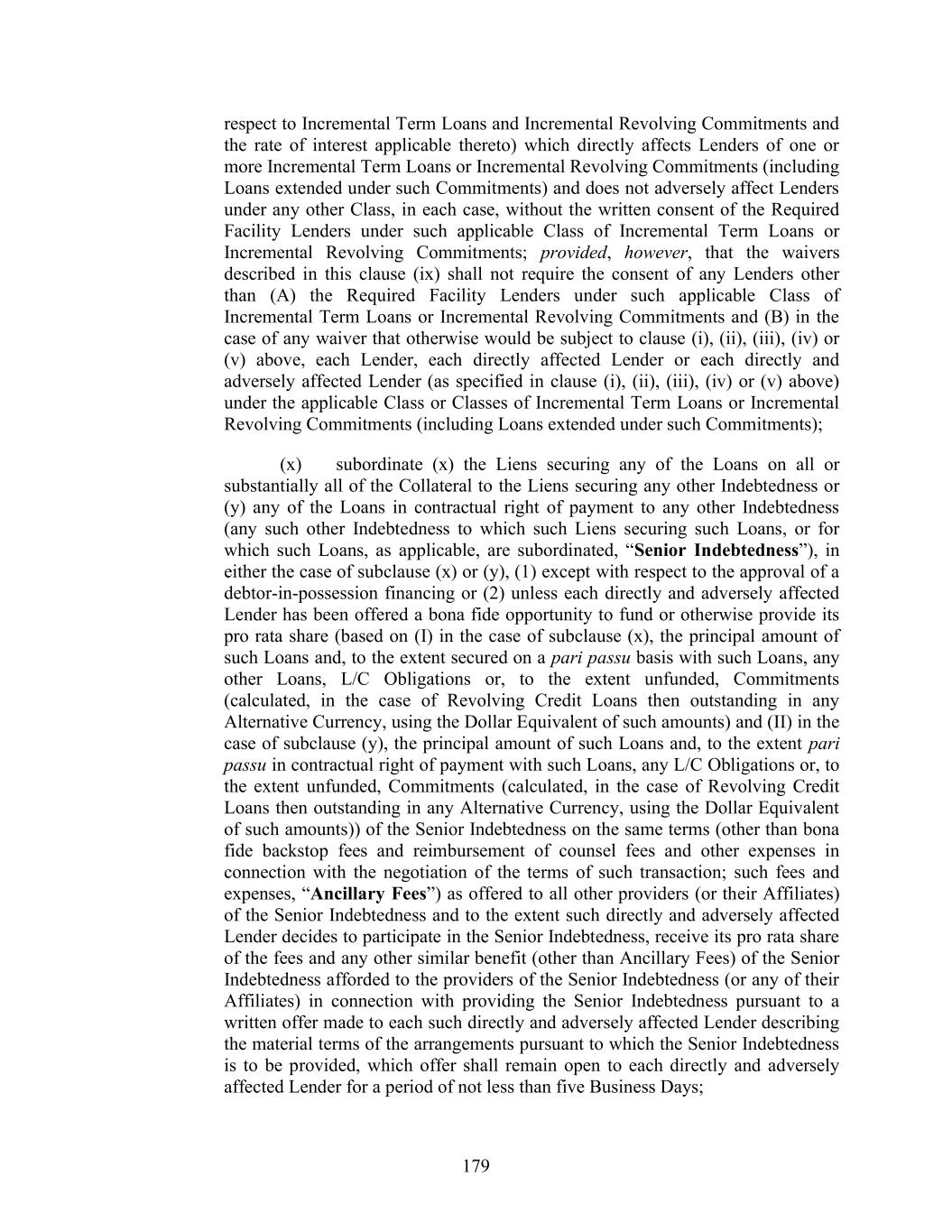 179 respect to Incremental Term Loans and Incremental Revolving Commitments and the rate of interest applicable thereto) which directly affects Lenders of one or more Incremental Term Loans or Incremental Revolving Commitments (including Loans extended under such Commitments) and does not adversely affect Lenders under any other Class, in each case, without the written consent of the Required Facility Lenders under such applicable Class of Incremental Term Loans or Incremental Revolving Commitments; provided, however, that the waivers described in this clause (ix) shall not require the consent of any Lenders other than (A) the Required Facility Lenders under such applicable Class of Incremental Term Loans or Incremental Revolving Commitments and (B) in the case of any waiver that otherwise would be subject to clause (i), (ii), (iii), (iv) or (v) above, each Lender, each directly affected Lender or each directly and adversely affected Lender (as specified in clause (i), (ii), (iii), (iv) or (v) above) under the applicable Class or Classes of Incremental Term Loans or Incremental Revolving Commitments (including Loans extended under such Commitments); (x) subordinate (x) the Liens securing any of the Loans on all or substantially all of the Collateral to the Liens securing any other Indebtedness or (y) any of the Loans in contractual right of payment to any other Indebtedness (any such other Indebtedness to which such Liens securing such Loans, or for which such Loans, as applicable, are subordinated, “Senior Indebtedness”), in either the case of subclause (x) or (y), (1) except with respect to the approval of a debtor-in-possession financing or (2) unless each directly and adversely affected Lender has been offered a bona fide opportunity to fund or otherwise provide its pro rata share (based on (I) in the case of subclause (x), the principal amount of such Loans and, to the extent secured on a pari passu basis with such Loans, any other Loans, L/C Obligations or, to the extent unfunded, Commitments (calculated, in the case of Revolving Credit Loans then outstanding in any Alternative Currency, using the Dollar Equivalent of such amounts) and (II) in the case of subclause (y), the principal amount of such Loans and, to the extent pari passu in contractual right of payment with such Loans, any L/C Obligations or, to the extent unfunded, Commitments (calculated, in the case of Revolving Credit Loans then outstanding in any Alternative Currency, using the Dollar Equivalent of such amounts)) of the Senior Indebtedness on the same terms (other than bona fide backstop fees and reimbursement of counsel fees and other expenses in connection with the negotiation of the terms of such transaction; such fees and expenses, “Ancillary Fees”) as offered to all other providers (or their Affiliates) of the Senior Indebtedness and to the extent such directly and adversely affected Lender decides to participate in the Senior Indebtedness, receive its pro rata share of the fees and any other similar benefit (other than Ancillary Fees) of the Senior Indebtedness afforded to the providers of the Senior Indebtedness (or any of their Affiliates) in connection with providing the Senior Indebtedness pursuant to a written offer made to each such directly and adversely affected Lender describing the material terms of the arrangements pursuant to which the Senior Indebtedness is to be provided, which offer shall remain open to each directly and adversely affected Lender for a period of not less than five Business Days;