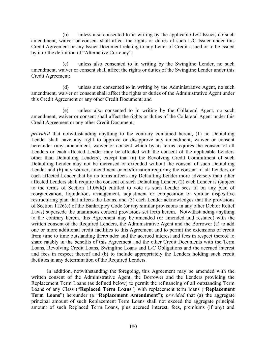 180 (b) unless also consented to in writing by the applicable L/C Issuer, no such amendment, waiver or consent shall affect the rights or duties of such L/C Issuer under this Credit Agreement or any Issuer Document relating to any Letter of Credit issued or to be issued by it or the definition of “Alternative Currency”; (c) unless also consented to in writing by the Swingline Lender, no such amendment, waiver or consent shall affect the rights or duties of the Swingline Lender under this Credit Agreement; (d) unless also consented to in writing by the Administrative Agent, no such amendment, waiver or consent shall affect the rights or duties of the Administrative Agent under this Credit Agreement or any other Credit Document; and (e) unless also consented to in writing by the Collateral Agent, no such amendment, waiver or consent shall affect the rights or duties of the Collateral Agent under this Credit Agreement or any other Credit Document; provided that notwithstanding anything to the contrary contained herein, (1) no Defaulting Lender shall have any right to approve or disapprove any amendment, waiver or consent hereunder (any amendment, waiver or consent which by its terms requires the consent of all Lenders or each affected Lender may be effected with the consent of the applicable Lenders other than Defaulting Lenders), except that (a) the Revolving Credit Commitment of such Defaulting Lender may not be increased or extended without the consent of such Defaulting Lender and (b) any waiver, amendment or modification requiring the consent of all Lenders or each affected Lender that by its terms affects any Defaulting Lender more adversely than other affected Lenders shall require the consent of such Defaulting Lender, (2) each Lender is (subject to the terms of Section 11.06(k)) entitled to vote as such Lender sees fit on any plan of reorganization, liquidation, arrangement, adjustment or composition or similar dispositive restructuring plan that affects the Loans, and (3) each Lender acknowledges that the provisions of Section 1126(c) of the Bankruptcy Code (or any similar provisions in any other Debtor Relief Laws) supersede the unanimous consent provisions set forth herein. Notwithstanding anything to the contrary herein, this Agreement may be amended (or amended and restated) with the written consent of the Required Lenders, the Administrative Agent and the Borrower (a) to add one or more additional credit facilities to this Agreement and to permit the extensions of credit from time to time outstanding thereunder and the accrued interest and fees in respect thereof to share ratably in the benefits of this Agreement and the other Credit Documents with the Term Loans, Revolving Credit Loans, Swingline Loans and L/C Obligations and the accrued interest and fees in respect thereof and (b) to include appropriately the Lenders holding such credit facilities in any determination of the Required Lenders. In addition, notwithstanding the foregoing, this Agreement may be amended with the written consent of the Administrative Agent, the Borrower and the Lenders providing the Replacement Term Loans (as defined below) to permit the refinancing of all outstanding Term Loans of any Class (“Replaced Term Loans”) with replacement term loans (“Replacement Term Loans”) hereunder (a “Replacement Amendment”); provided that (a) the aggregate principal amount of such Replacement Term Loans shall not exceed the aggregate principal amount of such Replaced Term Loans, plus accrued interest, fees, premiums (if any) and