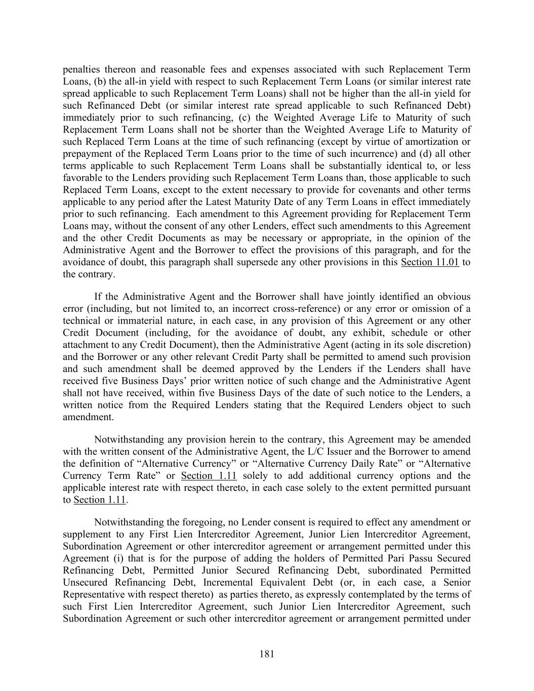 181 penalties thereon and reasonable fees and expenses associated with such Replacement Term Loans, (b) the all-in yield with respect to such Replacement Term Loans (or similar interest rate spread applicable to such Replacement Term Loans) shall not be higher than the all-in yield for such Refinanced Debt (or similar interest rate spread applicable to such Refinanced Debt) immediately prior to such refinancing, (c) the Weighted Average Life to Maturity of such Replacement Term Loans shall not be shorter than the Weighted Average Life to Maturity of such Replaced Term Loans at the time of such refinancing (except by virtue of amortization or prepayment of the Replaced Term Loans prior to the time of such incurrence) and (d) all other terms applicable to such Replacement Term Loans shall be substantially identical to, or less favorable to the Lenders providing such Replacement Term Loans than, those applicable to such Replaced Term Loans, except to the extent necessary to provide for covenants and other terms applicable to any period after the Latest Maturity Date of any Term Loans in effect immediately prior to such refinancing. Each amendment to this Agreement providing for Replacement Term Loans may, without the consent of any other Lenders, effect such amendments to this Agreement and the other Credit Documents as may be necessary or appropriate, in the opinion of the Administrative Agent and the Borrower to effect the provisions of this paragraph, and for the avoidance of doubt, this paragraph shall supersede any other provisions in this Section 11.01 to the contrary. If the Administrative Agent and the Borrower shall have jointly identified an obvious error (including, but not limited to, an incorrect cross-reference) or any error or omission of a technical or immaterial nature, in each case, in any provision of this Agreement or any other Credit Document (including, for the avoidance of doubt, any exhibit, schedule or other attachment to any Credit Document), then the Administrative Agent (acting in its sole discretion) and the Borrower or any other relevant Credit Party shall be permitted to amend such provision and such amendment shall be deemed approved by the Lenders if the Lenders shall have received five Business Days’ prior written notice of such change and the Administrative Agent shall not have received, within five Business Days of the date of such notice to the Lenders, a written notice from the Required Lenders stating that the Required Lenders object to such amendment. Notwithstanding any provision herein to the contrary, this Agreement may be amended with the written consent of the Administrative Agent, the L/C Issuer and the Borrower to amend the definition of “Alternative Currency” or “Alternative Currency Daily Rate” or “Alternative Currency Term Rate” or Section 1.11 solely to add additional currency options and the applicable interest rate with respect thereto, in each case solely to the extent permitted pursuant to Section 1.11. Notwithstanding the foregoing, no Lender consent is required to effect any amendment or supplement to any First Lien Intercreditor Agreement, Junior Lien Intercreditor Agreement, Subordination Agreement or other intercreditor agreement or arrangement permitted under this Agreement (i) that is for the purpose of adding the holders of Permitted Pari Passu Secured Refinancing Debt, Permitted Junior Secured Refinancing Debt, subordinated Permitted Unsecured Refinancing Debt, Incremental Equivalent Debt (or, in each case, a Senior Representative with respect thereto) as parties thereto, as expressly contemplated by the terms of such First Lien Intercreditor Agreement, such Junior Lien Intercreditor Agreement, such Subordination Agreement or such other intercreditor agreement or arrangement permitted under