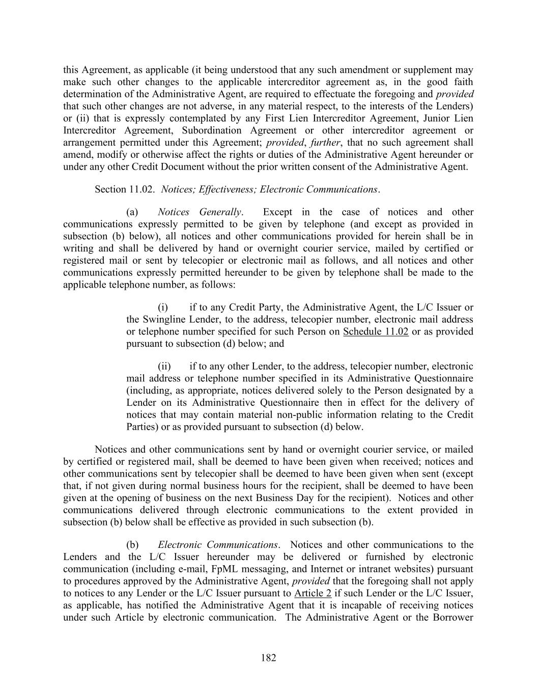 182 this Agreement, as applicable (it being understood that any such amendment or supplement may make such other changes to the applicable intercreditor agreement as, in the good faith determination of the Administrative Agent, are required to effectuate the foregoing and provided that such other changes are not adverse, in any material respect, to the interests of the Lenders) or (ii) that is expressly contemplated by any First Lien Intercreditor Agreement, Junior Lien Intercreditor Agreement, Subordination Agreement or other intercreditor agreement or arrangement permitted under this Agreement; provided, further, that no such agreement shall amend, modify or otherwise affect the rights or duties of the Administrative Agent hereunder or under any other Credit Document without the prior written consent of the Administrative Agent. Section 11.02. Notices; Effectiveness; Electronic Communications. (a) Notices Generally. Except in the case of notices and other communications expressly permitted to be given by telephone (and except as provided in subsection (b) below), all notices and other communications provided for herein shall be in writing and shall be delivered by hand or overnight courier service, mailed by certified or registered mail or sent by telecopier or electronic mail as follows, and all notices and other communications expressly permitted hereunder to be given by telephone shall be made to the applicable telephone number, as follows: (i) if to any Credit Party, the Administrative Agent, the L/C Issuer or the Swingline Lender, to the address, telecopier number, electronic mail address or telephone number specified for such Person on Schedule 11.02 or as provided pursuant to subsection (d) below; and (ii) if to any other Lender, to the address, telecopier number, electronic mail address or telephone number specified in its Administrative Questionnaire (including, as appropriate, notices delivered solely to the Person designated by a Lender on its Administrative Questionnaire then in effect for the delivery of notices that may contain material non-public information relating to the Credit Parties) or as provided pursuant to subsection (d) below. Notices and other communications sent by hand or overnight courier service, or mailed by certified or registered mail, shall be deemed to have been given when received; notices and other communications sent by telecopier shall be deemed to have been given when sent (except that, if not given during normal business hours for the recipient, shall be deemed to have been given at the opening of business on the next Business Day for the recipient). Notices and other communications delivered through electronic communications to the extent provided in subsection (b) below shall be effective as provided in such subsection (b). (b) Electronic Communications. Notices and other communications to the Lenders and the L/C Issuer hereunder may be delivered or furnished by electronic communication (including e-mail, FpML messaging, and Internet or intranet websites) pursuant to procedures approved by the Administrative Agent, provided that the foregoing shall not apply to notices to any Lender or the L/C Issuer pursuant to Article 2 if such Lender or the L/C Issuer, as applicable, has notified the Administrative Agent that it is incapable of receiving notices under such Article by electronic communication. The Administrative Agent or the Borrower