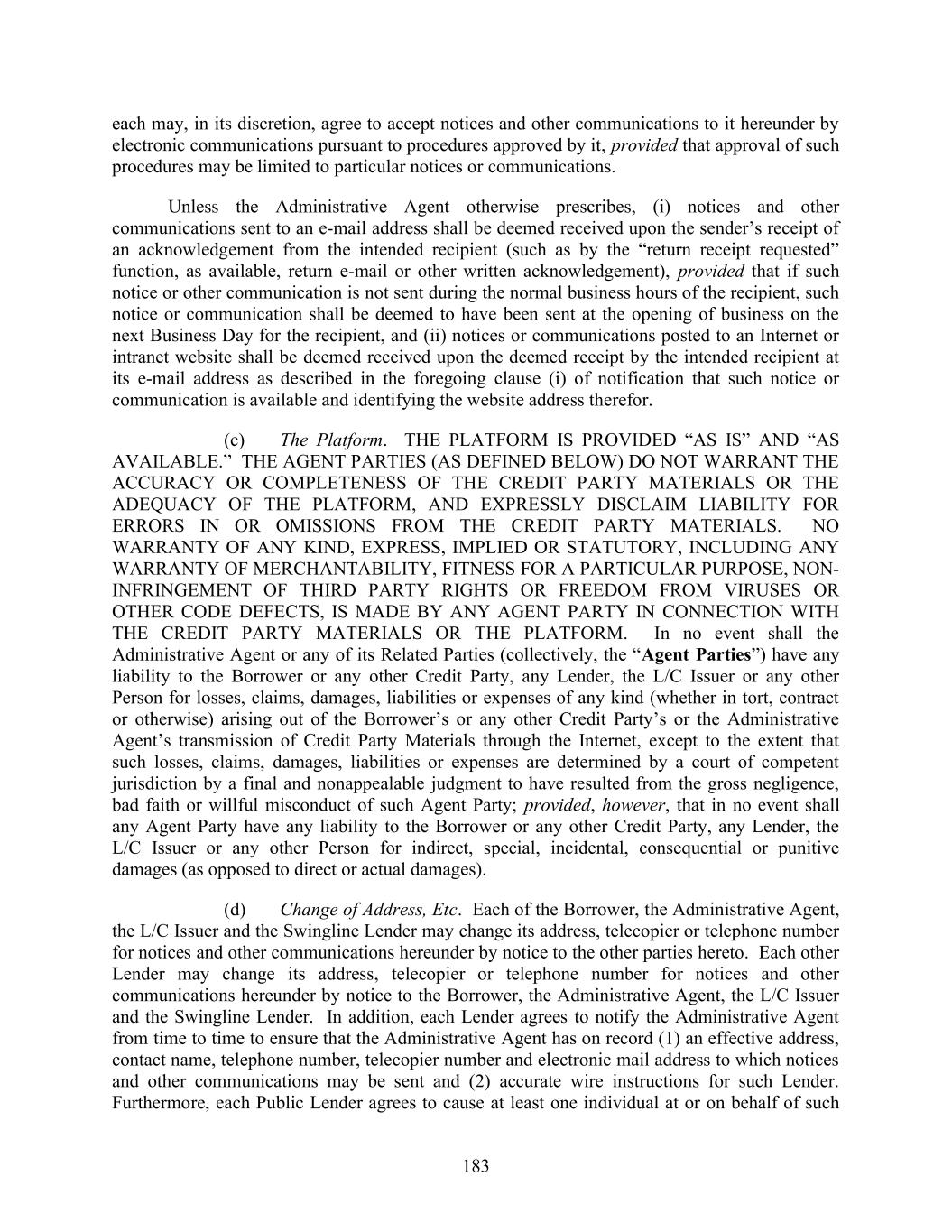 183 each may, in its discretion, agree to accept notices and other communications to it hereunder by electronic communications pursuant to procedures approved by it, provided that approval of such procedures may be limited to particular notices or communications. Unless the Administrative Agent otherwise prescribes, (i) notices and other communications sent to an e-mail address shall be deemed received upon the sender’s receipt of an acknowledgement from the intended recipient (such as by the “return receipt requested” function, as available, return e-mail or other written acknowledgement), provided that if such notice or other communication is not sent during the normal business hours of the recipient, such notice or communication shall be deemed to have been sent at the opening of business on the next Business Day for the recipient, and (ii) notices or communications posted to an Internet or intranet website shall be deemed received upon the deemed receipt by the intended recipient at its e-mail address as described in the foregoing clause (i) of notification that such notice or communication is available and identifying the website address therefor. (c) The Platform. THE PLATFORM IS PROVIDED “AS IS” AND “AS AVAILABLE.” THE AGENT PARTIES (AS DEFINED BELOW) DO NOT WARRANT THE ACCURACY OR COMPLETENESS OF THE CREDIT PARTY MATERIALS OR THE ADEQUACY OF THE PLATFORM, AND EXPRESSLY DISCLAIM LIABILITY FOR ERRORS IN OR OMISSIONS FROM THE CREDIT PARTY MATERIALS. NO WARRANTY OF ANY KIND, EXPRESS, IMPLIED OR STATUTORY, INCLUDING ANY WARRANTY OF MERCHANTABILITY, FITNESS FOR A PARTICULAR PURPOSE, NON- INFRINGEMENT OF THIRD PARTY RIGHTS OR FREEDOM FROM VIRUSES OR OTHER CODE DEFECTS, IS MADE BY ANY AGENT PARTY IN CONNECTION WITH THE CREDIT PARTY MATERIALS OR THE PLATFORM. In no event shall the Administrative Agent or any of its Related Parties (collectively, the “Agent Parties”) have any liability to the Borrower or any other Credit Party, any Lender, the L/C Issuer or any other Person for losses, claims, damages, liabilities or expenses of any kind (whether in tort, contract or otherwise) arising out of the Borrower’s or any other Credit Party’s or the Administrative Agent’s transmission of Credit Party Materials through the Internet, except to the extent that such losses, claims, damages, liabilities or expenses are determined by a court of competent jurisdiction by a final and nonappealable judgment to have resulted from the gross negligence, bad faith or willful misconduct of such Agent Party; provided, however, that in no event shall any Agent Party have any liability to the Borrower or any other Credit Party, any Lender, the L/C Issuer or any other Person for indirect, special, incidental, consequential or punitive damages (as opposed to direct or actual damages). (d) Change of Address, Etc. Each of the Borrower, the Administrative Agent, the L/C Issuer and the Swingline Lender may change its address, telecopier or telephone number for notices and other communications hereunder by notice to the other parties hereto. Each other Lender may change its address, telecopier or telephone number for notices and other communications hereunder by notice to the Borrower, the Administrative Agent, the L/C Issuer and the Swingline Lender. In addition, each Lender agrees to notify the Administrative Agent from time to time to ensure that the Administrative Agent has on record (1) an effective address, contact name, telephone number, telecopier number and electronic mail address to which notices and other communications may be sent and (2) accurate wire instructions for such Lender. Furthermore, each Public Lender agrees to cause at least one individual at or on behalf of such