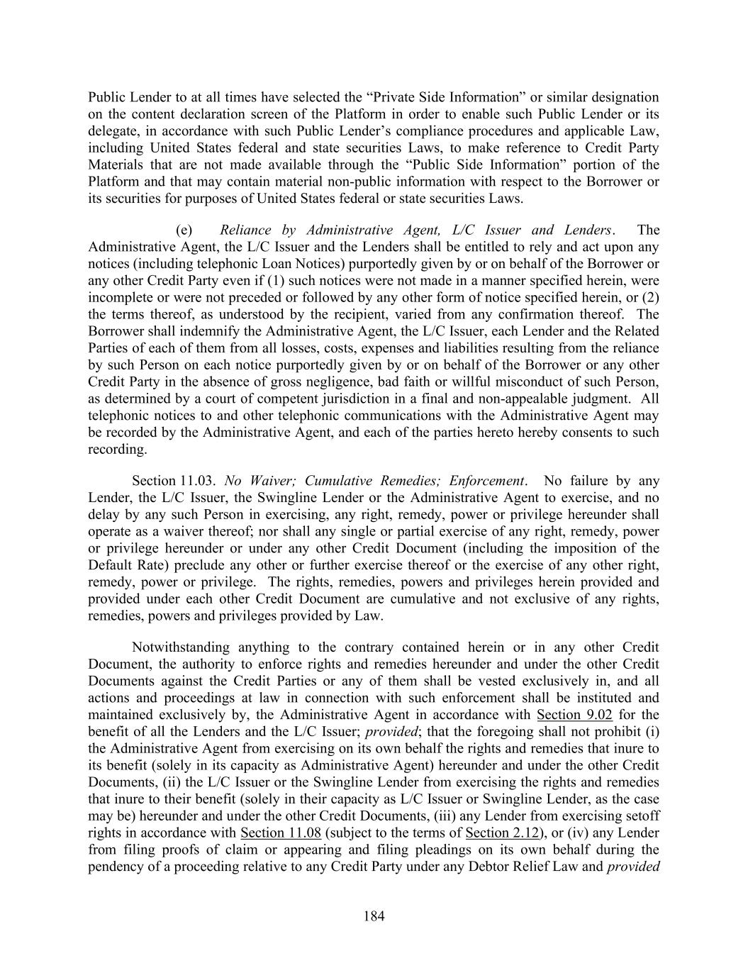 184 Public Lender to at all times have selected the “Private Side Information” or similar designation on the content declaration screen of the Platform in order to enable such Public Lender or its delegate, in accordance with such Public Lender’s compliance procedures and applicable Law, including United States federal and state securities Laws, to make reference to Credit Party Materials that are not made available through the “Public Side Information” portion of the Platform and that may contain material non-public information with respect to the Borrower or its securities for purposes of United States federal or state securities Laws. (e) Reliance by Administrative Agent, L/C Issuer and Lenders. The Administrative Agent, the L/C Issuer and the Lenders shall be entitled to rely and act upon any notices (including telephonic Loan Notices) purportedly given by or on behalf of the Borrower or any other Credit Party even if (1) such notices were not made in a manner specified herein, were incomplete or were not preceded or followed by any other form of notice specified herein, or (2) the terms thereof, as understood by the recipient, varied from any confirmation thereof. The Borrower shall indemnify the Administrative Agent, the L/C Issuer, each Lender and the Related Parties of each of them from all losses, costs, expenses and liabilities resulting from the reliance by such Person on each notice purportedly given by or on behalf of the Borrower or any other Credit Party in the absence of gross negligence, bad faith or willful misconduct of such Person, as determined by a court of competent jurisdiction in a final and non-appealable judgment. All telephonic notices to and other telephonic communications with the Administrative Agent may be recorded by the Administrative Agent, and each of the parties hereto hereby consents to such recording. Section 11.03. No Waiver; Cumulative Remedies; Enforcement. No failure by any Lender, the L/C Issuer, the Swingline Lender or the Administrative Agent to exercise, and no delay by any such Person in exercising, any right, remedy, power or privilege hereunder shall operate as a waiver thereof; nor shall any single or partial exercise of any right, remedy, power or privilege hereunder or under any other Credit Document (including the imposition of the Default Rate) preclude any other or further exercise thereof or the exercise of any other right, remedy, power or privilege. The rights, remedies, powers and privileges herein provided and provided under each other Credit Document are cumulative and not exclusive of any rights, remedies, powers and privileges provided by Law. Notwithstanding anything to the contrary contained herein or in any other Credit Document, the authority to enforce rights and remedies hereunder and under the other Credit Documents against the Credit Parties or any of them shall be vested exclusively in, and all actions and proceedings at law in connection with such enforcement shall be instituted and maintained exclusively by, the Administrative Agent in accordance with Section 9.02 for the benefit of all the Lenders and the L/C Issuer; provided; that the foregoing shall not prohibit (i) the Administrative Agent from exercising on its own behalf the rights and remedies that inure to its benefit (solely in its capacity as Administrative Agent) hereunder and under the other Credit Documents, (ii) the L/C Issuer or the Swingline Lender from exercising the rights and remedies that inure to their benefit (solely in their capacity as L/C Issuer or Swingline Lender, as the case may be) hereunder and under the other Credit Documents, (iii) any Lender from exercising setoff rights in accordance with Section 11.08 (subject to the terms of Section 2.12), or (iv) any Lender from filing proofs of claim or appearing and filing pleadings on its own behalf during the pendency of a proceeding relative to any Credit Party under any Debtor Relief Law and provided