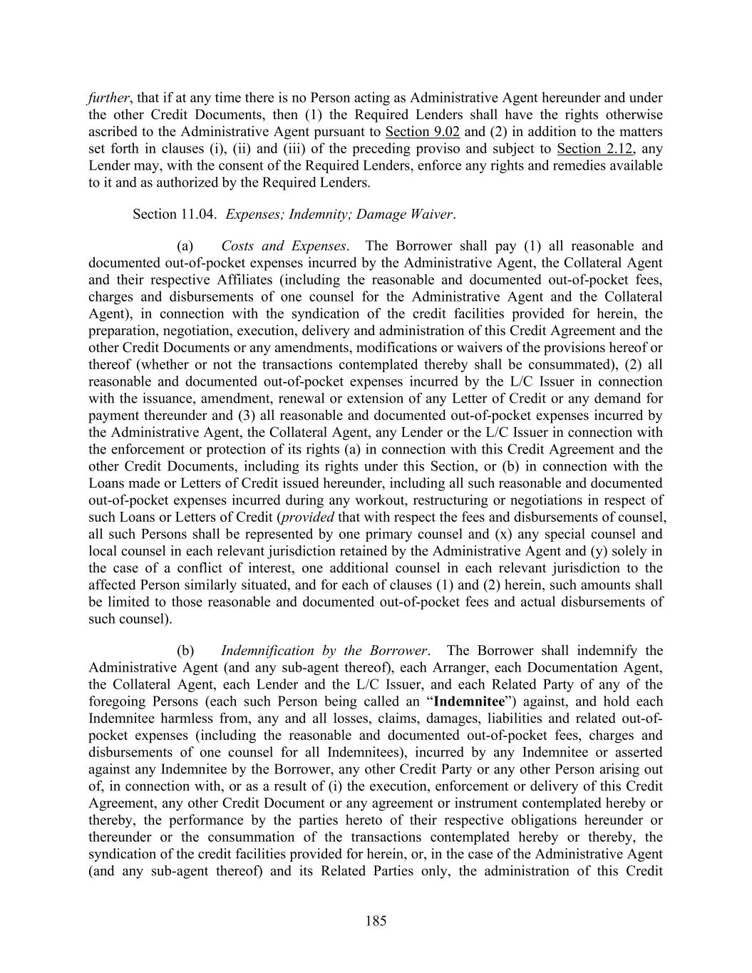 185 further, that if at any time there is no Person acting as Administrative Agent hereunder and under the other Credit Documents, then (1) the Required Lenders shall have the rights otherwise ascribed to the Administrative Agent pursuant to Section 9.02 and (2) in addition to the matters set forth in clauses (i), (ii) and (iii) of the preceding proviso and subject to Section 2.12, any Lender may, with the consent of the Required Lenders, enforce any rights and remedies available to it and as authorized by the Required Lenders. Section 11.04. Expenses; Indemnity; Damage Waiver. (a) Costs and Expenses. The Borrower shall pay (1) all reasonable and documented out-of-pocket expenses incurred by the Administrative Agent, the Collateral Agent and their respective Affiliates (including the reasonable and documented out-of-pocket fees, charges and disbursements of one counsel for the Administrative Agent and the Collateral Agent), in connection with the syndication of the credit facilities provided for herein, the preparation, negotiation, execution, delivery and administration of this Credit Agreement and the other Credit Documents or any amendments, modifications or waivers of the provisions hereof or thereof (whether or not the transactions contemplated thereby shall be consummated), (2) all reasonable and documented out-of-pocket expenses incurred by the L/C Issuer in connection with the issuance, amendment, renewal or extension of any Letter of Credit or any demand for payment thereunder and (3) all reasonable and documented out-of-pocket expenses incurred by the Administrative Agent, the Collateral Agent, any Lender or the L/C Issuer in connection with the enforcement or protection of its rights (a) in connection with this Credit Agreement and the other Credit Documents, including its rights under this Section, or (b) in connection with the Loans made or Letters of Credit issued hereunder, including all such reasonable and documented out-of-pocket expenses incurred during any workout, restructuring or negotiations in respect of such Loans or Letters of Credit (provided that with respect the fees and disbursements of counsel, all such Persons shall be represented by one primary counsel and (x) any special counsel and local counsel in each relevant jurisdiction retained by the Administrative Agent and (y) solely in the case of a conflict of interest, one additional counsel in each relevant jurisdiction to the affected Person similarly situated, and for each of clauses (1) and (2) herein, such amounts shall be limited to those reasonable and documented out-of-pocket fees and actual disbursements of such counsel). (b) Indemnification by the Borrower. The Borrower shall indemnify the Administrative Agent (and any sub-agent thereof), each Arranger, each Documentation Agent, the Collateral Agent, each Lender and the L/C Issuer, and each Related Party of any of the foregoing Persons (each such Person being called an “Indemnitee”) against, and hold each Indemnitee harmless from, any and all losses, claims, damages, liabilities and related out-of- pocket expenses (including the reasonable and documented out-of-pocket fees, charges and disbursements of one counsel for all Indemnitees), incurred by any Indemnitee or asserted against any Indemnitee by the Borrower, any other Credit Party or any other Person arising out of, in connection with, or as a result of (i) the execution, enforcement or delivery of this Credit Agreement, any other Credit Document or any agreement or instrument contemplated hereby or thereby, the performance by the parties hereto of their respective obligations hereunder or thereunder or the consummation of the transactions contemplated hereby or thereby, the syndication of the credit facilities provided for herein, or, in the case of the Administrative Agent (and any sub-agent thereof) and its Related Parties only, the administration of this Credit