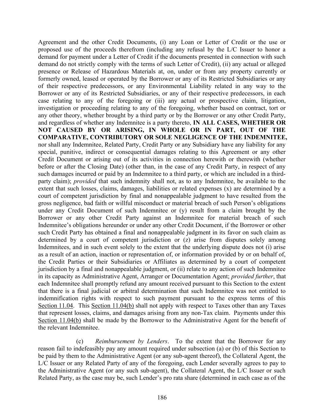 186 Agreement and the other Credit Documents, (i) any Loan or Letter of Credit or the use or proposed use of the proceeds therefrom (including any refusal by the L/C Issuer to honor a demand for payment under a Letter of Credit if the documents presented in connection with such demand do not strictly comply with the terms of such Letter of Credit), (ii) any actual or alleged presence or Release of Hazardous Materials at, on, under or from any property currently or formerly owned, leased or operated by the Borrower or any of its Restricted Subsidiaries or any of their respective predecessors, or any Environmental Liability related in any way to the Borrower or any of its Restricted Subsidiaries, or any of their respective predecessors, in each case relating to any of the foregoing or (iii) any actual or prospective claim, litigation, investigation or proceeding relating to any of the foregoing, whether based on contract, tort or any other theory, whether brought by a third party or by the Borrower or any other Credit Party, and regardless of whether any Indemnitee is a party thereto, IN ALL CASES, WHETHER OR NOT CAUSED BY OR ARISING, IN WHOLE OR IN PART, OUT OF THE COMPARATIVE, CONTRIBUTORY OR SOLE NEGLIGENCE OF THE INDEMNITEE, nor shall any Indemnitee, Related Party, Credit Party or any Subsidiary have any liability for any special, punitive, indirect or consequential damages relating to this Agreement or any other Credit Document or arising out of its activities in connection herewith or therewith (whether before or after the Closing Date) (other than, in the case of any Credit Party, in respect of any such damages incurred or paid by an Indemnitee to a third party, or which are included in a third- party claim); provided that such indemnity shall not, as to any Indemnitee, be available to the extent that such losses, claims, damages, liabilities or related expenses (x) are determined by a court of competent jurisdiction by final and nonappealable judgment to have resulted from the gross negligence, bad faith or willful misconduct or material breach of such Person’s obligations under any Credit Document of such Indemnitee or (y) result from a claim brought by the Borrower or any other Credit Party against an Indemnitee for material breach of such Indemnitee’s obligations hereunder or under any other Credit Document, if the Borrower or other such Credit Party has obtained a final and nonappealable judgment in its favor on such claim as determined by a court of competent jurisdiction or (z) arise from disputes solely among Indemnitees, and in such event solely to the extent that the underlying dispute does not (i) arise as a result of an action, inaction or representation of, or information provided by or on behalf of, the Credit Parties or their Subsidiaries or Affiliates as determined by a court of competent jurisdiction by a final and nonappealable judgment, or (ii) relate to any action of such Indemnitee in its capacity as Administrative Agent, Arranger or Documentation Agent; provided further, that each Indemnitee shall promptly refund any amount received pursuant to this Section to the extent that there is a final judicial or arbitral determination that such Indemnitee was not entitled to indemnification rights with respect to such payment pursuant to the express terms of this Section 11.04. This Section 11.04(b) shall not apply with respect to Taxes other than any Taxes that represent losses, claims, and damages arising from any non-Tax claim. Payments under this Section 11.04(b) shall be made by the Borrower to the Administrative Agent for the benefit of the relevant Indemnitee. (c) Reimbursement by Lenders. To the extent that the Borrower for any reason fail to indefeasibly pay any amount required under subsection (a) or (b) of this Section to be paid by them to the Administrative Agent (or any sub-agent thereof), the Collateral Agent, the L/C Issuer or any Related Party of any of the foregoing, each Lender severally agrees to pay to the Administrative Agent (or any such sub-agent), the Collateral Agent, the L/C Issuer or such Related Party, as the case may be, such Lender’s pro rata share (determined in each case as of the