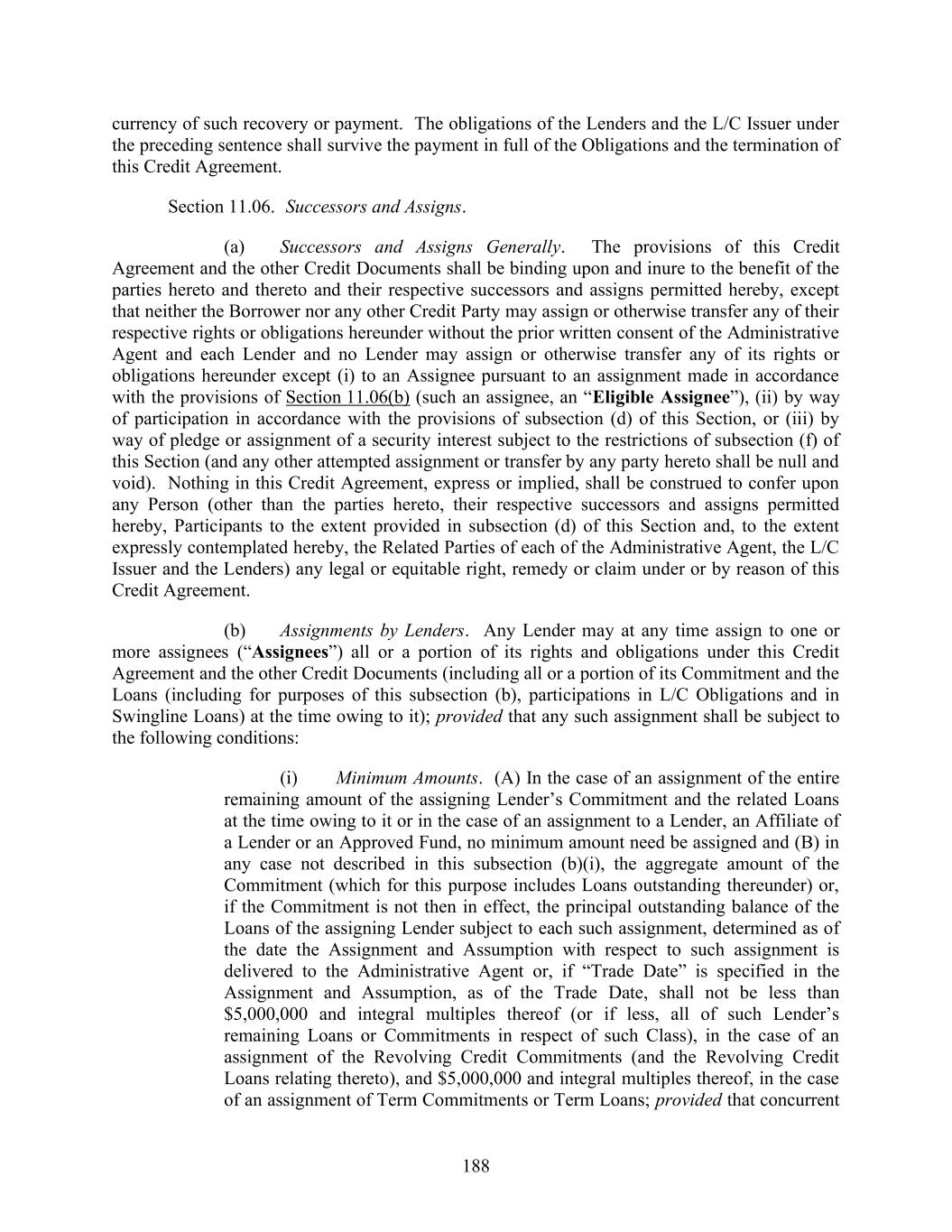 188 currency of such recovery or payment. The obligations of the Lenders and the L/C Issuer under the preceding sentence shall survive the payment in full of the Obligations and the termination of this Credit Agreement. Section 11.06. Successors and Assigns. (a) Successors and Assigns Generally. The provisions of this Credit Agreement and the other Credit Documents shall be binding upon and inure to the benefit of the parties hereto and thereto and their respective successors and assigns permitted hereby, except that neither the Borrower nor any other Credit Party may assign or otherwise transfer any of their respective rights or obligations hereunder without the prior written consent of the Administrative Agent and each Lender and no Lender may assign or otherwise transfer any of its rights or obligations hereunder except (i) to an Assignee pursuant to an assignment made in accordance with the provisions of Section 11.06(b) (such an assignee, an “Eligible Assignee”), (ii) by way of participation in accordance with the provisions of subsection (d) of this Section, or (iii) by way of pledge or assignment of a security interest subject to the restrictions of subsection (f) of this Section (and any other attempted assignment or transfer by any party hereto shall be null and void). Nothing in this Credit Agreement, express or implied, shall be construed to confer upon any Person (other than the parties hereto, their respective successors and assigns permitted hereby, Participants to the extent provided in subsection (d) of this Section and, to the extent expressly contemplated hereby, the Related Parties of each of the Administrative Agent, the L/C Issuer and the Lenders) any legal or equitable right, remedy or claim under or by reason of this Credit Agreement. (b) Assignments by Lenders. Any Lender may at any time assign to one or more assignees (“Assignees”) all or a portion of its rights and obligations under this Credit Agreement and the other Credit Documents (including all or a portion of its Commitment and the Loans (including for purposes of this subsection (b), participations in L/C Obligations and in Swingline Loans) at the time owing to it); provided that any such assignment shall be subject to the following conditions: (i) Minimum Amounts. (A) In the case of an assignment of the entire remaining amount of the assigning Lender’s Commitment and the related Loans at the time owing to it or in the case of an assignment to a Lender, an Affiliate of a Lender or an Approved Fund, no minimum amount need be assigned and (B) in any case not described in this subsection (b)(i), the aggregate amount of the Commitment (which for this purpose includes Loans outstanding thereunder) or, if the Commitment is not then in effect, the principal outstanding balance of the Loans of the assigning Lender subject to each such assignment, determined as of the date the Assignment and Assumption with respect to such assignment is delivered to the Administrative Agent or, if “Trade Date” is specified in the Assignment and Assumption, as of the Trade Date, shall not be less than $5,000,000 and integral multiples thereof (or if less, all of such Lender’s remaining Loans or Commitments in respect of such Class), in the case of an assignment of the Revolving Credit Commitments (and the Revolving Credit Loans relating thereto), and $5,000,000 and integral multiples thereof, in the case of an assignment of Term Commitments or Term Loans; provided that concurrent