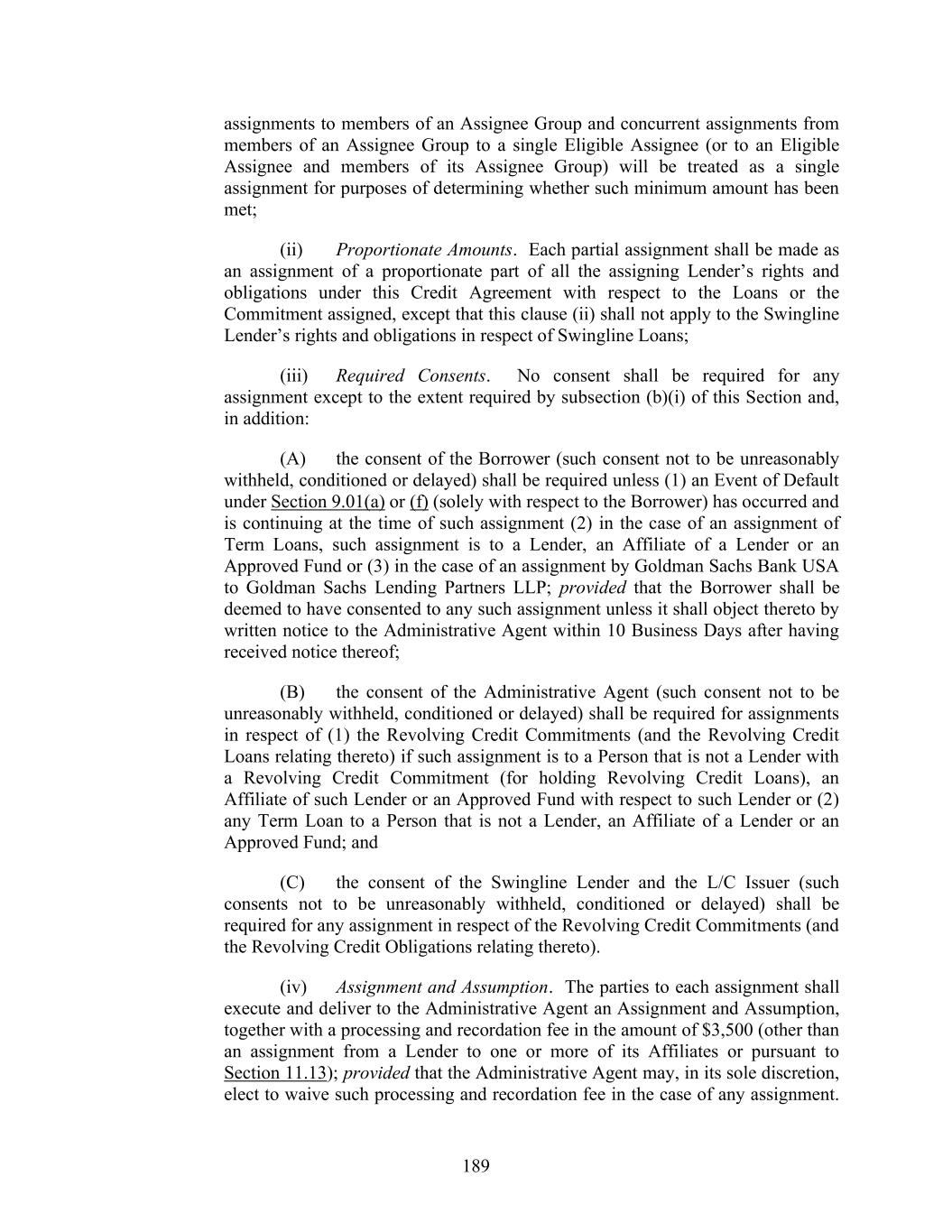 189 assignments to members of an Assignee Group and concurrent assignments from members of an Assignee Group to a single Eligible Assignee (or to an Eligible Assignee and members of its Assignee Group) will be treated as a single assignment for purposes of determining whether such minimum amount has been met; (ii) Proportionate Amounts. Each partial assignment shall be made as an assignment of a proportionate part of all the assigning Lender’s rights and obligations under this Credit Agreement with respect to the Loans or the Commitment assigned, except that this clause (ii) shall not apply to the Swingline Lender’s rights and obligations in respect of Swingline Loans; (iii) Required Consents. No consent shall be required for any assignment except to the extent required by subsection (b)(i) of this Section and, in addition: (A) the consent of the Borrower (such consent not to be unreasonably withheld, conditioned or delayed) shall be required unless (1) an Event of Default under Section 9.01(a) or (f) (solely with respect to the Borrower) has occurred and is continuing at the time of such assignment (2) in the case of an assignment of Term Loans, such assignment is to a Lender, an Affiliate of a Lender or an Approved Fund or (3) in the case of an assignment by Goldman Sachs Bank USA to Goldman Sachs Lending Partners LLP; provided that the Borrower shall be deemed to have consented to any such assignment unless it shall object thereto by written notice to the Administrative Agent within 10 Business Days after having received notice thereof; (B) the consent of the Administrative Agent (such consent not to be unreasonably withheld, conditioned or delayed) shall be required for assignments in respect of (1) the Revolving Credit Commitments (and the Revolving Credit Loans relating thereto) if such assignment is to a Person that is not a Lender with a Revolving Credit Commitment (for holding Revolving Credit Loans), an Affiliate of such Lender or an Approved Fund with respect to such Lender or (2) any Term Loan to a Person that is not a Lender, an Affiliate of a Lender or an Approved Fund; and (C) the consent of the Swingline Lender and the L/C Issuer (such consents not to be unreasonably withheld, conditioned or delayed) shall be required for any assignment in respect of the Revolving Credit Commitments (and the Revolving Credit Obligations relating thereto). (iv) Assignment and Assumption. The parties to each assignment shall execute and deliver to the Administrative Agent an Assignment and Assumption, together with a processing and recordation fee in the amount of $3,500 (other than an assignment from a Lender to one or more of its Affiliates or pursuant to Section 11.13); provided that the Administrative Agent may, in its sole discretion, elect to waive such processing and recordation fee in the case of any assignment.