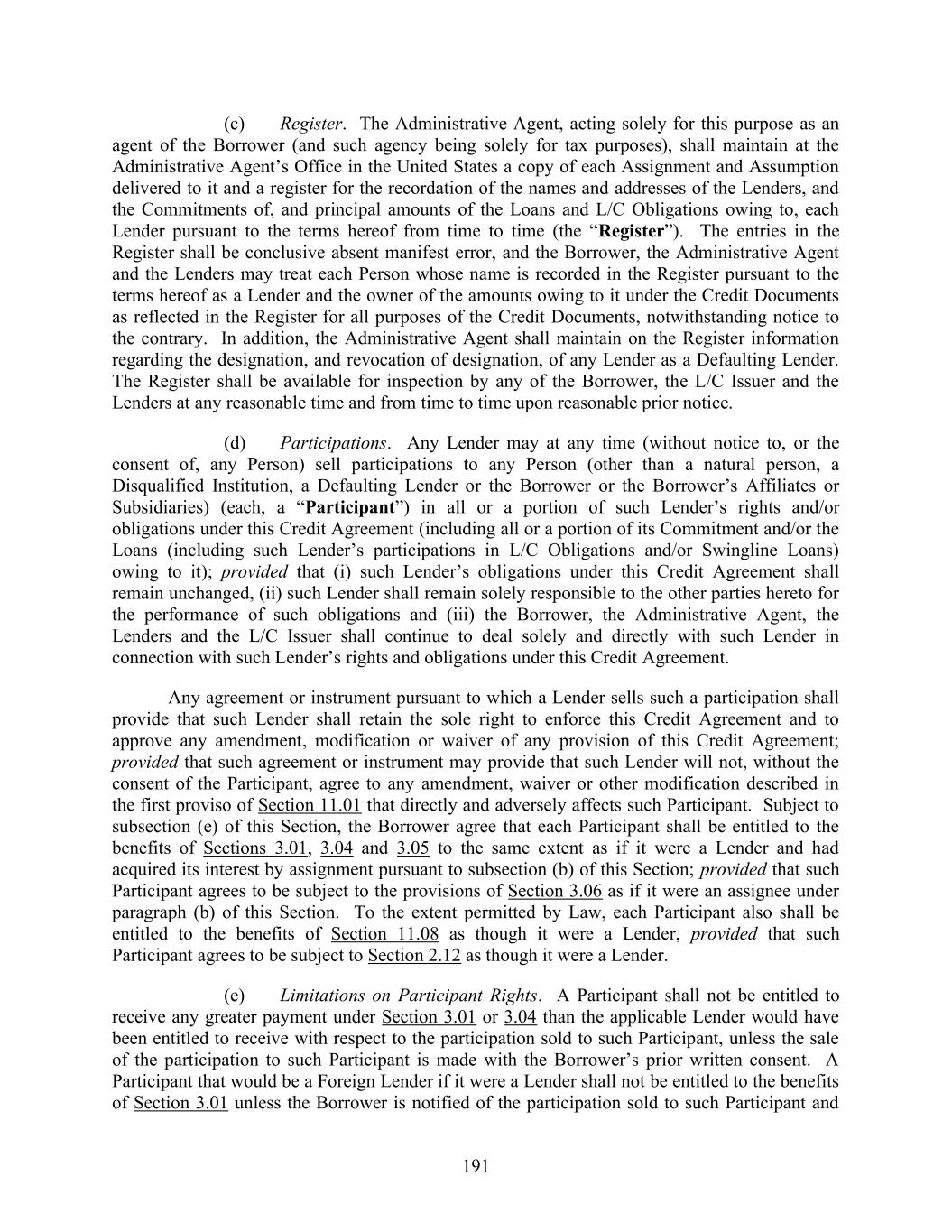191 (c) Register. The Administrative Agent, acting solely for this purpose as an agent of the Borrower (and such agency being solely for tax purposes), shall maintain at the Administrative Agent’s Office in the United States a copy of each Assignment and Assumption delivered to it and a register for the recordation of the names and addresses of the Lenders, and the Commitments of, and principal amounts of the Loans and L/C Obligations owing to, each Lender pursuant to the terms hereof from time to time (the “Register”). The entries in the Register shall be conclusive absent manifest error, and the Borrower, the Administrative Agent and the Lenders may treat each Person whose name is recorded in the Register pursuant to the terms hereof as a Lender and the owner of the amounts owing to it under the Credit Documents as reflected in the Register for all purposes of the Credit Documents, notwithstanding notice to the contrary. In addition, the Administrative Agent shall maintain on the Register information regarding the designation, and revocation of designation, of any Lender as a Defaulting Lender. The Register shall be available for inspection by any of the Borrower, the L/C Issuer and the Lenders at any reasonable time and from time to time upon reasonable prior notice. (d) Participations. Any Lender may at any time (without notice to, or the consent of, any Person) sell participations to any Person (other than a natural person, a Disqualified Institution, a Defaulting Lender or the Borrower or the Borrower’s Affiliates or Subsidiaries) (each, a “Participant”) in all or a portion of such Lender’s rights and/or obligations under this Credit Agreement (including all or a portion of its Commitment and/or the Loans (including such Lender’s participations in L/C Obligations and/or Swingline Loans) owing to it); provided that (i) such Lender’s obligations under this Credit Agreement shall remain unchanged, (ii) such Lender shall remain solely responsible to the other parties hereto for the performance of such obligations and (iii) the Borrower, the Administrative Agent, the Lenders and the L/C Issuer shall continue to deal solely and directly with such Lender in connection with such Lender’s rights and obligations under this Credit Agreement. Any agreement or instrument pursuant to which a Lender sells such a participation shall provide that such Lender shall retain the sole right to enforce this Credit Agreement and to approve any amendment, modification or waiver of any provision of this Credit Agreement; provided that such agreement or instrument may provide that such Lender will not, without the consent of the Participant, agree to any amendment, waiver or other modification described in the first proviso of Section 11.01 that directly and adversely affects such Participant. Subject to subsection (e) of this Section, the Borrower agree that each Participant shall be entitled to the benefits of Sections 3.01, 3.04 and 3.05 to the same extent as if it were a Lender and had acquired its interest by assignment pursuant to subsection (b) of this Section; provided that such Participant agrees to be subject to the provisions of Section 3.06 as if it were an assignee under paragraph (b) of this Section. To the extent permitted by Law, each Participant also shall be entitled to the benefits of Section 11.08 as though it were a Lender, provided that such Participant agrees to be subject to Section 2.12 as though it were a Lender. (e) Limitations on Participant Rights. A Participant shall not be entitled to receive any greater payment under Section 3.01 or 3.04 than the applicable Lender would have been entitled to receive with respect to the participation sold to such Participant, unless the sale of the participation to such Participant is made with the Borrower’s prior written consent. A Participant that would be a Foreign Lender if it were a Lender shall not be entitled to the benefits of Section 3.01 unless the Borrower is notified of the participation sold to such Participant and