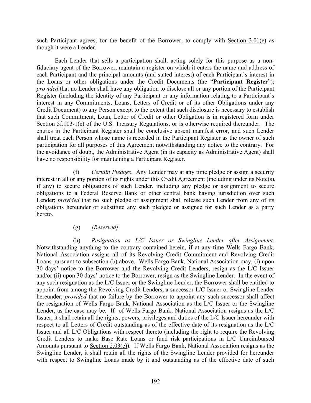 192 such Participant agrees, for the benefit of the Borrower, to comply with Section 3.01(e) as though it were a Lender. Each Lender that sells a participation shall, acting solely for this purpose as a non- fiduciary agent of the Borrower, maintain a register on which it enters the name and address of each Participant and the principal amounts (and stated interest) of each Participant’s interest in the Loans or other obligations under the Credit Documents (the “Participant Register”); provided that no Lender shall have any obligation to disclose all or any portion of the Participant Register (including the identity of any Participant or any information relating to a Participant’s interest in any Commitments, Loans, Letters of Credit or of its other Obligations under any Credit Document) to any Person except to the extent that such disclosure is necessary to establish that such Commitment, Loan, Letter of Credit or other Obligation is in registered form under Section 5f.103-1(c) of the U.S. Treasury Regulations, or is otherwise required thereunder. The entries in the Participant Register shall be conclusive absent manifest error, and such Lender shall treat each Person whose name is recorded in the Participant Register as the owner of such participation for all purposes of this Agreement notwithstanding any notice to the contrary. For the avoidance of doubt, the Administrative Agent (in its capacity as Administrative Agent) shall have no responsibility for maintaining a Participant Register. (f) Certain Pledges. Any Lender may at any time pledge or assign a security interest in all or any portion of its rights under this Credit Agreement (including under its Note(s), if any) to secure obligations of such Lender, including any pledge or assignment to secure obligations to a Federal Reserve Bank or other central bank having jurisdiction over such Lender; provided that no such pledge or assignment shall release such Lender from any of its obligations hereunder or substitute any such pledgee or assignee for such Lender as a party hereto. (g) [Reserved]. (h) Resignation as L/C Issuer or Swingline Lender after Assignment. Notwithstanding anything to the contrary contained herein, if at any time Wells Fargo Bank, National Association assigns all of its Revolving Credit Commitment and Revolving Credit Loans pursuant to subsection (b) above. Wells Fargo Bank, National Association may, (i) upon 30 days’ notice to the Borrower and the Revolving Credit Lenders, resign as the L/C Issuer and/or (ii) upon 30 days’ notice to the Borrower, resign as the Swingline Lender. In the event of any such resignation as the L/C Issuer or the Swingline Lender, the Borrower shall be entitled to appoint from among the Revolving Credit Lenders, a successor L/C Issuer or Swingline Lender hereunder; provided that no failure by the Borrower to appoint any such successor shall affect the resignation of Wells Fargo Bank, National Association as the L/C Issuer or the Swingline Lender, as the case may be. If of Wells Fargo Bank, National Association resigns as the L/C Issuer, it shall retain all the rights, powers, privileges and duties of the L/C Issuer hereunder with respect to all Letters of Credit outstanding as of the effective date of its resignation as the L/C Issuer and all L/C Obligations with respect thereto (including the right to require the Revolving Credit Lenders to make Base Rate Loans or fund risk participations in L/C Unreimbursed Amounts pursuant to Section 2.03(c)). If Wells Fargo Bank, National Association resigns as the Swingline Lender, it shall retain all the rights of the Swingline Lender provided for hereunder with respect to Swingline Loans made by it and outstanding as of the effective date of such