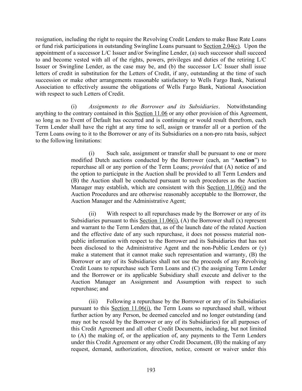 193 resignation, including the right to require the Revolving Credit Lenders to make Base Rate Loans or fund risk participations in outstanding Swingline Loans pursuant to Section 2.04(c). Upon the appointment of a successor L/C Issuer and/or Swingline Lender, (a) such successor shall succeed to and become vested with all of the rights, powers, privileges and duties of the retiring L/C Issuer or Swingline Lender, as the case may be, and (b) the successor L/C Issuer shall issue letters of credit in substitution for the Letters of Credit, if any, outstanding at the time of such succession or make other arrangements reasonable satisfactory to Wells Fargo Bank, National Association to effectively assume the obligations of Wells Fargo Bank, National Association with respect to such Letters of Credit. (i) Assignments to the Borrower and its Subsidiaries. Notwithstanding anything to the contrary contained in this Section 11.06 or any other provision of this Agreement, so long as no Event of Default has occurred and is continuing or would result therefrom, each Term Lender shall have the right at any time to sell, assign or transfer all or a portion of the Term Loans owing to it to the Borrower or any of its Subsidiaries on a non-pro rata basis, subject to the following limitations: (i) Such sale, assignment or transfer shall be pursuant to one or more modified Dutch auctions conducted by the Borrower (each, an “Auction”) to repurchase all or any portion of the Term Loans; provided that (A) notice of and the option to participate in the Auction shall be provided to all Term Lenders and (B) the Auction shall be conducted pursuant to such procedures as the Auction Manager may establish, which are consistent with this Section 11.06(i) and the Auction Procedures and are otherwise reasonably acceptable to the Borrower, the Auction Manager and the Administrative Agent; (ii) With respect to all repurchases made by the Borrower or any of its Subsidiaries pursuant to this Section 11.06(i), (A) the Borrower shall (x) represent and warrant to the Term Lenders that, as of the launch date of the related Auction and the effective date of any such repurchase, it does not possess material non- public information with respect to the Borrower and its Subsidiaries that has not been disclosed to the Administrative Agent and the non-Public Lenders or (y) make a statement that it cannot make such representation and warranty, (B) the Borrower or any of its Subsidiaries shall not use the proceeds of any Revolving Credit Loans to repurchase such Term Loans and (C) the assigning Term Lender and the Borrower or its applicable Subsidiary shall execute and deliver to the Auction Manager an Assignment and Assumption with respect to such repurchase; and (iii) Following a repurchase by the Borrower or any of its Subsidiaries pursuant to this Section 11.06(i), the Term Loans so repurchased shall, without further action by any Person, be deemed canceled and no longer outstanding (and may not be resold by the Borrower or any of its Subsidiaries) for all purposes of this Credit Agreement and all other Credit Documents, including, but not limited to (A) the making of, or the application of, any payments to the Term Lenders under this Credit Agreement or any other Credit Document, (B) the making of any request, demand, authorization, direction, notice, consent or waiver under this