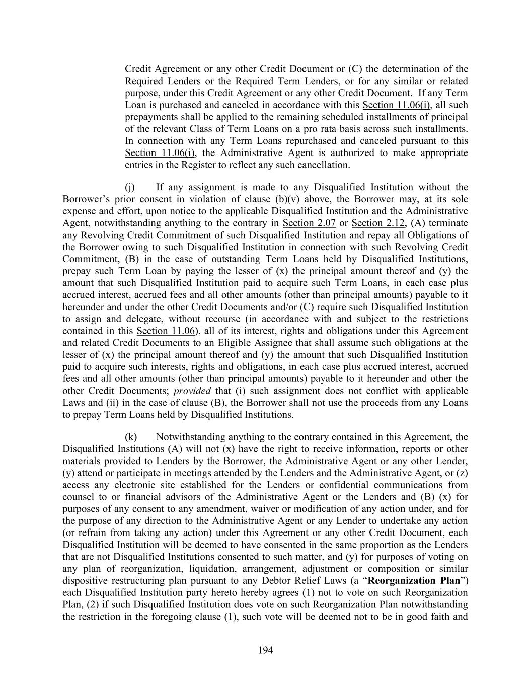 194 Credit Agreement or any other Credit Document or (C) the determination of the Required Lenders or the Required Term Lenders, or for any similar or related purpose, under this Credit Agreement or any other Credit Document. If any Term Loan is purchased and canceled in accordance with this Section 11.06(i), all such prepayments shall be applied to the remaining scheduled installments of principal of the relevant Class of Term Loans on a pro rata basis across such installments. In connection with any Term Loans repurchased and canceled pursuant to this Section 11.06(i), the Administrative Agent is authorized to make appropriate entries in the Register to reflect any such cancellation. (j) If any assignment is made to any Disqualified Institution without the Borrower’s prior consent in violation of clause (b)(v) above, the Borrower may, at its sole expense and effort, upon notice to the applicable Disqualified Institution and the Administrative Agent, notwithstanding anything to the contrary in Section 2.07 or Section 2.12, (A) terminate any Revolving Credit Commitment of such Disqualified Institution and repay all Obligations of the Borrower owing to such Disqualified Institution in connection with such Revolving Credit Commitment, (B) in the case of outstanding Term Loans held by Disqualified Institutions, prepay such Term Loan by paying the lesser of (x) the principal amount thereof and (y) the amount that such Disqualified Institution paid to acquire such Term Loans, in each case plus accrued interest, accrued fees and all other amounts (other than principal amounts) payable to it hereunder and under the other Credit Documents and/or (C) require such Disqualified Institution to assign and delegate, without recourse (in accordance with and subject to the restrictions contained in this Section 11.06), all of its interest, rights and obligations under this Agreement and related Credit Documents to an Eligible Assignee that shall assume such obligations at the lesser of (x) the principal amount thereof and (y) the amount that such Disqualified Institution paid to acquire such interests, rights and obligations, in each case plus accrued interest, accrued fees and all other amounts (other than principal amounts) payable to it hereunder and other the other Credit Documents; provided that (i) such assignment does not conflict with applicable Laws and (ii) in the case of clause (B), the Borrower shall not use the proceeds from any Loans to prepay Term Loans held by Disqualified Institutions. (k) Notwithstanding anything to the contrary contained in this Agreement, the Disqualified Institutions (A) will not (x) have the right to receive information, reports or other materials provided to Lenders by the Borrower, the Administrative Agent or any other Lender, (y) attend or participate in meetings attended by the Lenders and the Administrative Agent, or (z) access any electronic site established for the Lenders or confidential communications from counsel to or financial advisors of the Administrative Agent or the Lenders and (B) (x) for purposes of any consent to any amendment, waiver or modification of any action under, and for the purpose of any direction to the Administrative Agent or any Lender to undertake any action (or refrain from taking any action) under this Agreement or any other Credit Document, each Disqualified Institution will be deemed to have consented in the same proportion as the Lenders that are not Disqualified Institutions consented to such matter, and (y) for purposes of voting on any plan of reorganization, liquidation, arrangement, adjustment or composition or similar dispositive restructuring plan pursuant to any Debtor Relief Laws (a “Reorganization Plan”) each Disqualified Institution party hereto hereby agrees (1) not to vote on such Reorganization Plan, (2) if such Disqualified Institution does vote on such Reorganization Plan notwithstanding the restriction in the foregoing clause (1), such vote will be deemed not to be in good faith and