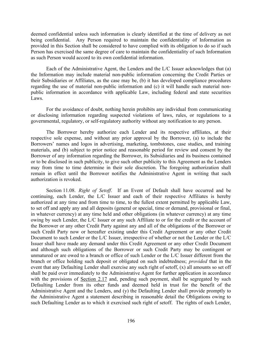 196 deemed confidential unless such information is clearly identified at the time of delivery as not being confidential. Any Person required to maintain the confidentiality of Information as provided in this Section shall be considered to have complied with its obligation to do so if such Person has exercised the same degree of care to maintain the confidentiality of such Information as such Person would accord to its own confidential information. Each of the Administrative Agent, the Lenders and the L/C Issuer acknowledges that (a) the Information may include material non-public information concerning the Credit Parties or their Subsidiaries or Affiliates, as the case may be, (b) it has developed compliance procedures regarding the use of material non-public information and (c) it will handle such material non- public information in accordance with applicable Law, including federal and state securities Laws. For the avoidance of doubt, nothing herein prohibits any individual from communicating or disclosing information regarding suspected violations of laws, rules, or regulations to a governmental, regulatory, or self-regulatory authority without any notification to any person. The Borrower hereby authorize each Lender and its respective affiliates, at their respective sole expense, and without any prior approval by the Borrower, (a) to include the Borrowers’ names and logos in advertising, marketing, tombstones, case studies, and training materials, and (b) subject to prior notice and reasonable period for review and consent by the Borrower of any information regarding the Borrower, its Subsidiaries and its business contained or to be disclosed in such publicity, to give such other publicity to this Agreement as the Lenders may from time to time determine in their sole discretion. The foregoing authorization shall remain in effect until the Borrower notifies the Administrative Agent in writing that such authorization is revoked. Section 11.08. Right of Setoff. If an Event of Default shall have occurred and be continuing, each Lender, the L/C Issuer and each of their respective Affiliates is hereby authorized at any time and from time to time, to the fullest extent permitted by applicable Law, to set off and apply any and all deposits (general or special, time or demand, provisional or final, in whatever currency) at any time held and other obligations (in whatever currency) at any time owing by such Lender, the L/C Issuer or any such Affiliate to or for the credit or the account of the Borrower or any other Credit Party against any and all of the obligations of the Borrower or such Credit Party now or hereafter existing under this Credit Agreement or any other Credit Document to such Lender or the L/C Issuer, irrespective of whether or not the Lender or the L/C Issuer shall have made any demand under this Credit Agreement or any other Credit Document and although such obligations of the Borrower or such Credit Party may be contingent or unmatured or are owed to a branch or office of such Lender or the L/C Issuer different from the branch or office holding such deposit or obligated on such indebtedness; provided that in the event that any Defaulting Lender shall exercise any such right of setoff, (x) all amounts so set off shall be paid over immediately to the Administrative Agent for further application in accordance with the provisions of Section 2.17 and, pending such payment, shall be segregated by such Defaulting Lender from its other funds and deemed held in trust for the benefit of the Administrative Agent and the Lenders, and (y) the Defaulting Lender shall provide promptly to the Administrative Agent a statement describing in reasonable detail the Obligations owing to such Defaulting Lender as to which it exercised such right of setoff. The rights of each Lender,