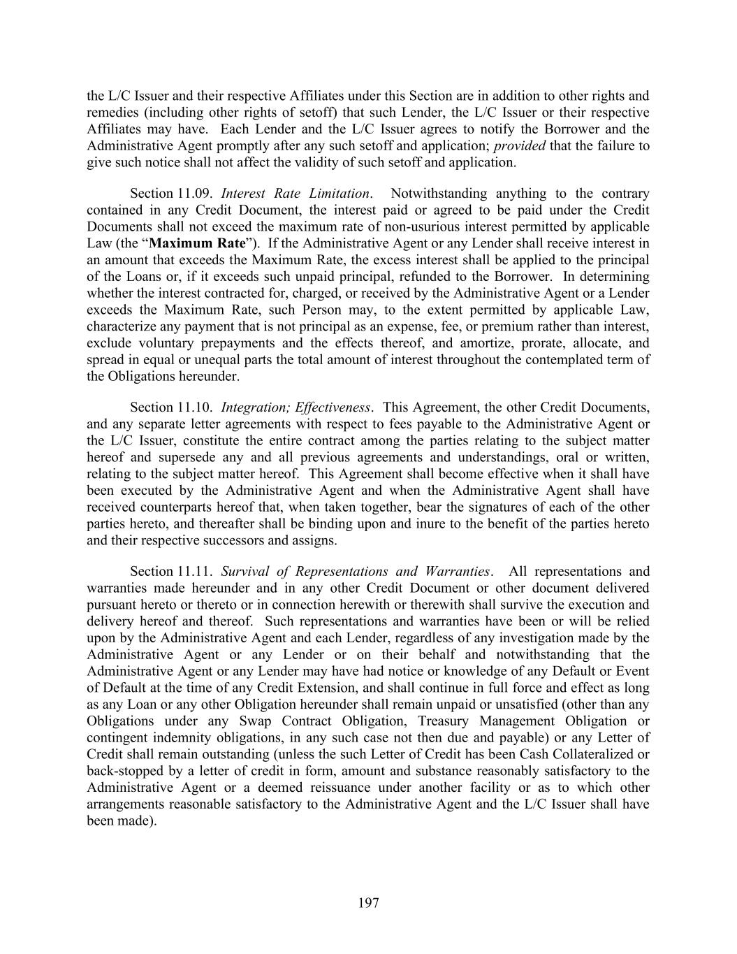197 the L/C Issuer and their respective Affiliates under this Section are in addition to other rights and remedies (including other rights of setoff) that such Lender, the L/C Issuer or their respective Affiliates may have. Each Lender and the L/C Issuer agrees to notify the Borrower and the Administrative Agent promptly after any such setoff and application; provided that the failure to give such notice shall not affect the validity of such setoff and application. Section 11.09. Interest Rate Limitation. Notwithstanding anything to the contrary contained in any Credit Document, the interest paid or agreed to be paid under the Credit Documents shall not exceed the maximum rate of non-usurious interest permitted by applicable Law (the “Maximum Rate”). If the Administrative Agent or any Lender shall receive interest in an amount that exceeds the Maximum Rate, the excess interest shall be applied to the principal of the Loans or, if it exceeds such unpaid principal, refunded to the Borrower. In determining whether the interest contracted for, charged, or received by the Administrative Agent or a Lender exceeds the Maximum Rate, such Person may, to the extent permitted by applicable Law, characterize any payment that is not principal as an expense, fee, or premium rather than interest, exclude voluntary prepayments and the effects thereof, and amortize, prorate, allocate, and spread in equal or unequal parts the total amount of interest throughout the contemplated term of the Obligations hereunder. Section 11.10. Integration; Effectiveness. This Agreement, the other Credit Documents, and any separate letter agreements with respect to fees payable to the Administrative Agent or the L/C Issuer, constitute the entire contract among the parties relating to the subject matter hereof and supersede any and all previous agreements and understandings, oral or written, relating to the subject matter hereof. This Agreement shall become effective when it shall have been executed by the Administrative Agent and when the Administrative Agent shall have received counterparts hereof that, when taken together, bear the signatures of each of the other parties hereto, and thereafter shall be binding upon and inure to the benefit of the parties hereto and their respective successors and assigns. Section 11.11. Survival of Representations and Warranties. All representations and warranties made hereunder and in any other Credit Document or other document delivered pursuant hereto or thereto or in connection herewith or therewith shall survive the execution and delivery hereof and thereof. Such representations and warranties have been or will be relied upon by the Administrative Agent and each Lender, regardless of any investigation made by the Administrative Agent or any Lender or on their behalf and notwithstanding that the Administrative Agent or any Lender may have had notice or knowledge of any Default or Event of Default at the time of any Credit Extension, and shall continue in full force and effect as long as any Loan or any other Obligation hereunder shall remain unpaid or unsatisfied (other than any Obligations under any Swap Contract Obligation, Treasury Management Obligation or contingent indemnity obligations, in any such case not then due and payable) or any Letter of Credit shall remain outstanding (unless the such Letter of Credit has been Cash Collateralized or back-stopped by a letter of credit in form, amount and substance reasonably satisfactory to the Administrative Agent or a deemed reissuance under another facility or as to which other arrangements reasonable satisfactory to the Administrative Agent and the L/C Issuer shall have been made).