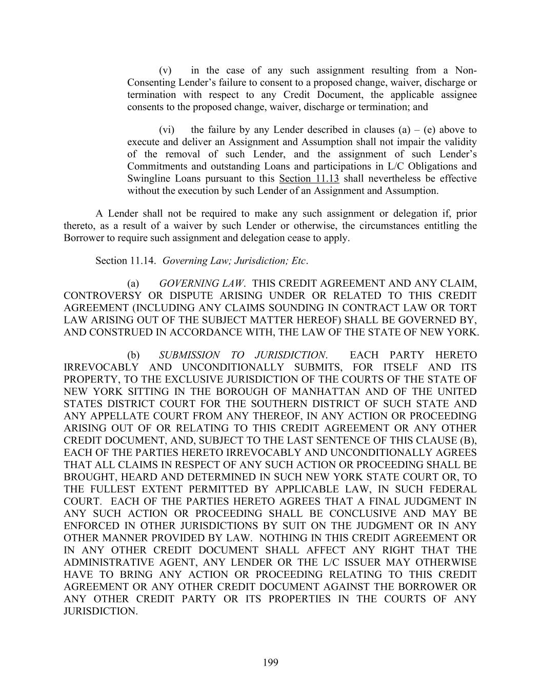 199 (v) in the case of any such assignment resulting from a Non- Consenting Lender’s failure to consent to a proposed change, waiver, discharge or termination with respect to any Credit Document, the applicable assignee consents to the proposed change, waiver, discharge or termination; and (vi) the failure by any Lender described in clauses (a) – (e) above to execute and deliver an Assignment and Assumption shall not impair the validity of the removal of such Lender, and the assignment of such Lender’s Commitments and outstanding Loans and participations in L/C Obligations and Swingline Loans pursuant to this Section 11.13 shall nevertheless be effective without the execution by such Lender of an Assignment and Assumption. A Lender shall not be required to make any such assignment or delegation if, prior thereto, as a result of a waiver by such Lender or otherwise, the circumstances entitling the Borrower to require such assignment and delegation cease to apply. Section 11.14. Governing Law; Jurisdiction; Etc. (a) GOVERNING LAW. THIS CREDIT AGREEMENT AND ANY CLAIM, CONTROVERSY OR DISPUTE ARISING UNDER OR RELATED TO THIS CREDIT AGREEMENT (INCLUDING ANY CLAIMS SOUNDING IN CONTRACT LAW OR TORT LAW ARISING OUT OF THE SUBJECT MATTER HEREOF) SHALL BE GOVERNED BY, AND CONSTRUED IN ACCORDANCE WITH, THE LAW OF THE STATE OF NEW YORK. (b) SUBMISSION TO JURISDICTION. EACH PARTY HERETO IRREVOCABLY AND UNCONDITIONALLY SUBMITS, FOR ITSELF AND ITS PROPERTY, TO THE EXCLUSIVE JURISDICTION OF THE COURTS OF THE STATE OF NEW YORK SITTING IN THE BOROUGH OF MANHATTAN AND OF THE UNITED STATES DISTRICT COURT FOR THE SOUTHERN DISTRICT OF SUCH STATE AND ANY APPELLATE COURT FROM ANY THEREOF, IN ANY ACTION OR PROCEEDING ARISING OUT OF OR RELATING TO THIS CREDIT AGREEMENT OR ANY OTHER CREDIT DOCUMENT, AND, SUBJECT TO THE LAST SENTENCE OF THIS CLAUSE (B), EACH OF THE PARTIES HERETO IRREVOCABLY AND UNCONDITIONALLY AGREES THAT ALL CLAIMS IN RESPECT OF ANY SUCH ACTION OR PROCEEDING SHALL BE BROUGHT, HEARD AND DETERMINED IN SUCH NEW YORK STATE COURT OR, TO THE FULLEST EXTENT PERMITTED BY APPLICABLE LAW, IN SUCH FEDERAL COURT. EACH OF THE PARTIES HERETO AGREES THAT A FINAL JUDGMENT IN ANY SUCH ACTION OR PROCEEDING SHALL BE CONCLUSIVE AND MAY BE ENFORCED IN OTHER JURISDICTIONS BY SUIT ON THE JUDGMENT OR IN ANY OTHER MANNER PROVIDED BY LAW. NOTHING IN THIS CREDIT AGREEMENT OR IN ANY OTHER CREDIT DOCUMENT SHALL AFFECT ANY RIGHT THAT THE ADMINISTRATIVE AGENT, ANY LENDER OR THE L/C ISSUER MAY OTHERWISE HAVE TO BRING ANY ACTION OR PROCEEDING RELATING TO THIS CREDIT AGREEMENT OR ANY OTHER CREDIT DOCUMENT AGAINST THE BORROWER OR ANY OTHER CREDIT PARTY OR ITS PROPERTIES IN THE COURTS OF ANY JURISDICTION.