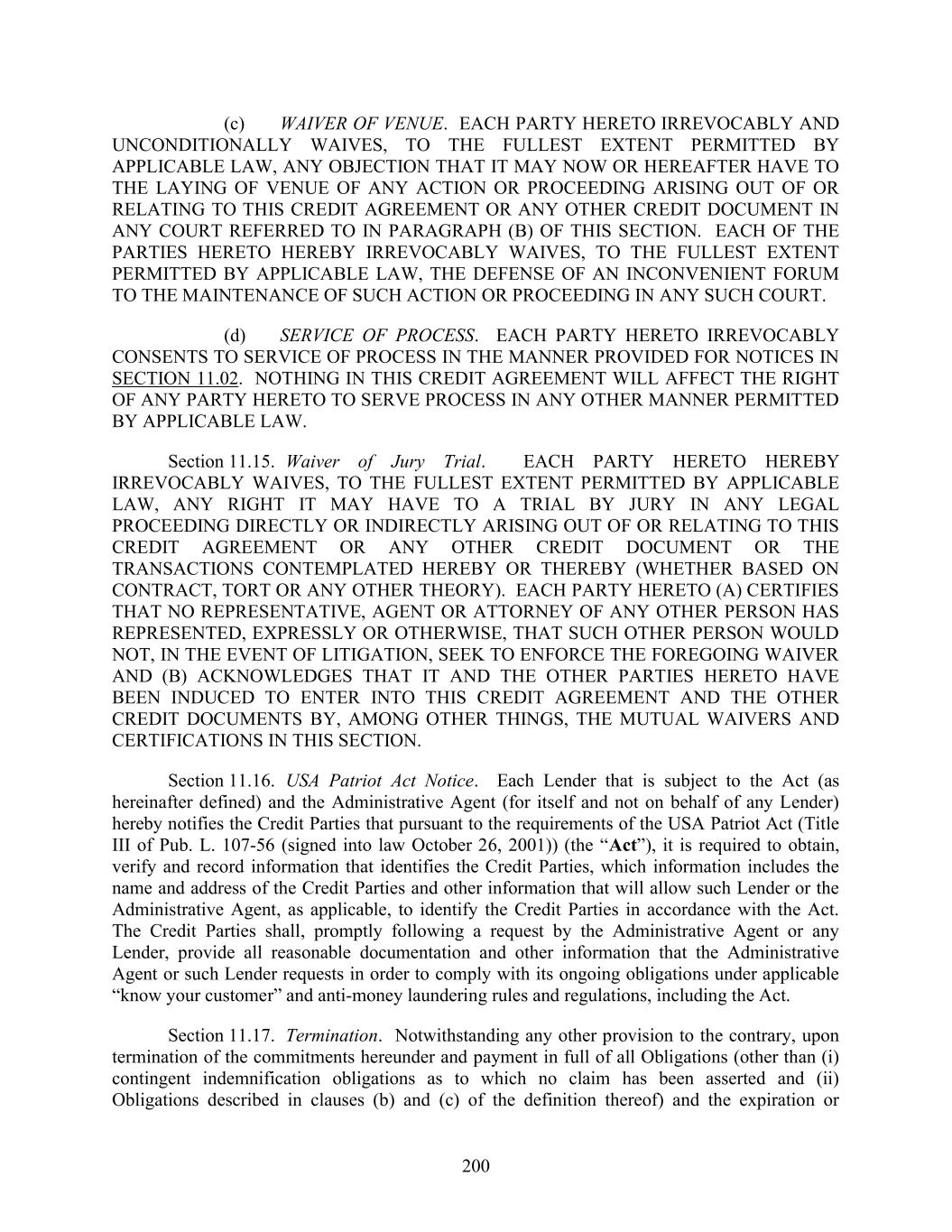 200 (c) WAIVER OF VENUE. EACH PARTY HERETO IRREVOCABLY AND UNCONDITIONALLY WAIVES, TO THE FULLEST EXTENT PERMITTED BY APPLICABLE LAW, ANY OBJECTION THAT IT MAY NOW OR HEREAFTER HAVE TO THE LAYING OF VENUE OF ANY ACTION OR PROCEEDING ARISING OUT OF OR RELATING TO THIS CREDIT AGREEMENT OR ANY OTHER CREDIT DOCUMENT IN ANY COURT REFERRED TO IN PARAGRAPH (B) OF THIS SECTION. EACH OF THE PARTIES HERETO HEREBY IRREVOCABLY WAIVES, TO THE FULLEST EXTENT PERMITTED BY APPLICABLE LAW, THE DEFENSE OF AN INCONVENIENT FORUM TO THE MAINTENANCE OF SUCH ACTION OR PROCEEDING IN ANY SUCH COURT. (d) SERVICE OF PROCESS. EACH PARTY HERETO IRREVOCABLY CONSENTS TO SERVICE OF PROCESS IN THE MANNER PROVIDED FOR NOTICES IN SECTION 11.02. NOTHING IN THIS CREDIT AGREEMENT WILL AFFECT THE RIGHT OF ANY PARTY HERETO TO SERVE PROCESS IN ANY OTHER MANNER PERMITTED BY APPLICABLE LAW. Section 11.15. Waiver of Jury Trial. EACH PARTY HERETO HEREBY IRREVOCABLY WAIVES, TO THE FULLEST EXTENT PERMITTED BY APPLICABLE LAW, ANY RIGHT IT MAY HAVE TO A TRIAL BY JURY IN ANY LEGAL PROCEEDING DIRECTLY OR INDIRECTLY ARISING OUT OF OR RELATING TO THIS CREDIT AGREEMENT OR ANY OTHER CREDIT DOCUMENT OR THE TRANSACTIONS CONTEMPLATED HEREBY OR THEREBY (WHETHER BASED ON CONTRACT, TORT OR ANY OTHER THEORY). EACH PARTY HERETO (A) CERTIFIES THAT NO REPRESENTATIVE, AGENT OR ATTORNEY OF ANY OTHER PERSON HAS REPRESENTED, EXPRESSLY OR OTHERWISE, THAT SUCH OTHER PERSON WOULD NOT, IN THE EVENT OF LITIGATION, SEEK TO ENFORCE THE FOREGOING WAIVER AND (B) ACKNOWLEDGES THAT IT AND THE OTHER PARTIES HERETO HAVE BEEN INDUCED TO ENTER INTO THIS CREDIT AGREEMENT AND THE OTHER CREDIT DOCUMENTS BY, AMONG OTHER THINGS, THE MUTUAL WAIVERS AND CERTIFICATIONS IN THIS SECTION. Section 11.16. USA Patriot Act Notice. Each Lender that is subject to the Act (as hereinafter defined) and the Administrative Agent (for itself and not on behalf of any Lender) hereby notifies the Credit Parties that pursuant to the requirements of the USA Patriot Act (Title III of Pub. L. 107-56 (signed into law October 26, 2001)) (the “Act”), it is required to obtain, verify and record information that identifies the Credit Parties, which information includes the name and address of the Credit Parties and other information that will allow such Lender or the Administrative Agent, as applicable, to identify the Credit Parties in accordance with the Act. The Credit Parties shall, promptly following a request by the Administrative Agent or any Lender, provide all reasonable documentation and other information that the Administrative Agent or such Lender requests in order to comply with its ongoing obligations under applicable “know your customer” and anti-money laundering rules and regulations, including the Act. Section 11.17. Termination. Notwithstanding any other provision to the contrary, upon termination of the commitments hereunder and payment in full of all Obligations (other than (i) contingent indemnification obligations as to which no claim has been asserted and (ii) Obligations described in clauses (b) and (c) of the definition thereof) and the expiration or