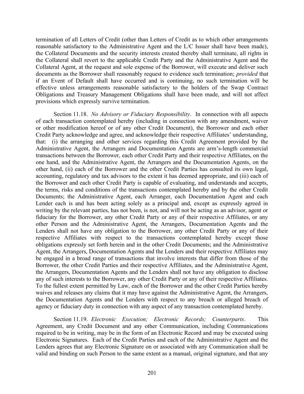201 termination of all Letters of Credit (other than Letters of Credit as to which other arrangements reasonable satisfactory to the Administrative Agent and the L/C Issuer shall have been made), the Collateral Documents and the security interests created thereby shall terminate, all rights in the Collateral shall revert to the applicable Credit Party and the Administrative Agent and the Collateral Agent, at the request and sole expense of the Borrower, will execute and deliver such documents as the Borrower shall reasonably request to evidence such termination; provided that if an Event of Default shall have occurred and is continuing, no such termination will be effective unless arrangements reasonable satisfactory to the holders of the Swap Contract Obligations and Treasury Management Obligations shall have been made, and will not affect provisions which expressly survive termination. Section 11.18. No Advisory or Fiduciary Responsibility. In connection with all aspects of each transaction contemplated hereby (including in connection with any amendment, waiver or other modification hereof or of any other Credit Document), the Borrower and each other Credit Party acknowledge and agree, and acknowledge their respective Affiliates’ understanding, that: (i) the arranging and other services regarding this Credit Agreement provided by the Administrative Agent, the Arrangers and Documentation Agents are arm’s-length commercial transactions between the Borrower, each other Credit Party and their respective Affiliates, on the one hand, and the Administrative Agent, the Arrangers and the Documentation Agents, on the other hand, (ii) each of the Borrower and the other Credit Parties has consulted its own legal, accounting, regulatory and tax advisors to the extent it has deemed appropriate, and (iii) each of the Borrower and each other Credit Party is capable of evaluating, and understands and accepts, the terms, risks and conditions of the transactions contemplated hereby and by the other Credit Documents; the Administrative Agent, each Arranger, each Documentation Agent and each Lender each is and has been acting solely as a principal and, except as expressly agreed in writing by the relevant parties, has not been, is not, and will not be acting as an advisor, agent or fiduciary for the Borrower, any other Credit Party or any of their respective Affiliates, or any other Person and the Administrative Agent, the Arrangers, Documentation Agents and the Lenders shall not have any obligation to the Borrower, any other Credit Party or any of their respective Affiliates with respect to the transactions contemplated hereby except those obligations expressly set forth herein and in the other Credit Documents; and the Administrative Agent, the Arrangers, Documentation Agents and the Lenders and their respective Affiliates may be engaged in a broad range of transactions that involve interests that differ from those of the Borrower, the other Credit Parties and their respective Affiliates, and the Administrative Agent, the Arrangers, Documentation Agents and the Lenders shall not have any obligation to disclose any of such interests to the Borrower, any other Credit Party or any of their respective Affiliates. To the fullest extent permitted by Law, each of the Borrower and the other Credit Parties hereby waives and releases any claims that it may have against the Administrative Agent, the Arrangers, the Documentation Agents and the Lenders with respect to any breach or alleged breach of agency or fiduciary duty in connection with any aspect of any transaction contemplated hereby. Section 11.19. Electronic Execution; Electronic Records; Counterparts. This Agreement, any Credit Document and any other Communication, including Communications required to be in writing, may be in the form of an Electronic Record and may be executed using Electronic Signatures. Each of the Credit Parties and each of the Administrative Agent and the Lenders agrees that any Electronic Signature on or associated with any Communication shall be valid and binding on such Person to the same extent as a manual, original signature, and that any