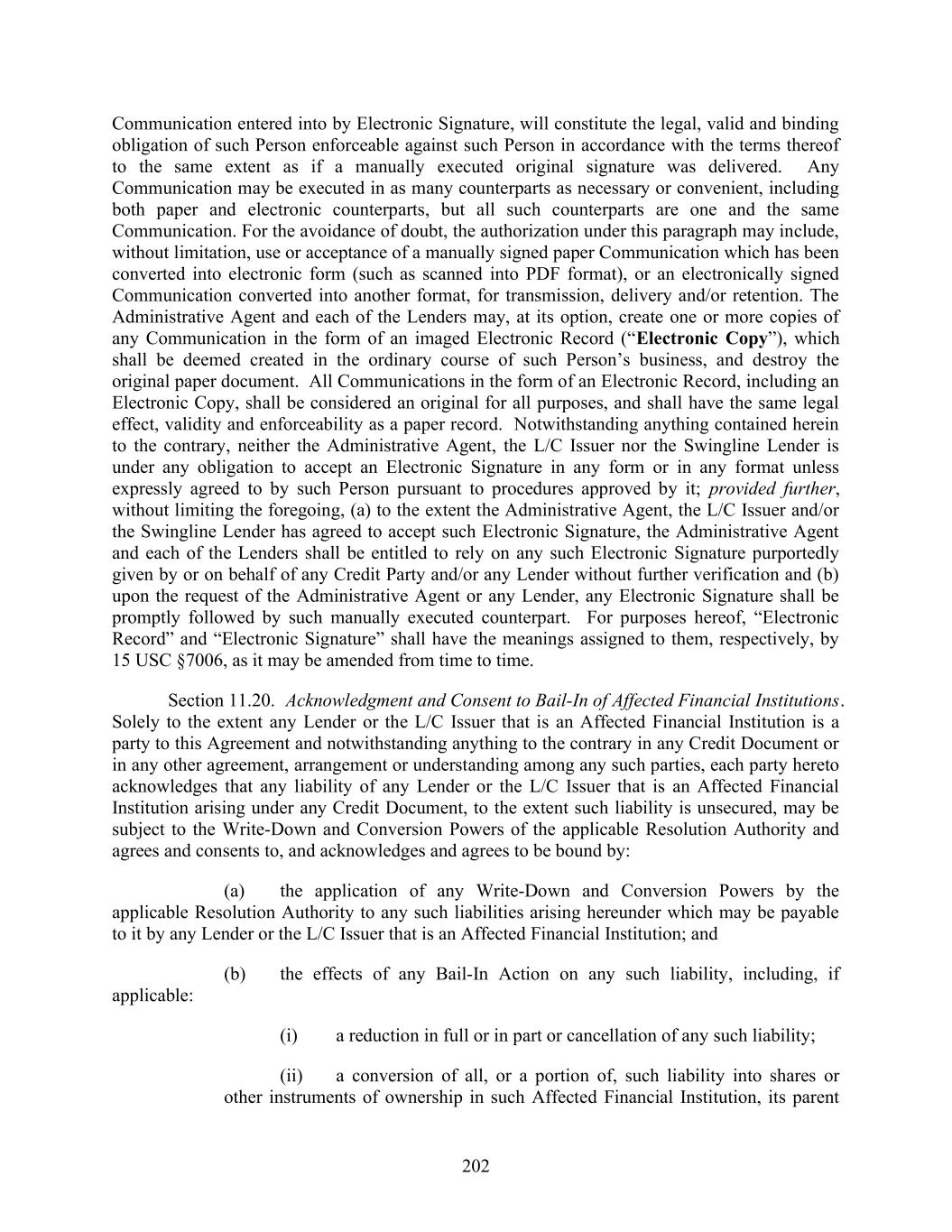 202 Communication entered into by Electronic Signature, will constitute the legal, valid and binding obligation of such Person enforceable against such Person in accordance with the terms thereof to the same extent as if a manually executed original signature was delivered. Any Communication may be executed in as many counterparts as necessary or convenient, including both paper and electronic counterparts, but all such counterparts are one and the same Communication. For the avoidance of doubt, the authorization under this paragraph may include, without limitation, use or acceptance of a manually signed paper Communication which has been converted into electronic form (such as scanned into PDF format), or an electronically signed Communication converted into another format, for transmission, delivery and/or retention. The Administrative Agent and each of the Lenders may, at its option, create one or more copies of any Communication in the form of an imaged Electronic Record (“Electronic Copy”), which shall be deemed created in the ordinary course of such Person’s business, and destroy the original paper document. All Communications in the form of an Electronic Record, including an Electronic Copy, shall be considered an original for all purposes, and shall have the same legal effect, validity and enforceability as a paper record. Notwithstanding anything contained herein to the contrary, neither the Administrative Agent, the L/C Issuer nor the Swingline Lender is under any obligation to accept an Electronic Signature in any form or in any format unless expressly agreed to by such Person pursuant to procedures approved by it; provided further, without limiting the foregoing, (a) to the extent the Administrative Agent, the L/C Issuer and/or the Swingline Lender has agreed to accept such Electronic Signature, the Administrative Agent and each of the Lenders shall be entitled to rely on any such Electronic Signature purportedly given by or on behalf of any Credit Party and/or any Lender without further verification and (b) upon the request of the Administrative Agent or any Lender, any Electronic Signature shall be promptly followed by such manually executed counterpart. For purposes hereof, “Electronic Record” and “Electronic Signature” shall have the meanings assigned to them, respectively, by 15 USC §7006, as it may be amended from time to time. Section 11.20. Acknowledgment and Consent to Bail-In of Affected Financial Institutions. Solely to the extent any Lender or the L/C Issuer that is an Affected Financial Institution is a party to this Agreement and notwithstanding anything to the contrary in any Credit Document or in any other agreement, arrangement or understanding among any such parties, each party hereto acknowledges that any liability of any Lender or the L/C Issuer that is an Affected Financial Institution arising under any Credit Document, to the extent such liability is unsecured, may be subject to the Write-Down and Conversion Powers of the applicable Resolution Authority and agrees and consents to, and acknowledges and agrees to be bound by: (a) the application of any Write-Down and Conversion Powers by the applicable Resolution Authority to any such liabilities arising hereunder which may be payable to it by any Lender or the L/C Issuer that is an Affected Financial Institution; and (b) the effects of any Bail-In Action on any such liability, including, if applicable: (i) a reduction in full or in part or cancellation of any such liability; (ii) a conversion of all, or a portion of, such liability into shares or other instruments of ownership in such Affected Financial Institution, its parent