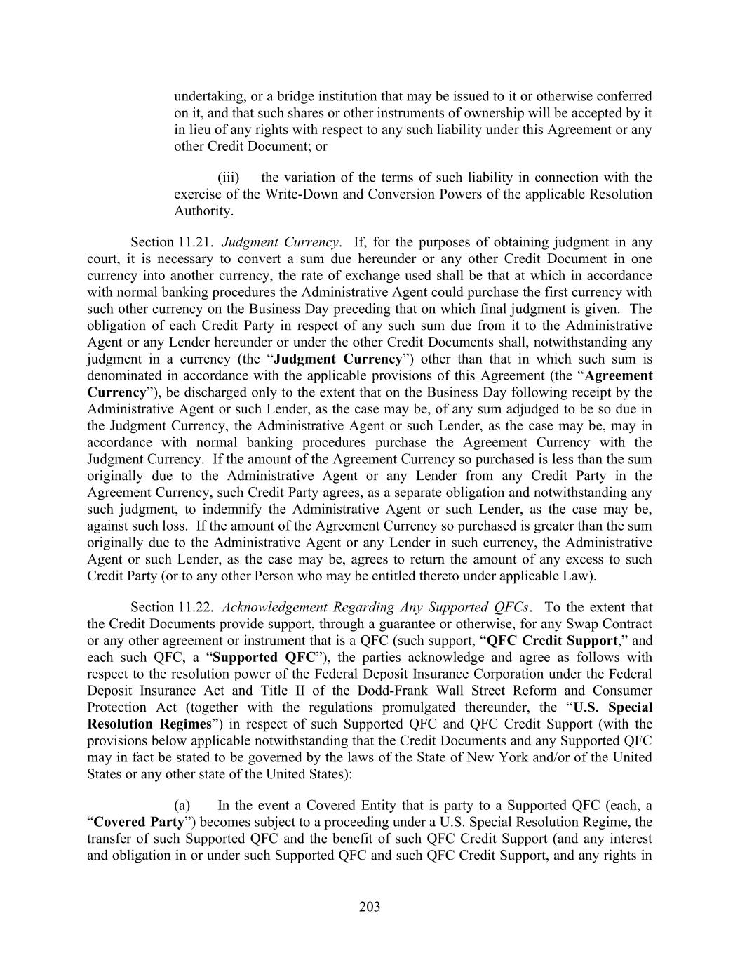 203 undertaking, or a bridge institution that may be issued to it or otherwise conferred on it, and that such shares or other instruments of ownership will be accepted by it in lieu of any rights with respect to any such liability under this Agreement or any other Credit Document; or (iii) the variation of the terms of such liability in connection with the exercise of the Write-Down and Conversion Powers of the applicable Resolution Authority. Section 11.21. Judgment Currency. If, for the purposes of obtaining judgment in any court, it is necessary to convert a sum due hereunder or any other Credit Document in one currency into another currency, the rate of exchange used shall be that at which in accordance with normal banking procedures the Administrative Agent could purchase the first currency with such other currency on the Business Day preceding that on which final judgment is given. The obligation of each Credit Party in respect of any such sum due from it to the Administrative Agent or any Lender hereunder or under the other Credit Documents shall, notwithstanding any judgment in a currency (the “Judgment Currency”) other than that in which such sum is denominated in accordance with the applicable provisions of this Agreement (the “Agreement Currency”), be discharged only to the extent that on the Business Day following receipt by the Administrative Agent or such Lender, as the case may be, of any sum adjudged to be so due in the Judgment Currency, the Administrative Agent or such Lender, as the case may be, may in accordance with normal banking procedures purchase the Agreement Currency with the Judgment Currency. If the amount of the Agreement Currency so purchased is less than the sum originally due to the Administrative Agent or any Lender from any Credit Party in the Agreement Currency, such Credit Party agrees, as a separate obligation and notwithstanding any such judgment, to indemnify the Administrative Agent or such Lender, as the case may be, against such loss. If the amount of the Agreement Currency so purchased is greater than the sum originally due to the Administrative Agent or any Lender in such currency, the Administrative Agent or such Lender, as the case may be, agrees to return the amount of any excess to such Credit Party (or to any other Person who may be entitled thereto under applicable Law). Section 11.22. Acknowledgement Regarding Any Supported QFCs. To the extent that the Credit Documents provide support, through a guarantee or otherwise, for any Swap Contract or any other agreement or instrument that is a QFC (such support, “QFC Credit Support,” and each such QFC, a “Supported QFC”), the parties acknowledge and agree as follows with respect to the resolution power of the Federal Deposit Insurance Corporation under the Federal Deposit Insurance Act and Title II of the Dodd-Frank Wall Street Reform and Consumer Protection Act (together with the regulations promulgated thereunder, the “U.S. Special Resolution Regimes”) in respect of such Supported QFC and QFC Credit Support (with the provisions below applicable notwithstanding that the Credit Documents and any Supported QFC may in fact be stated to be governed by the laws of the State of New York and/or of the United States or any other state of the United States): (a) In the event a Covered Entity that is party to a Supported QFC (each, a “Covered Party”) becomes subject to a proceeding under a U.S. Special Resolution Regime, the transfer of such Supported QFC and the benefit of such QFC Credit Support (and any interest and obligation in or under such Supported QFC and such QFC Credit Support, and any rights in