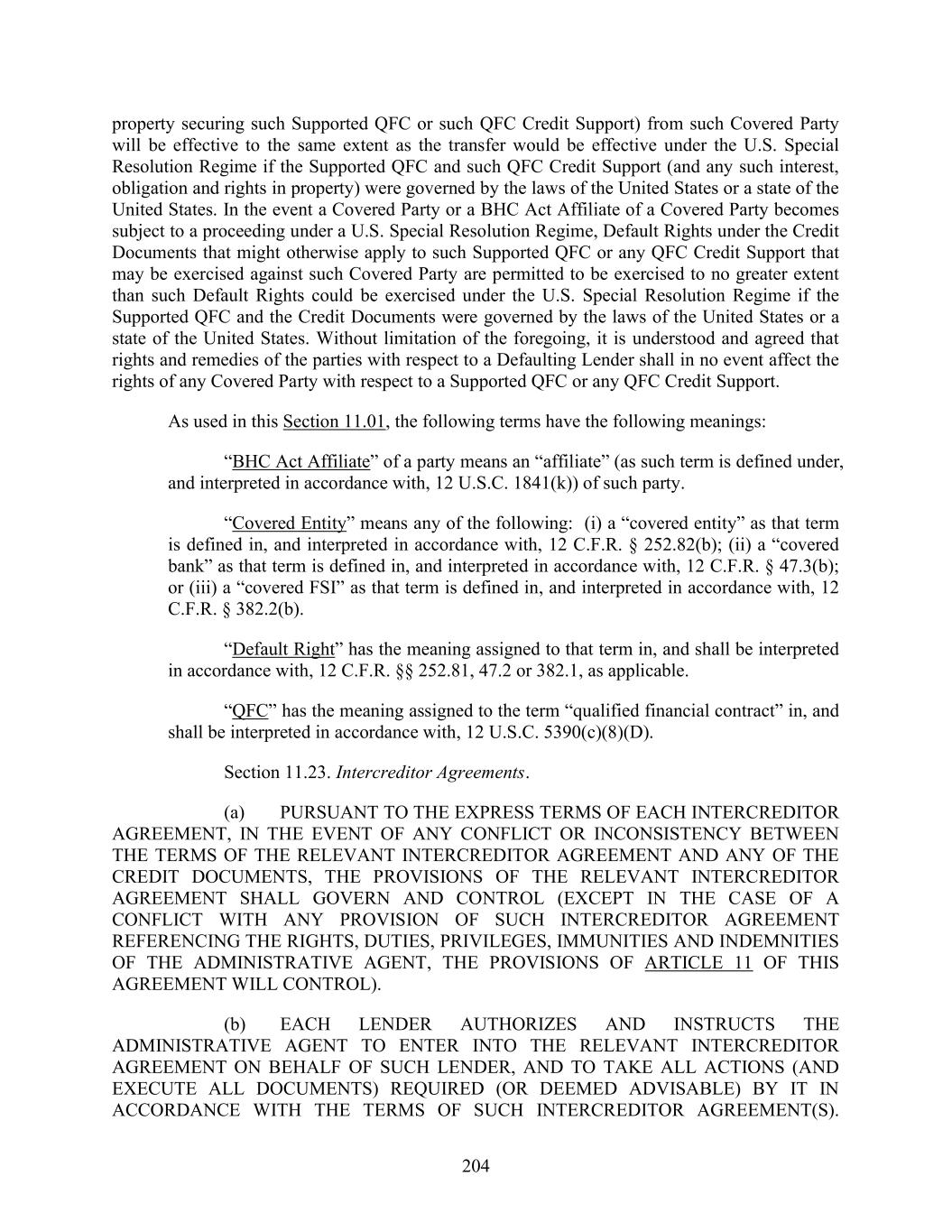 204 property securing such Supported QFC or such QFC Credit Support) from such Covered Party will be effective to the same extent as the transfer would be effective under the U.S. Special Resolution Regime if the Supported QFC and such QFC Credit Support (and any such interest, obligation and rights in property) were governed by the laws of the United States or a state of the United States. In the event a Covered Party or a BHC Act Affiliate of a Covered Party becomes subject to a proceeding under a U.S. Special Resolution Regime, Default Rights under the Credit Documents that might otherwise apply to such Supported QFC or any QFC Credit Support that may be exercised against such Covered Party are permitted to be exercised to no greater extent than such Default Rights could be exercised under the U.S. Special Resolution Regime if the Supported QFC and the Credit Documents were governed by the laws of the United States or a state of the United States. Without limitation of the foregoing, it is understood and agreed that rights and remedies of the parties with respect to a Defaulting Lender shall in no event affect the rights of any Covered Party with respect to a Supported QFC or any QFC Credit Support. As used in this Section 11.01, the following terms have the following meanings: “BHC Act Affiliate” of a party means an “affiliate” (as such term is defined under, and interpreted in accordance with, 12 U.S.C. 1841(k)) of such party. “Covered Entity” means any of the following: (i) a “covered entity” as that term is defined in, and interpreted in accordance with, 12 C.F.R. § 252.82(b); (ii) a “covered bank” as that term is defined in, and interpreted in accordance with, 12 C.F.R. § 47.3(b); or (iii) a “covered FSI” as that term is defined in, and interpreted in accordance with, 12 C.F.R. § 382.2(b). “Default Right” has the meaning assigned to that term in, and shall be interpreted in accordance with, 12 C.F.R. §§ 252.81, 47.2 or 382.1, as applicable. “QFC” has the meaning assigned to the term “qualified financial contract” in, and shall be interpreted in accordance with, 12 U.S.C. 5390(c)(8)(D). Section 11.23. Intercreditor Agreements. (a) PURSUANT TO THE EXPRESS TERMS OF EACH INTERCREDITOR AGREEMENT, IN THE EVENT OF ANY CONFLICT OR INCONSISTENCY BETWEEN THE TERMS OF THE RELEVANT INTERCREDITOR AGREEMENT AND ANY OF THE CREDIT DOCUMENTS, THE PROVISIONS OF THE RELEVANT INTERCREDITOR AGREEMENT SHALL GOVERN AND CONTROL (EXCEPT IN THE CASE OF A CONFLICT WITH ANY PROVISION OF SUCH INTERCREDITOR AGREEMENT REFERENCING THE RIGHTS, DUTIES, PRIVILEGES, IMMUNITIES AND INDEMNITIES OF THE ADMINISTRATIVE AGENT, THE PROVISIONS OF ARTICLE 11 OF THIS AGREEMENT WILL CONTROL). (b) EACH LENDER AUTHORIZES AND INSTRUCTS THE ADMINISTRATIVE AGENT TO ENTER INTO THE RELEVANT INTERCREDITOR AGREEMENT ON BEHALF OF SUCH LENDER, AND TO TAKE ALL ACTIONS (AND EXECUTE ALL DOCUMENTS) REQUIRED (OR DEEMED ADVISABLE) BY IT IN ACCORDANCE WITH THE TERMS OF SUCH INTERCREDITOR AGREEMENT(S).