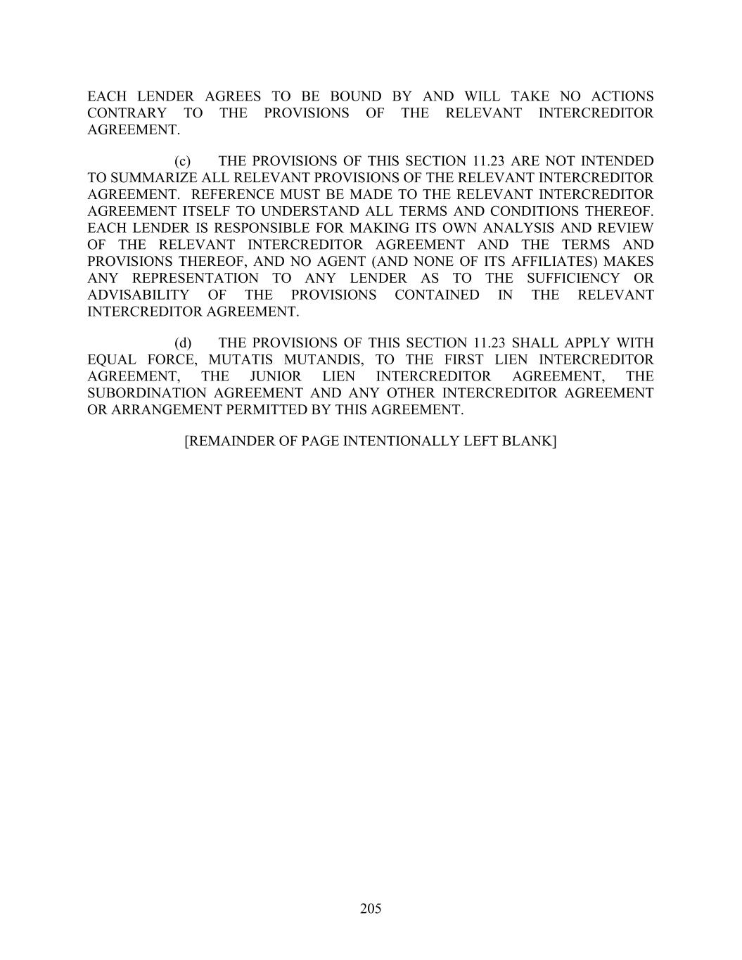 205 EACH LENDER AGREES TO BE BOUND BY AND WILL TAKE NO ACTIONS CONTRARY TO THE PROVISIONS OF THE RELEVANT INTERCREDITOR AGREEMENT. (c) THE PROVISIONS OF THIS SECTION 11.23 ARE NOT INTENDED TO SUMMARIZE ALL RELEVANT PROVISIONS OF THE RELEVANT INTERCREDITOR AGREEMENT. REFERENCE MUST BE MADE TO THE RELEVANT INTERCREDITOR AGREEMENT ITSELF TO UNDERSTAND ALL TERMS AND CONDITIONS THEREOF. EACH LENDER IS RESPONSIBLE FOR MAKING ITS OWN ANALYSIS AND REVIEW OF THE RELEVANT INTERCREDITOR AGREEMENT AND THE TERMS AND PROVISIONS THEREOF, AND NO AGENT (AND NONE OF ITS AFFILIATES) MAKES ANY REPRESENTATION TO ANY LENDER AS TO THE SUFFICIENCY OR ADVISABILITY OF THE PROVISIONS CONTAINED IN THE RELEVANT INTERCREDITOR AGREEMENT. (d) THE PROVISIONS OF THIS SECTION 11.23 SHALL APPLY WITH EQUAL FORCE, MUTATIS MUTANDIS, TO THE FIRST LIEN INTERCREDITOR AGREEMENT, THE JUNIOR LIEN INTERCREDITOR AGREEMENT, THE SUBORDINATION AGREEMENT AND ANY OTHER INTERCREDITOR AGREEMENT OR ARRANGEMENT PERMITTED BY THIS AGREEMENT. [REMAINDER OF PAGE INTENTIONALLY LEFT BLANK]