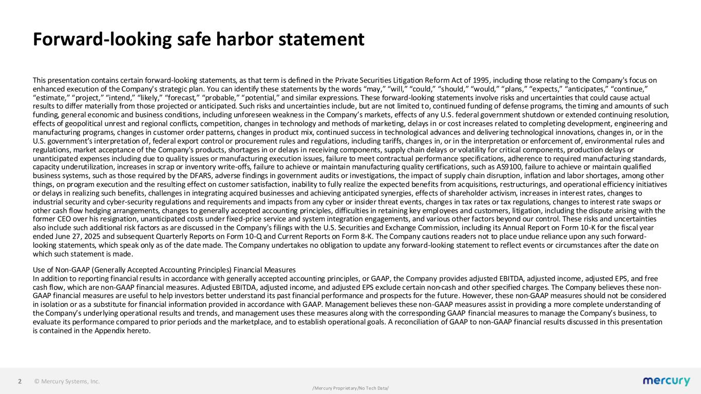 © Mercury Systems, Inc. /Mercury Proprietary/No Tech Data/ Forward-looking safe harbor statement This presentation contains certain forward-looking statements, as that term is defined in the Private Securities Litigation Reform Act of 1995, including those relating to the Company's focus on enhanced execution of the Company's strategic plan. You can identify these statements by the words “may,” “will,” “could,” “should,” “would,” “plans,” “expects,” “anticipates,” “continue,” “estimate,” “project,” “intend,” “likely,” “forecast,” “probable,” “potential,” and similar expressions. These forward-looking statements involve risks and uncertainties that could cause actual results to differ materially from those projected or anticipated. Such risks and uncertainties include, but are not limited to, continued funding of defense programs, the timing and amounts of such funding, general economic and business conditions, including unforeseen weakness in the Company’s markets, effects of any U.S. federal government shutdown or extended continuing resolution, effects of geopolitical unrest and regional conflicts, competition, changes in technology and methods of marketing, delays in or cost increases related to completing development, engineering and manufacturing programs, changes in customer order patterns, changes in product mix, continued success in technological advances and delivering technological innovations, changes in, or in the U.S. government’s interpretation of, federal export control or procurement rules and regulations, including tariffs, changes in, or in the interpretation or enforcement of, environmental rules and regulations, market acceptance of the Company's products, shortages in or delays in receiving components, supply chain delays or volatility for critical components, production delays or unanticipated expenses including due to quality issues or manufacturing execution issues, failure to meet contractual performance specifications, adherence to required manufacturing standards, capacity underutilization, increases in scrap or inventory write-offs, failure to achieve or maintain manufacturing quality certifications, such as AS9100, failure to achieve or maintain qualified business systems, such as those required by the DFARS, adverse findings in government audits or investigations, the impact of supply chain disruption, inflation and labor shortages, among other things, on program execution and the resulting effect on customer satisfaction, inability to fully realize the expected benefits from acquisitions, restructurings, and operational efficiency initiatives or delays in realizing such benefits, challenges in integrating acquired businesses and achieving anticipated synergies, effects of shareholder activism, increases in interest rates, changes to industrial security and cyber-security regulations and requirements and impacts from any cyber or insider threat events, changes in tax rates or tax regulations, changes to interest rate swaps or other cash flow hedging arrangements, changes to generally accepted accounting principles, difficulties in retaining key employees and customers, litigation, including the dispute arising with the former CEO over his resignation, unanticipated costs under fixed-price service and system integration engagements, and various other factors beyond our control. These risks and uncertainties also include such additional risk factors as are discussed in the Company's filings with the U.S. Securities and Exchange Commission, including its Annual Report on Form 10-K for the fiscal year ended June 27, 2025 and subsequent Quarterly Reports on Form 10-Q and Current Reports on Form 8-K. The Company cautions readers not to place undue reliance upon any such forward- looking statements, which speak only as of the date made. The Company undertakes no obligation to update any forward-looking statement to reflect events or circumstances after the date on which such statement is made. Use of Non-GAAP (Generally Accepted Accounting Principles) Financial Measures In addition to reporting financial results in accordance with generally accepted accounting principles, or GAAP, the Company provides adjusted EBITDA, adjusted income, adjusted EPS, and free cash flow, which are non-GAAP financial measures. Adjusted EBITDA, adjusted income, and adjusted EPS exclude certain non-cash and other specified charges. The Company believes these non- GAAP financial measures are useful to help investors better understand its past financial performance and prospects for the future. However, these non-GAAP measures should not be considered in isolation or as a substitute for financial information provided in accordance with GAAP. Management believes these non-GAAP measures assist in providing a more complete understanding of the Company’s underlying operational results and trends, and management uses these measures along with the corresponding GAAP financial measures to manage the Company’s business, to evaluate its performance compared to prior periods and the marketplace, and to establish operational goals. A reconciliation of GAAP to non-GAAP financial results discussed in this presentation is contained in the Appendix hereto. 2