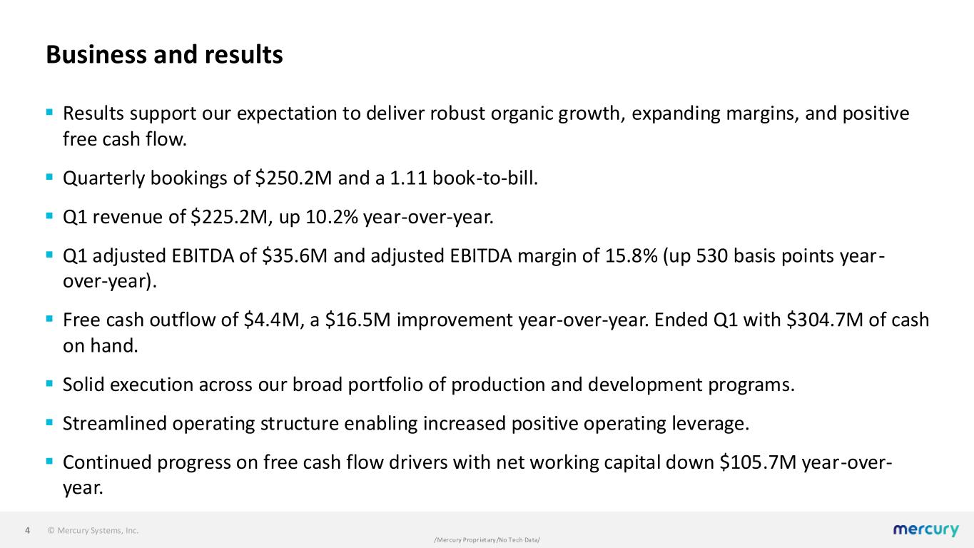 © Mercury Systems, Inc. /Mercury Proprietary/No Tech Data/ Today’s call ▪ Opening remarks on business and results ▪ Update on our four priorities ▪ Performance expectations for FY26 and beyond ▪ Q&A 3