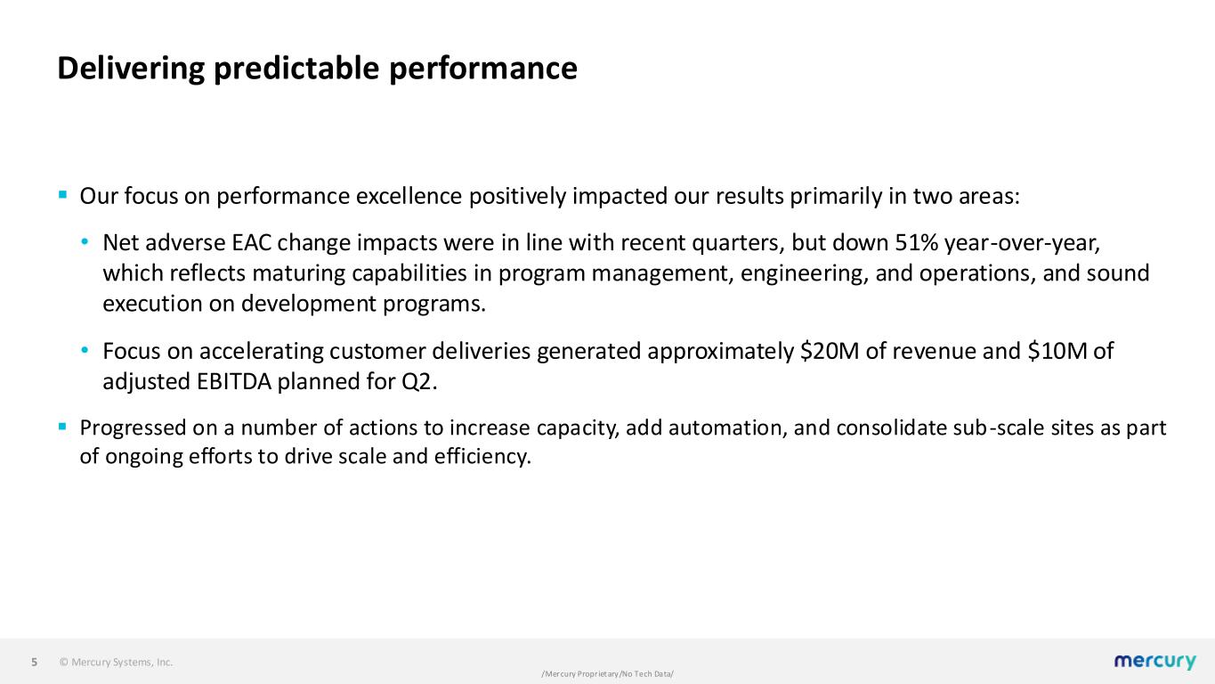 © Mercury Systems, Inc. /Mercury Proprietary/No Tech Data/ Business and results ▪ Results support our expectation to deliver robust organic growth, expanding margins, and positive free cash flow. ▪ Quarterly bookings of $250.2M and a 1.11 book-to-bill. ▪ Q1 revenue of $225.2M, up 10.2% year-over-year. ▪ Q1 adjusted EBITDA of $35.6M and adjusted EBITDA margin of 15.8% (up 530 basis points year- over-year). ▪ Free cash outflow of $4.4M, a $16.5M improvement year-over-year. Ended Q1 with $304.7M of cash on hand. ▪ Solid execution across our broad portfolio of production and development programs. ▪ Streamlined operating structure enabling increased positive operating leverage. ▪ Continued progress on free cash flow drivers with net working capital down $105.7M year-over- year. 4