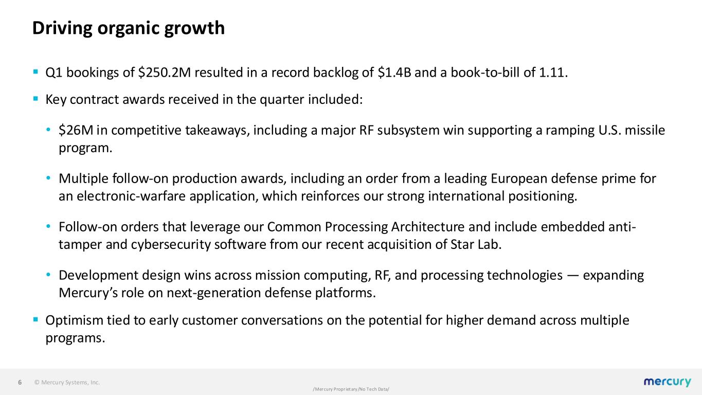 © Mercury Systems, Inc. /Mercury Proprietary/No Tech Data/ Delivering predictable performance ▪ Our focus on performance excellence positively impacted our results primarily in two areas: • Net adverse EAC change impacts were in line with recent quarters, but down 51% year-over-year, which reflects maturing capabilities in program management, engineering, and operations, and sound execution on development programs. • Focus on accelerating customer deliveries generated approximately $20M of revenue and $10M of adjusted EBITDA planned for Q2. ▪ Progressed on a number of actions to increase capacity, add automation, and consolidate sub-scale sites as part of ongoing efforts to drive scale and efficiency. 5