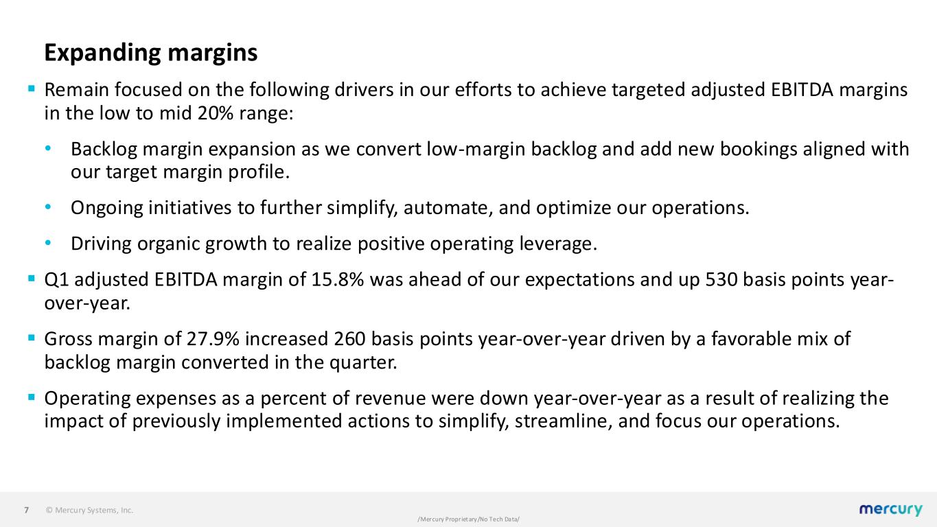 © Mercury Systems, Inc. /Mercury Proprietary/No Tech Data/ Driving organic growth ▪ Q1 bookings of $250.2M resulted in a record backlog of $1.4B and a book-to-bill of 1.11. ▪ Key contract awards received in the quarter included: • $26M in competitive takeaways, including a major RF subsystem win supporting a ramping U.S. missile program. • Multiple follow-on production awards, including an order from a leading European defense prime for an electronic-warfare application, which reinforces our strong international positioning. • Follow-on orders that leverage our Common Processing Architecture and include embedded anti- tamper and cybersecurity software from our recent acquisition of Star Lab. • Development design wins across mission computing, RF, and processing technologies — expanding Mercury’s role on next-generation defense platforms. ▪ Optimism tied to early customer conversations on the potential for higher demand across multiple programs. 6