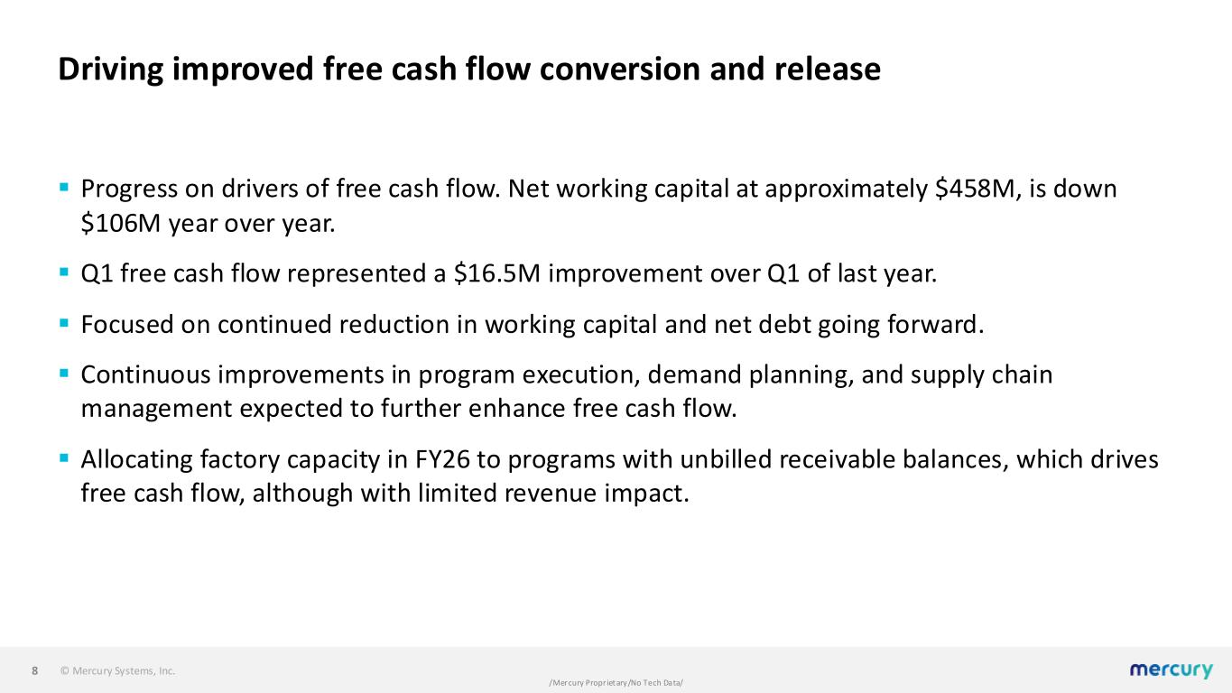 © Mercury Systems, Inc. /Mercury Proprietary/No Tech Data/ Expanding margins ▪ Remain focused on the following drivers in our efforts to achieve targeted adjusted EBITDA margins in the low to mid 20% range: • Backlog margin expansion as we convert low-margin backlog and add new bookings aligned with our target margin profile. • Ongoing initiatives to further simplify, automate, and optimize our operations. • Driving organic growth to realize positive operating leverage. ▪ Q1 adjusted EBITDA margin of 15.8% was ahead of our expectations and up 530 basis points year- over-year. ▪ Gross margin of 27.9% increased 260 basis points year-over-year driven by a favorable mix of backlog margin converted in the quarter. ▪ Operating expenses as a percent of revenue were down year-over-year as a result of realizing the impact of previously implemented actions to simplify, streamline, and focus our operations. 7