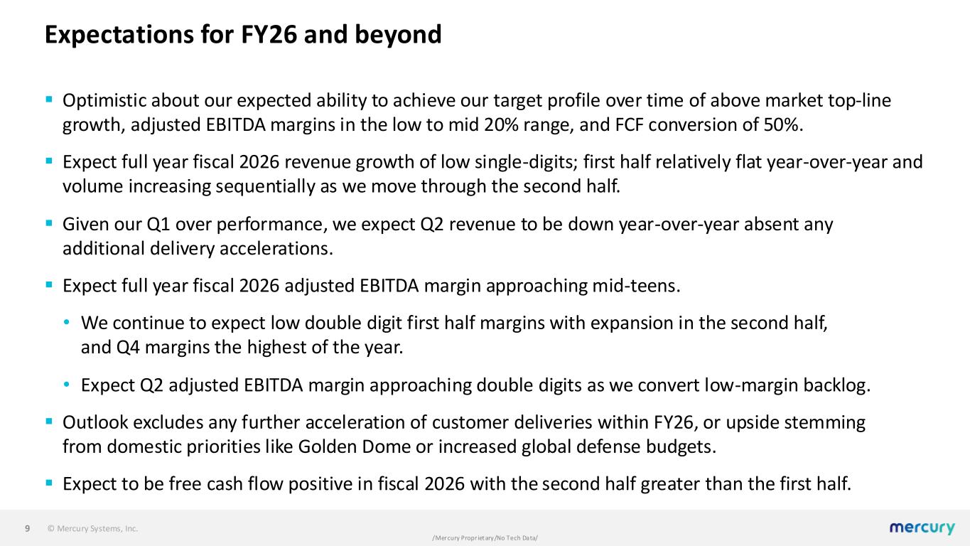 © Mercury Systems, Inc. /Mercury Proprietary/No Tech Data/ Driving improved free cash flow conversion and release ▪ Progress on drivers of free cash flow. Net working capital at approximately $458M, is down $106M year over year. ▪ Q1 free cash flow represented a $16.5M improvement over Q1 of last year. ▪ Focused on continued reduction in working capital and net debt going forward. ▪ Continuous improvements in program execution, demand planning, and supply chain management expected to further enhance free cash flow. ▪ Allocating factory capacity in FY26 to programs with unbilled receivable balances, which drives free cash flow, although with limited revenue impact. 8