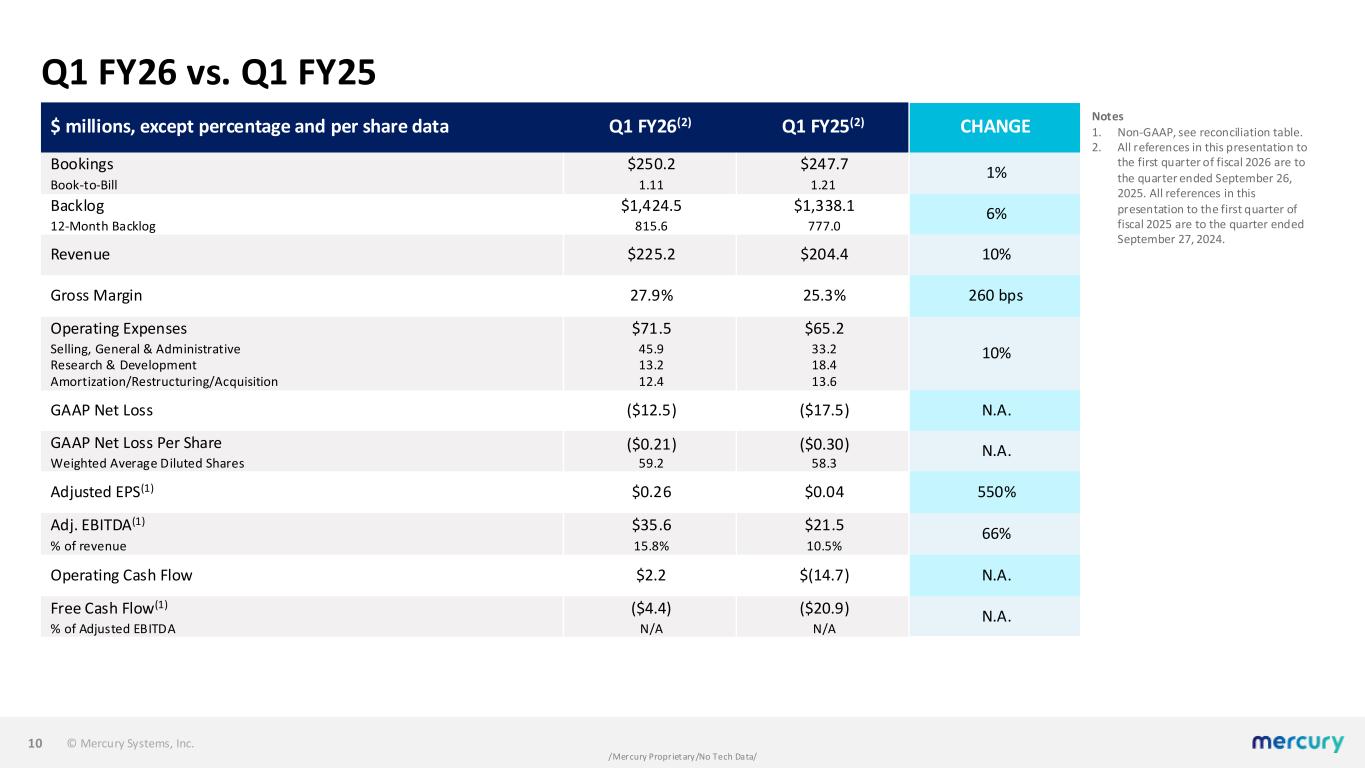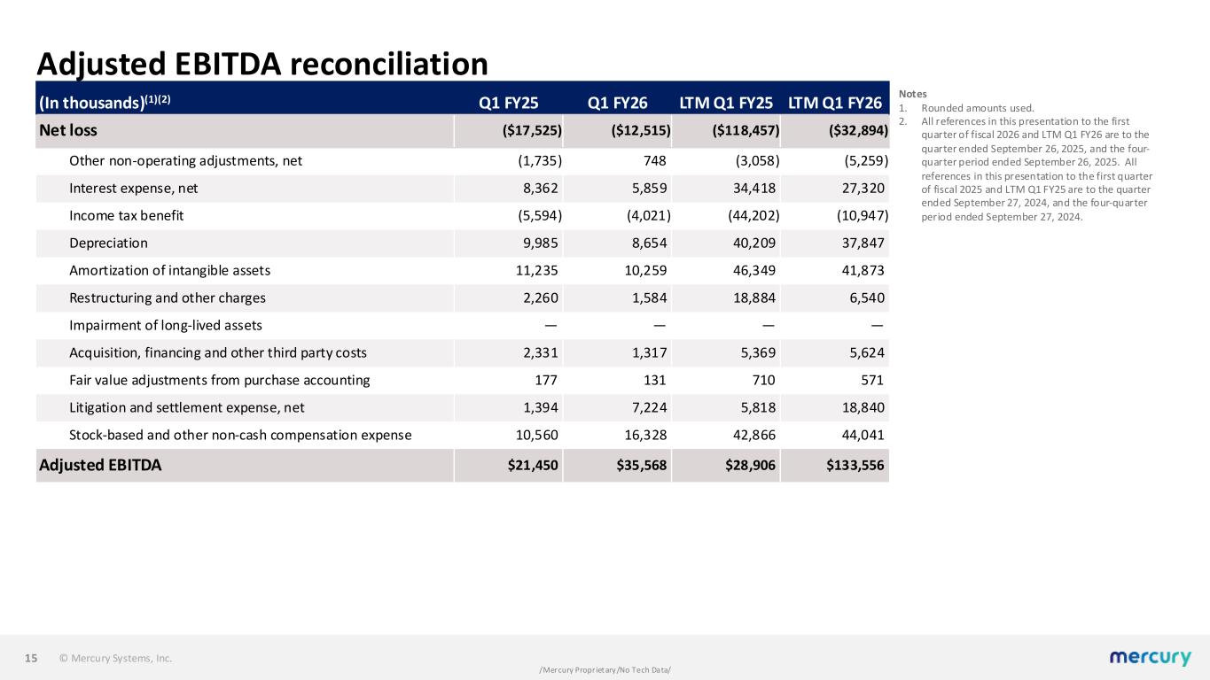 © Mercury Systems, Inc. /Mercury Proprietary/No Tech Data/ (In thousands, except per share data)(2) Q1 FY25 Q1 FY26 LTM Q1 FY25 LTM Q1 FY26 Loss per share(1) ($0.30) ($0.21) ($2.05) ($0.57) Net Loss ($17,525) ($12,515) ($118,457) ($32,894) Other non-operating adjustments, net (1,735) 748 (3,058) (5,259) Amortization of intangible assets 11,235 10,259 46,349 41,873 Restructuring and other charges 2,260 1,584 18,884 6,540 Impairment of long-lived assets — — — — Acquisition, financing and other third party costs 2,331 1,317 5,369 5,624 Fair value adjustments from purchase accounting 177 131 710 571 Litigation and settlement expense, net 1,394 7,224 5,818 18,840 Stock-based and other non-cash compensation expense 10,560 16,328 42,866 44,041 Impact to income taxes(3) (6,253) (9,516) (22,116) (28,354) Adjusted income (loss) $2,444 $15,560 ($23,635) $50,982 Adjusted earnings (loss) per share(1)(5) $0.04 $0.26 ($0.41) $0.86 Weighted-average shares outstanding: Basic 58,260 59,191 Diluted 58,585 60,140 Notes 1. Per share information is presented on a fully diluted basis.​ 2. Rounded amounts used. ​ 3. Impact to income taxes is calculated by recasting income before income taxes to include the items involved in determining adjusted income and recalculating the income tax provision using this adjusted income from operations before income taxes. The recalculation also adjusts for any discrete tax expense or benefit related to the items.​ 4. All references in this presentation to the first quarter of fiscal 2026 and LTM Q1 FY26 are to the quarter ended September 26, 2025, and the four-quarter period ended September 26, 2025. All references in this presentation to the first quarter of fiscal 2025 and LTM Q1 FY25 are to the quarter ended September 27, 2024, and the four-quarter period ended September 27, 2024.​ 5. Earnings per share and Adjusted earnings per share is calculated using diluted shares whereas loss per share and adjusted loss per share is calculated using basic shares. There was no impact to the calculation of adjusted earnings per share as a result of this for the first quarters ended September 26, 2025 and September 27, 2024. Adjusted EPS reconciliation