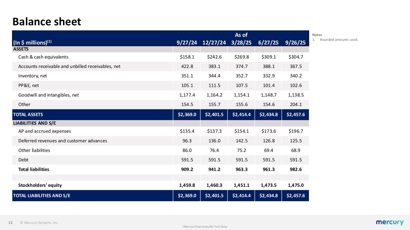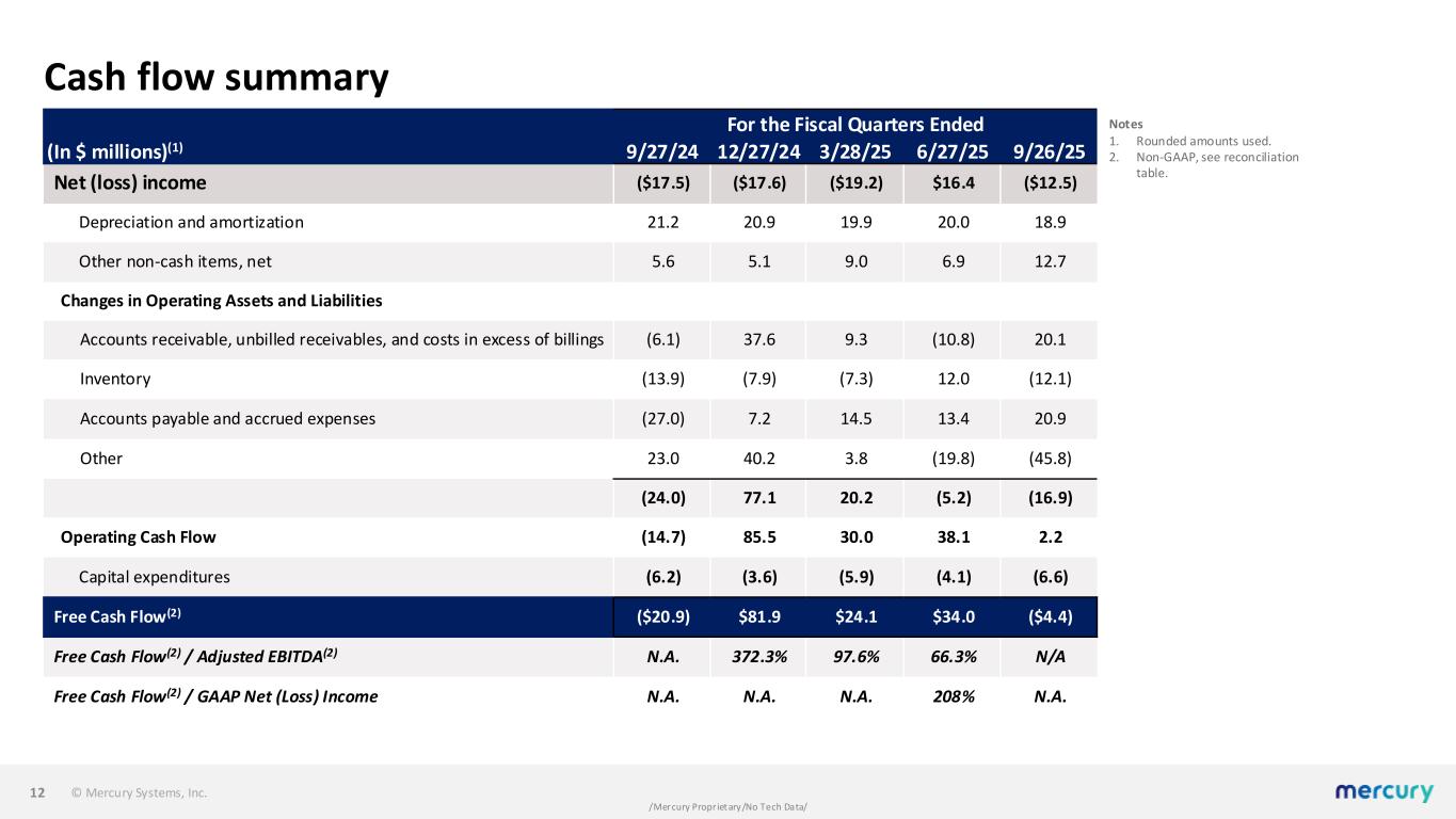 © Mercury Systems, Inc. /Mercury Proprietary/No Tech Data/ Notes 1. Rounded amounts used. Balance sheet 11 As of (In $ millions)(1) 9/27/24 12/27/24 3/28/25 6/27/25 9/26/25 ASSETS Cash & cash equivalents $158.1 $242.6 $269.8 $309.1 $304.7 Accounts receivable and unbilled receivables, net 422.8 383.1 374.7 388.1 367.5 Inventory, net 351.1 344.4 352.7 332.9 340.2 PP&E, net 105.1 111.5 107.5 101.4 102.6 Goodwill and intangibles, net 1,177.4 1,164.2 1,154.1 1,148.7 1,138.5 Other 154.5 155.7 155.6 154.6 204.1 TOTAL ASSETS $2,369.0 $2,401.5 $2,414.4 $2,434.8 $2,457.6 LIABILITIES AND S/E AP and accrued expenses $135.4 $137.3 $154.1 $173.6 $196.7 Deferred revenues and customer advances 96.3 136.0 142.5 126.8 125.5 Other liabilities 86.0 76.4 75.2 69.4 68.9 Debt 591.5 591.5 591.5 591.5 591.5 Total liabilities 909.2 941.2 963.3 961.3 982.6 Stockholders' equity 1,459.8 1,460.3 1,451.1 1,473.5 1,475.0 TOTAL LIABILITIES AND S/E $2,369.0 $2,401.5 $2,414.4 $2,434.8 $2,457.6