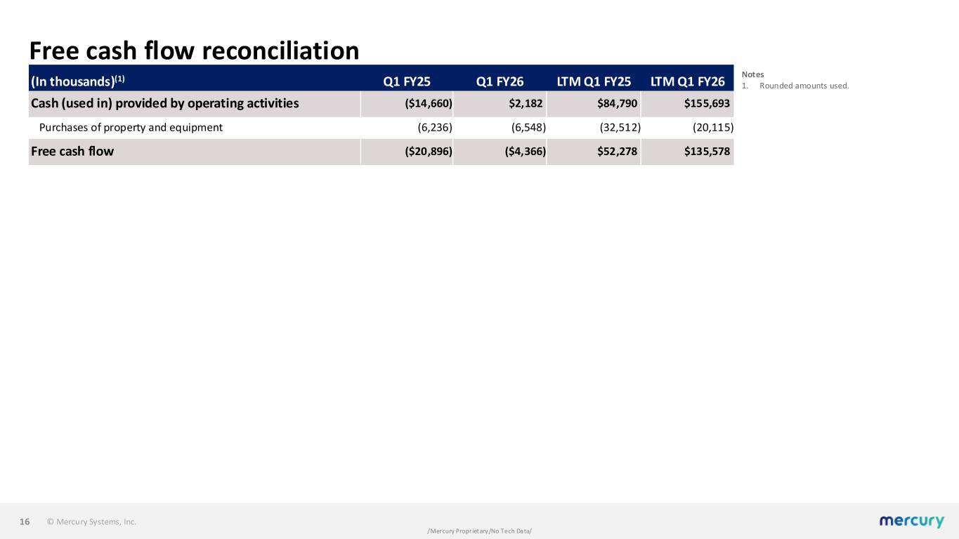 © Mercury Systems, Inc. /Mercury Proprietary/No Tech Data/ Adjusted EBITDA reconciliation 15 (In thousands)(1)(2) Q1 FY25 Q1 FY26 LTM Q1 FY25 LTM Q1 FY26 Net loss ($17,525) ($12,515) ($118,457) ($32,894) Other non-operating adjustments, net (1,735) 748 (3,058) (5,259) Interest expense, net 8,362 5,859 34,418 27,320 Income tax benefit (5,594) (4,021) (44,202) (10,947) Depreciation 9,985 8,654 40,209 37,847 Amortization of intangible assets 11,235 10,259 46,349 41,873 Restructuring and other charges 2,260 1,584 18,884 6,540 Impairment of long-lived assets — — — — Acquisition, financing and other third party costs 2,331 1,317 5,369 5,624 Fair value adjustments from purchase accounting 177 131 710 571 Litigation and settlement expense, net 1,394 7,224 5,818 18,840 Stock-based and other non-cash compensation expense 10,560 16,328 42,866 44,041 Adjusted EBITDA $21,450 $35,568 $28,906 $133,556 Notes 1. Rounded amounts used. ​ 2. All references in this presentation to the first quarter of fiscal 2026 and LTM Q1 FY26 are to the quarter ended September 26, 2025, and the four- quarter period ended September 26, 2025. All references in this presentation to the first quarter of fiscal 2025 and LTM Q1 FY25 are to the quarter ended September 27, 2024, and the four-quarter period ended September 27, 2024.​