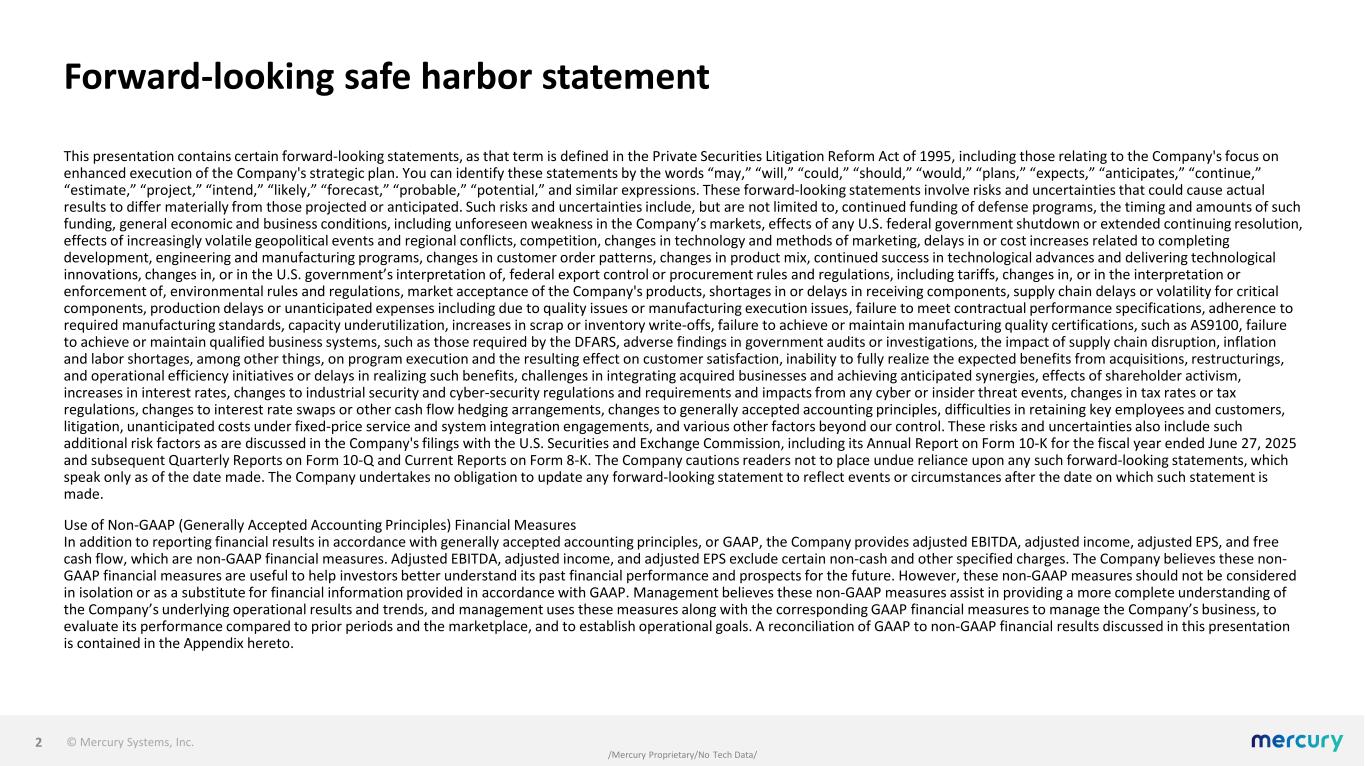 © Mercury Systems, Inc. WEBCAST LOGIN AT WWW.MRCY.COM/INVESTOR WEBCAST REPLAY AVAILABLE BY 7:00 P.M. ET FEBRUARY 3, 2026 Bill Ballhaus Chairman and CEO David Farnsworth Executive Vice President and CFO February 3, 2026, 5:00 pm ET SECOND QUARTER FISCAL YEAR 2026 FINANCIAL RESULTS 1