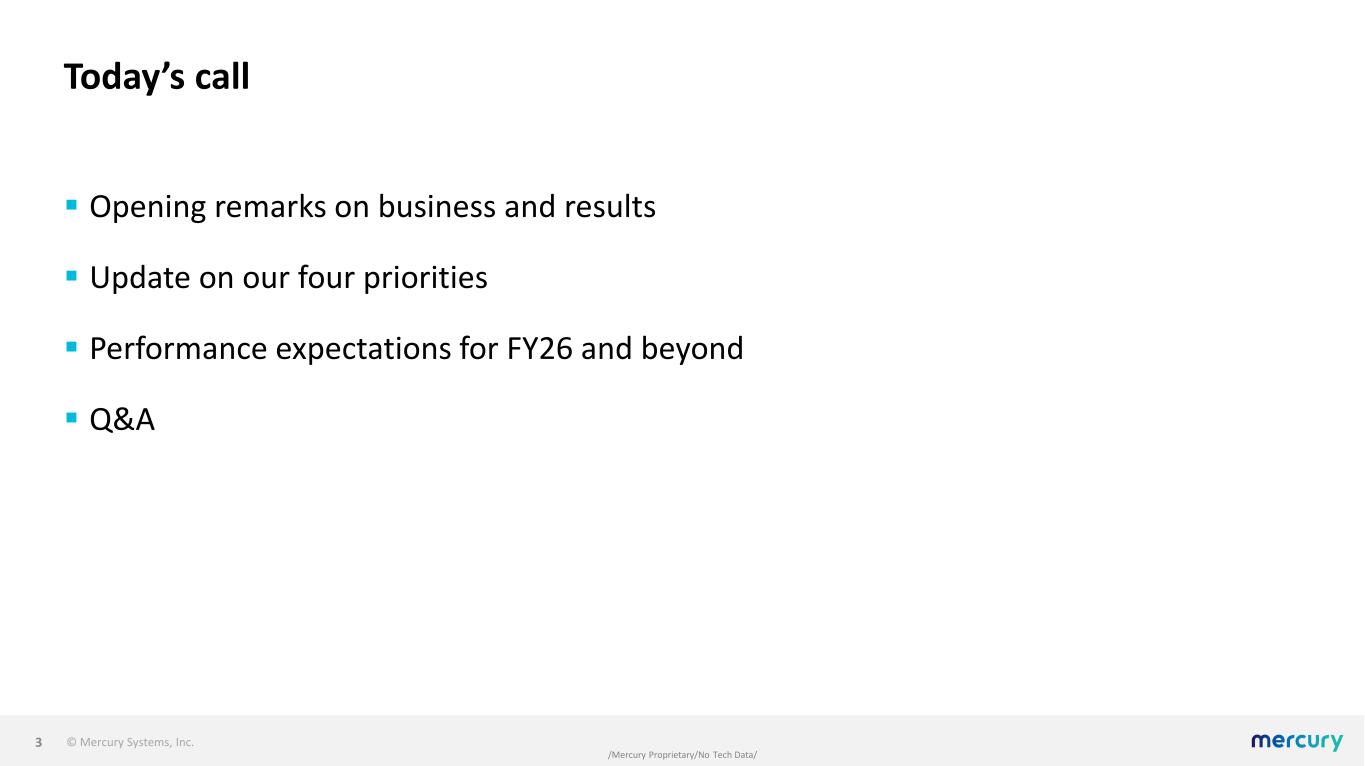 © Mercury Systems, Inc. /Mercury Proprietary/No Tech Data/ Forward-looking safe harbor statement This presentation contains certain forward-looking statements, as that term is defined in the Private Securities Litigation Reform Act of 1995, including those relating to the Company's focus on enhanced execution of the Company's strategic plan. You can identify these statements by the words “may,” “will,” “could,” “should,” “would,” “plans,” “expects,” “anticipates,” “continue,” “estimate,” “project,” “intend,” “likely,” “forecast,” “probable,” “potential,” and similar expressions. These forward-looking statements involve risks and uncertainties that could cause actual results to differ materially from those projected or anticipated. Such risks and uncertainties include, but are not limited to, continued funding of defense programs, the timing and amounts of such funding, general economic and business conditions, including unforeseen weakness in the Company’s markets, effects of any U.S. federal government shutdown or extended continuing resolution, effects of increasingly volatile geopolitical events and regional conflicts, competition, changes in technology and methods of marketing, delays in or cost increases related to completing development, engineering and manufacturing programs, changes in customer order patterns, changes in product mix, continued success in technological advances and delivering technological innovations, changes in, or in the U.S. government’s interpretation of, federal export control or procurement rules and regulations, including tariffs, changes in, or in the interpretation or enforcement of, environmental rules and regulations, market acceptance of the Company's products, shortages in or delays in receiving components, supply chain delays or volatility for critical components, production delays or unanticipated expenses including due to quality issues or manufacturing execution issues, failure to meet contractual performance specifications, adherence to required manufacturing standards, capacity underutilization, increases in scrap or inventory write-offs, failure to achieve or maintain manufacturing quality certifications, such as AS9100, failure to achieve or maintain qualified business systems, such as those required by the DFARS, adverse findings in government audits or investigations, the impact of supply chain disruption, inflation and labor shortages, among other things, on program execution and the resulting effect on customer satisfaction, inability to fully realize the expected benefits from acquisitions, restructurings, and operational efficiency initiatives or delays in realizing such benefits, challenges in integrating acquired businesses and achieving anticipated synergies, effects of shareholder activism, increases in interest rates, changes to industrial security and cyber-security regulations and requirements and impacts from any cyber or insider threat events, changes in tax rates or tax regulations, changes to interest rate swaps or other cash flow hedging arrangements, changes to generally accepted accounting principles, difficulties in retaining key employees and customers, litigation, unanticipated costs under fixed-price service and system integration engagements, and various other factors beyond our control. These risks and uncertainties also include such additional risk factors as are discussed in the Company's filings with the U.S. Securities and Exchange Commission, including its Annual Report on Form 10-K for the fiscal year ended June 27, 2025 and subsequent Quarterly Reports on Form 10-Q and Current Reports on Form 8-K. The Company cautions readers not to place undue reliance upon any such forward-looking statements, which speak only as of the date made. The Company undertakes no obligation to update any forward-looking statement to reflect events or circumstances after the date on which such statement is made. Use of Non-GAAP (Generally Accepted Accounting Principles) Financial Measures In addition to reporting financial results in accordance with generally accepted accounting principles, or GAAP, the Company provides adjusted EBITDA, adjusted income, adjusted EPS, and free cash flow, which are non-GAAP financial measures. Adjusted EBITDA, adjusted income, and adjusted EPS exclude certain non-cash and other specified charges. The Company believes these non- GAAP financial measures are useful to help investors better understand its past financial performance and prospects for the future. However, these non-GAAP measures should not be considered in isolation or as a substitute for financial information provided in accordance with GAAP. Management believes these non-GAAP measures assist in providing a more complete understanding of the Company’s underlying operational results and trends, and management uses these measures along with the corresponding GAAP financial measures to manage the Company’s business, to evaluate its performance compared to prior periods and the marketplace, and to establish operational goals. A reconciliation of GAAP to non-GAAP financial results discussed in this presentation is contained in the Appendix hereto. 2